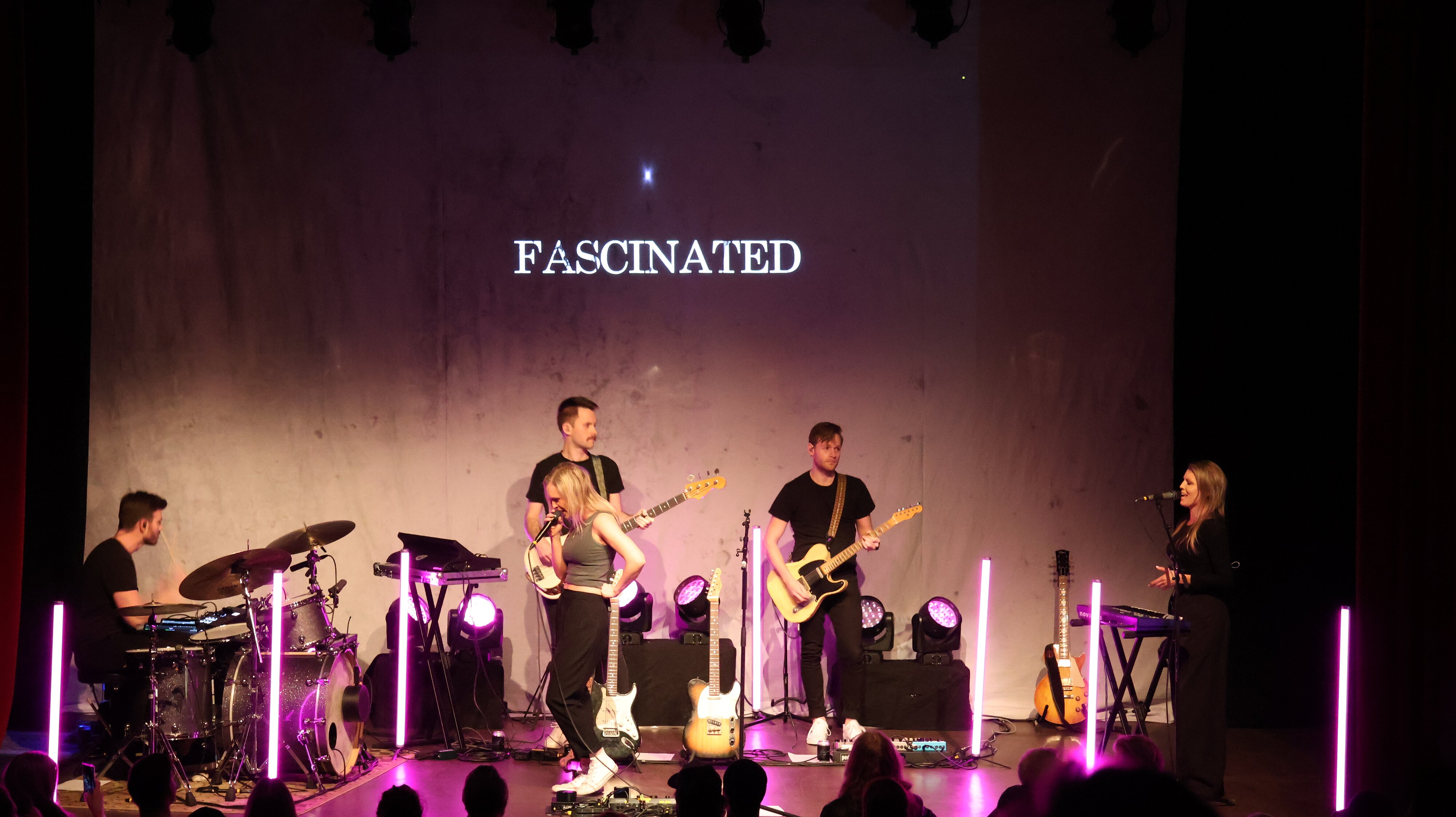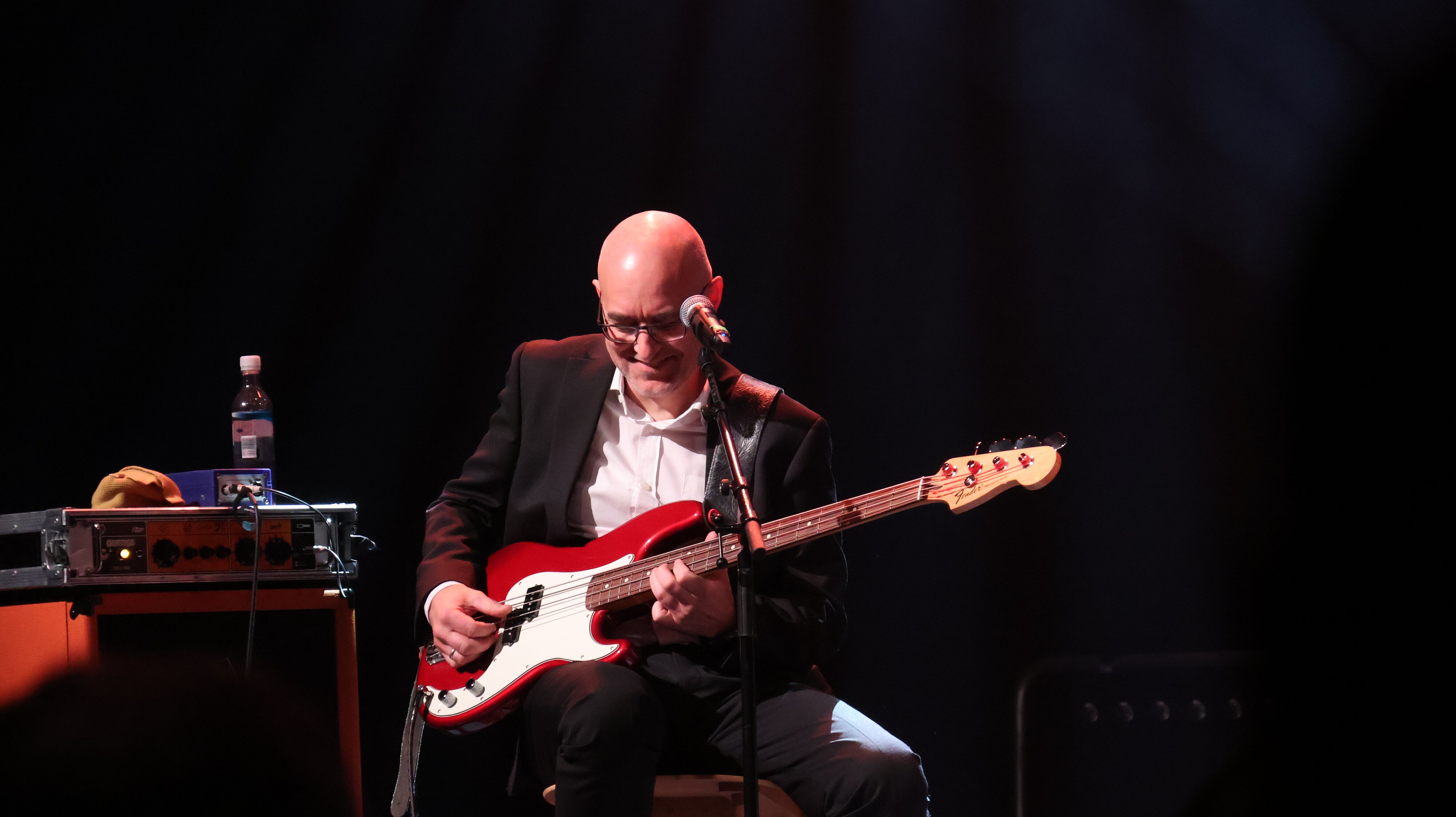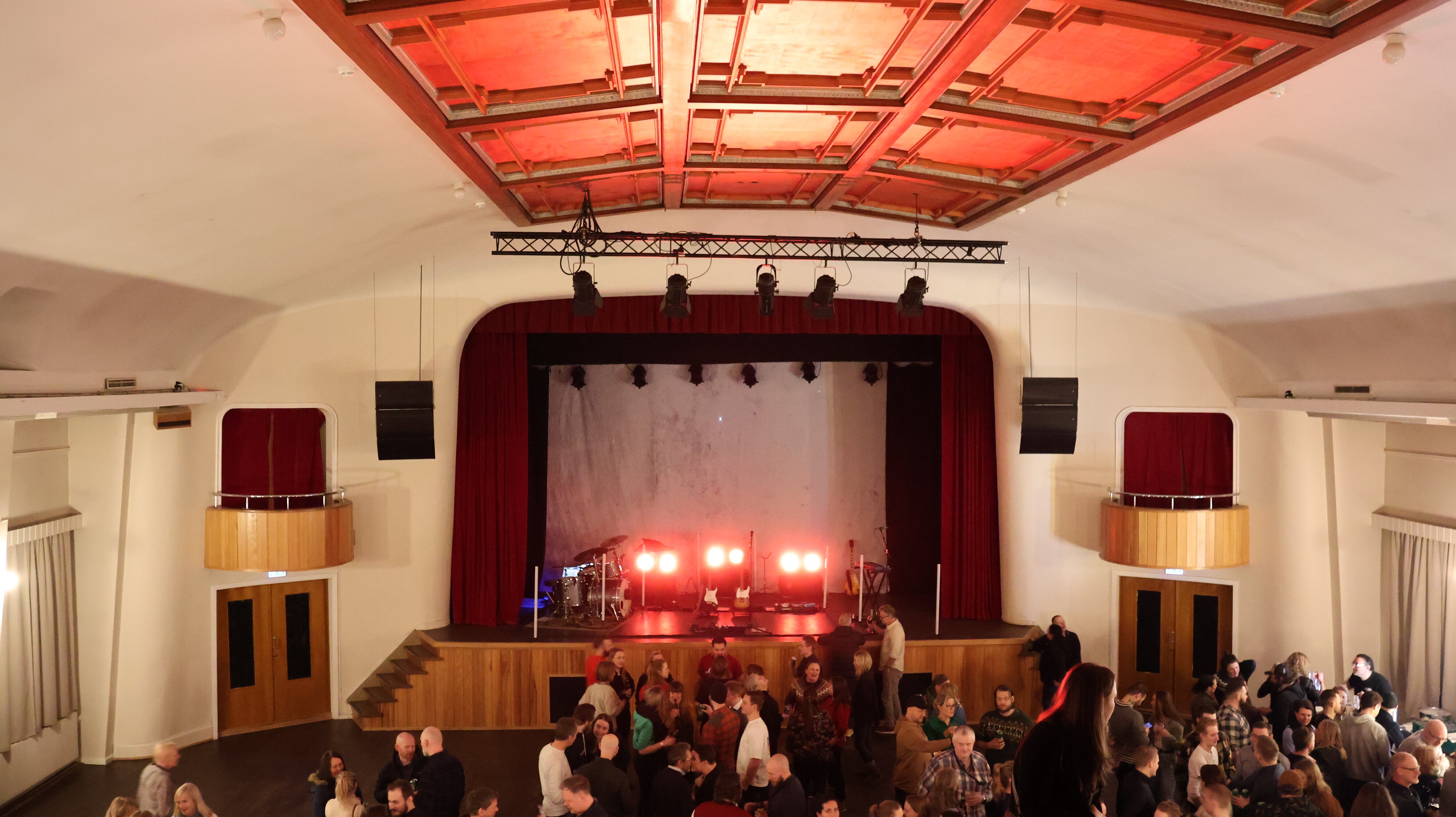 Nach Thomas Dybdal ging es mit dem bereits bereitstehenden Bus zum Huset. Dort stand eine veritable Schlange, draußen, es war ziemlich kalt und ich hatte mich auf wirklich keine längere Kälteperioden eingerichtet. Man das geht ja nicht weiter hier, wo hängt es denn? Es stellt sich heraus, der Stau ist an der Garderobe, nee echt jetzt. Ich ziehe vorbei, zeige artig mein Ticket, man hört schon wummernde Bässe, coole Mucke läuft leicht schaumgebremmst. Ich trete in einen großen Saal ein, zurückversetzt in die 70er. Blick nach hinten, aufragende Sitzreihen, das war wohl mal das Kino. Die Sitze sind nix für Leute mit langen „Gräten“, aber wurscht, was ein Ambiente, g-r-a-n-d-i-o-s.