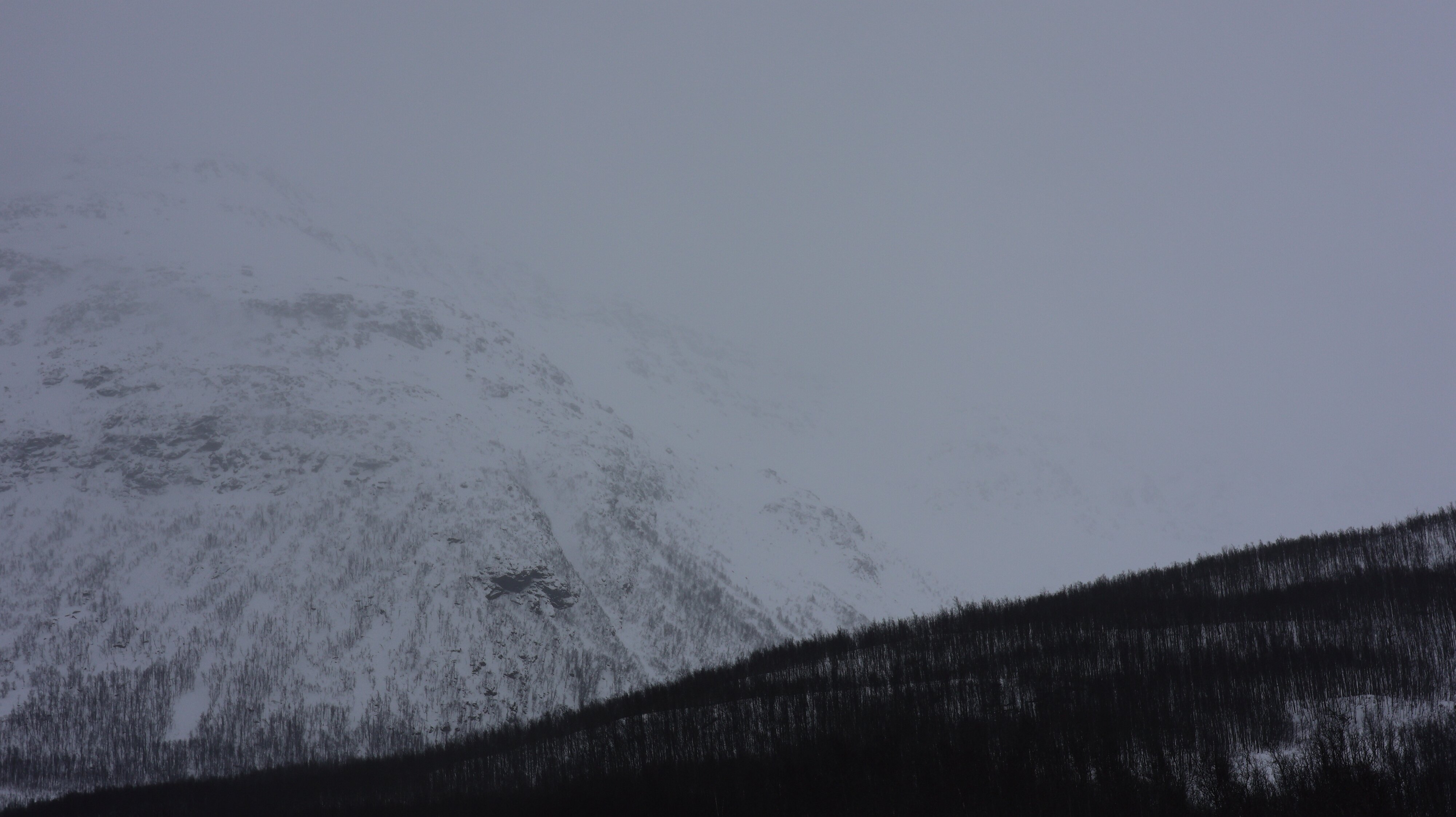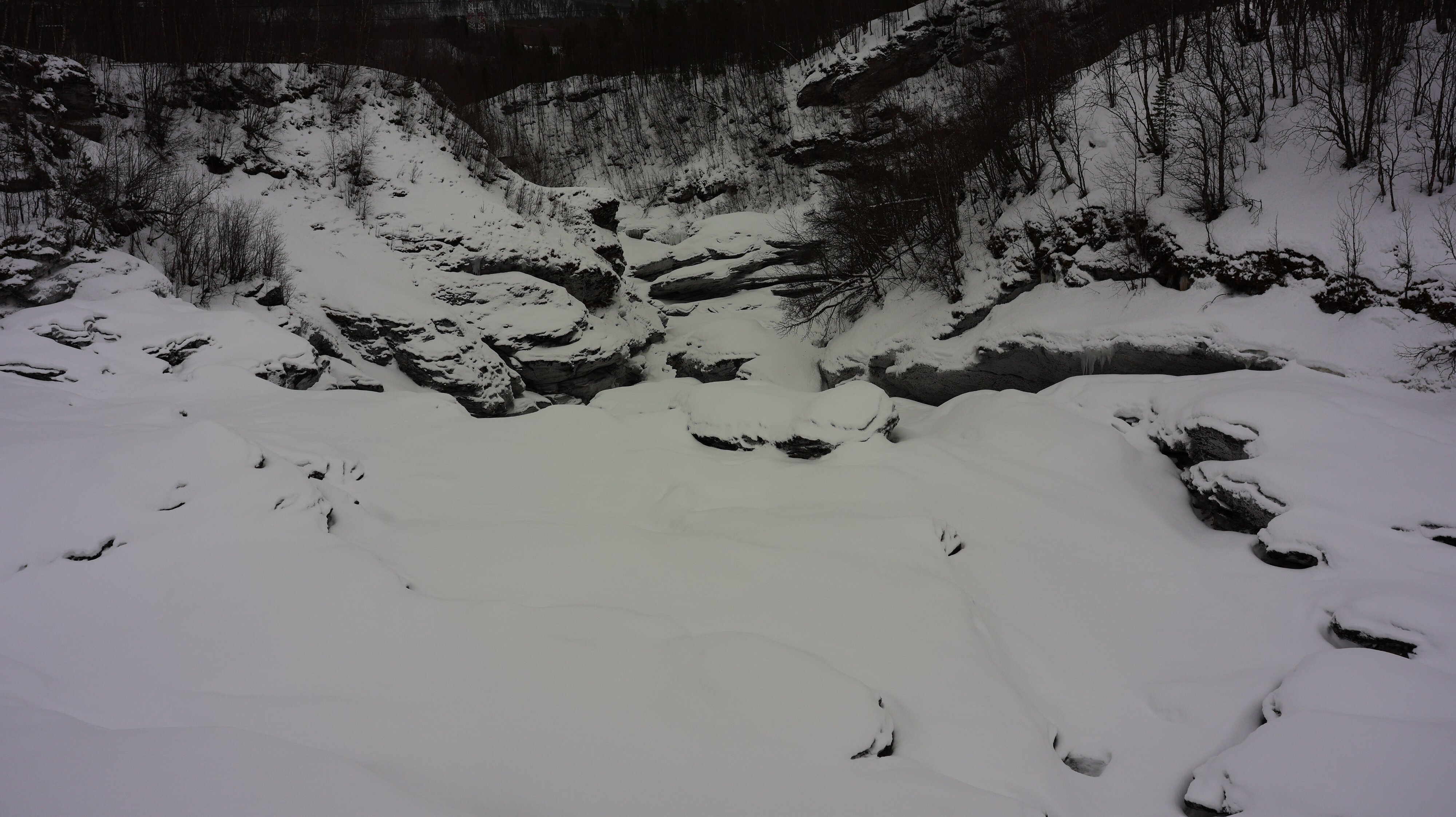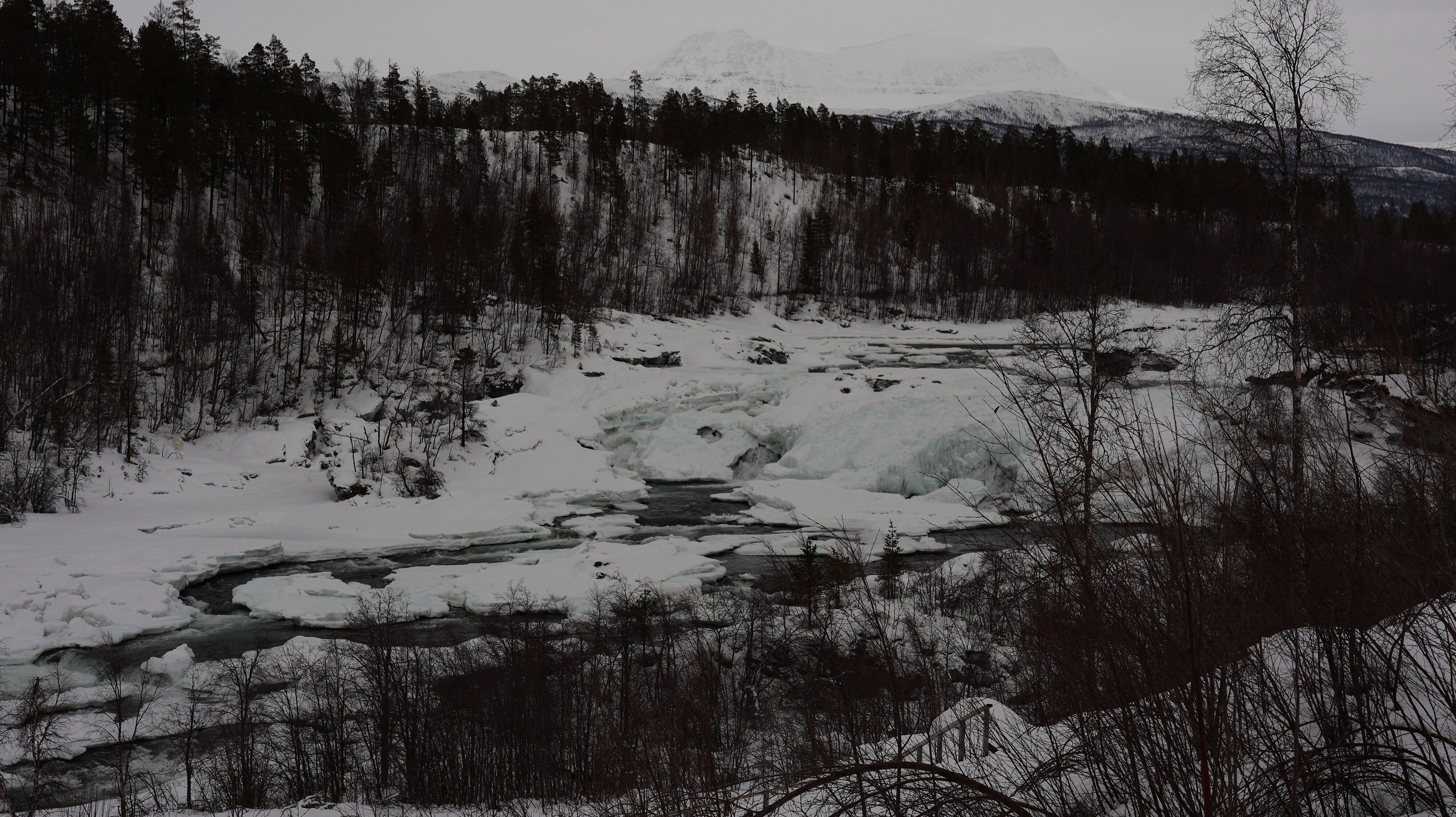 Trotzdem sehr viel Schnee lag war ein schmaler Trampelpfad begehbar und man konnte den Fall gut sehen. Hier war nicht alles gefroren und es rauschte prächtig. Der kleine Umweg hat sich auf jeden Fall gelohnt. Damit waren die Attraktionen für den heutigen Tag aber auch schon abgehakt. Selbst einen kurzen Spaziergang auf der Hålogalandsbrua habe ich mir geschenkt, zu stürmisch aber vor allen Dingen der Regen, nee Danke. Außerdem hatte ich noch eine hübsche Strecke vor mir, und bei den Witterungsverhältnissen würde das nicht lustiger werden.