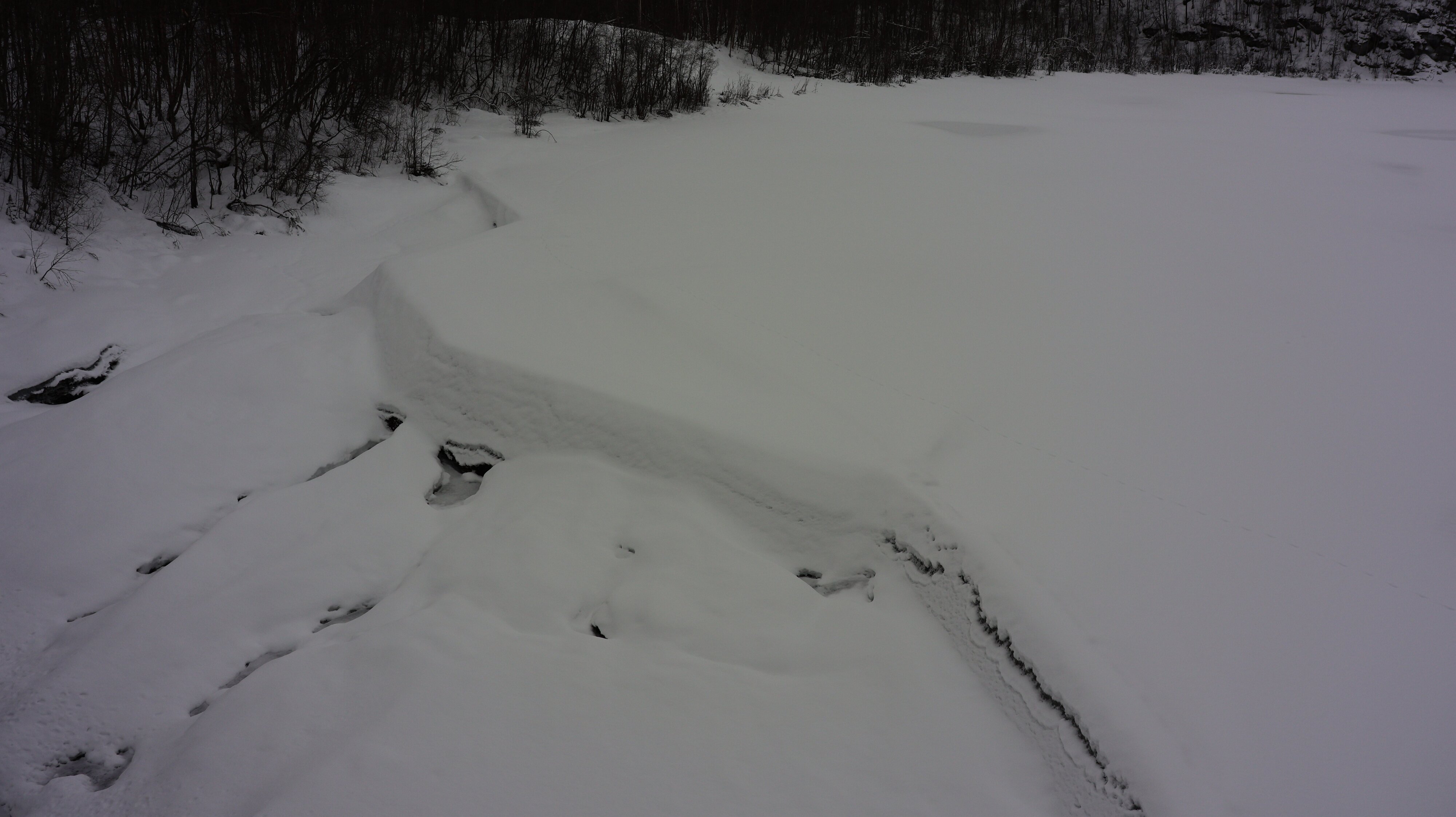 Der Bardufoss war wie erwartet im Winterschlaf, trotz der milden Temperaturen alles eingefroren und mit reichlich Schnee garniert. Wenn er in Betrieb ist sicherlich eine imposante Erscheinung. Dann weiter zum Målselvfossen. Sobald man die [E6] verlassen hatte war die Straße mit einer geschlossenen Schneedecke versehen. Darauf lies sich wunderbar fahren. Die Abfahrt zum Målselvfossen hatte ich glatt übersehen, von der Nebenstraße ging noch mal ein Seitenweg ab, der war aber nicht minder breit und ebenso perfekt präpariert.