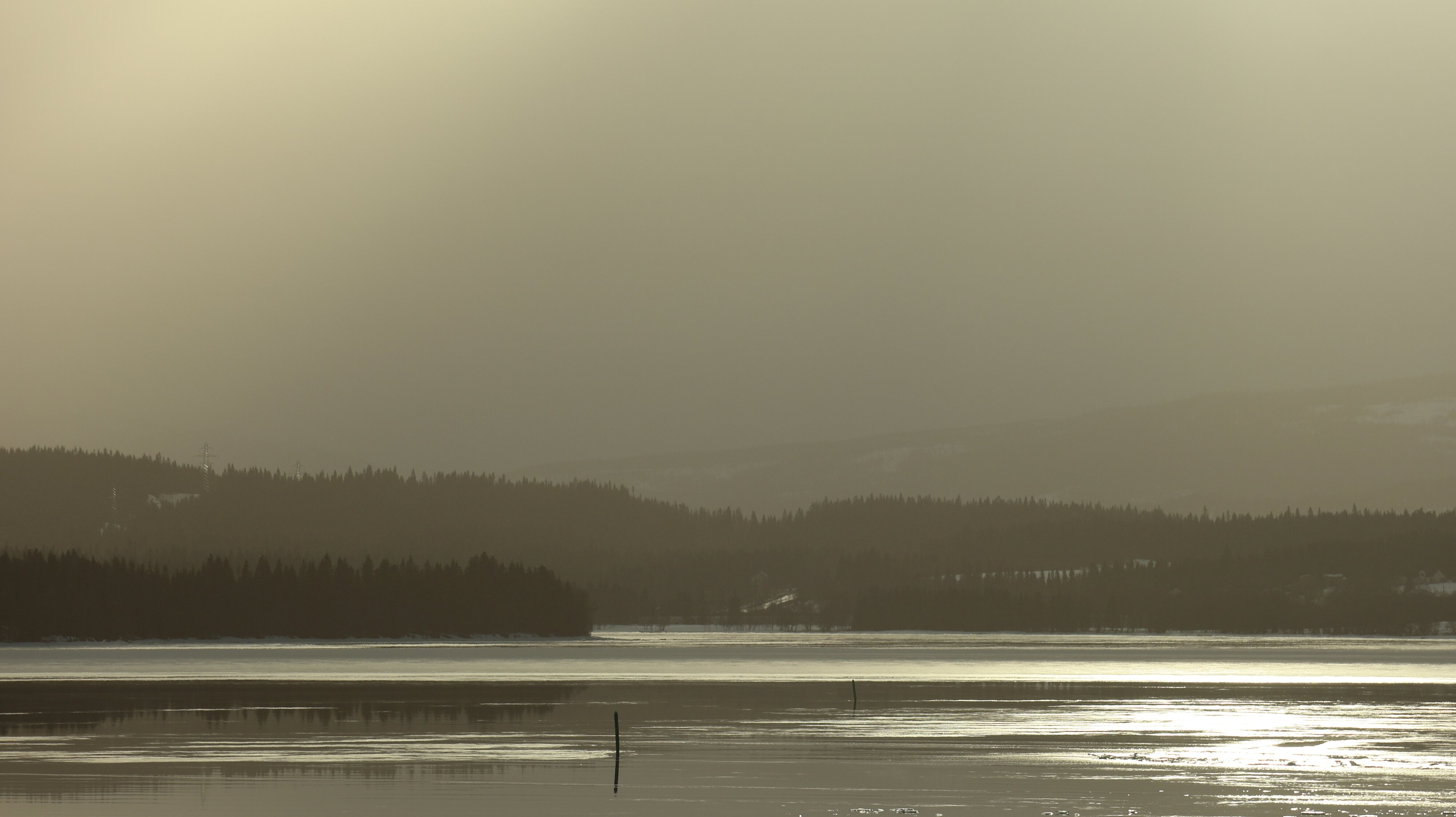 Noch bei der Auffahrt sinkt das Thermometer dann etwas und bleibt bei 0 °C stehen als ich die Hochebene erreiche, kälter wird es heute nicht werden. Der Regen ist mittlerweile in Schnee übergegangen. Die Straße ist gut geräumt, auf meiner Seite liegt etwas mehr, es ist leicht matschig, das fährt sich nicht wirklich fein. Die maximal erlaubten 90 km/h reize ich nicht aus, es weht ein heftiges Stürmchen. Zum Aussteigen lädt das Wetter nicht ein, so passiere ich auch den Polarkreis ohne Halt.