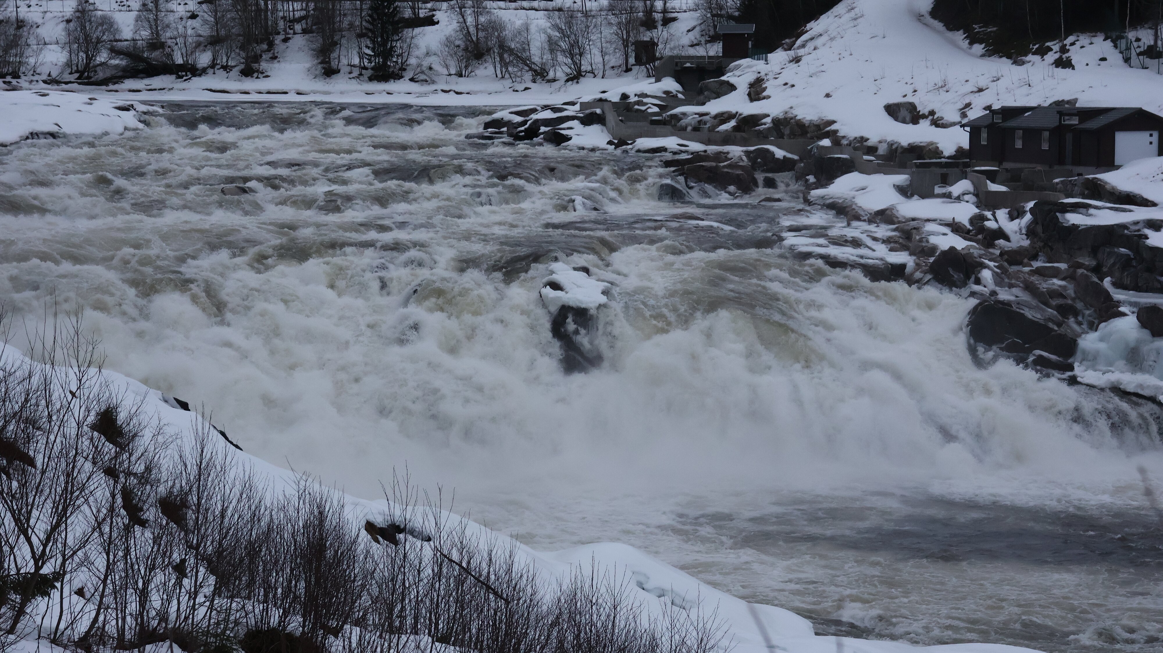 Am Frühstück gab es nichts zu bemängeln. Bei der Abfahrt hat es nicht geregnet, es waren +5 °C. Das Wetter gab sich durchaus gnädig, es fisselte manchmal, aber keine Sturzbäche wie die letzten Tage. Die Temperaturen bewegten sich durchaus auf den Gefrierpunkt runter, kurz waren auch mal -1 °C zu erspähen. Der Laksforsen sprudelte in voller Pracht, er war nicht zugefroren. Den direkt am Fall liegenden Touristbetrieb kann man übrigens für schlanke 12.000.000 NOK erwerben, der jetzige Inhaber geht wohl in Rente. Tja, ob das ein einträgliches Geschäft ist? Laut Info im Internet ist der Betrieb nur zwei Monate im Jahr geöffnet. Da den Jahresumsatz/Gewinn einzufahren, klingt wie ein schwieriges Unterfangen.