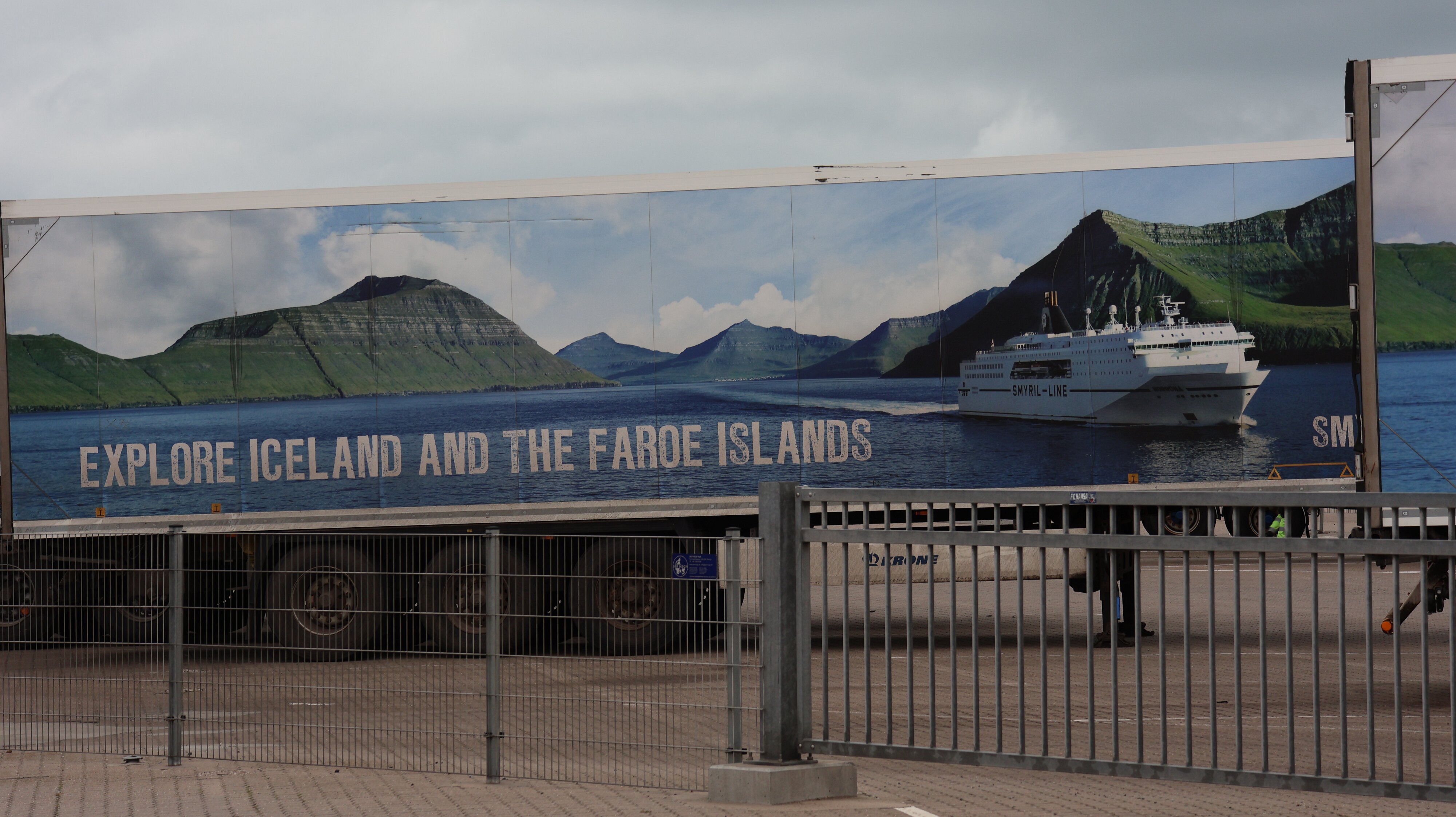 In Hirtshals hatte ich die Zeit genutzt und habe mir eine Regenhose und -Jacke gekauft. Und es blieb noch Zeit eine sehr leckere Kürbiscremesuppe zu essen. Als ich aus dem Café raus ging hatte ich eine nette und witzige Begegnung. Ein Pärchen ging gerade über die Straße und die Frau sprach mich treffsicher auf Englisch an und wollte wissen, ob ich da gerade was gegessen habe, ich bejahte und sagte „The soup was good“, sie verstand „… was super good“, ich korrigierte noch mal. Dann hob sie den einen Arm in die Luft und fragte ob ich das auch machen kann, ich dachte, ok, die ist irgendwie nett, das Spiel mache ich mit, stellte meine Tüte mit den Klamotten ab und fragte was ich mit dem anderen Arm machen soll und sie hob ihren auch in die Höhe, ich nahm meinen auch hoch und dann kam sie langsam auf mich zu und umarmte mich. Die Welt ist doch irgendwie nicht so böse. Dann fragte sie, was ich hier so mache und ich sagte ich fahre gleich mit der Fähre nach Ísland. „Nein!?“, nach Ísland, hier kann man mit der Fähre nach Ísland fahren? Und dann der Knaller, es stellte sich heraus die beiden sind Norweger und sind mit der Fähre von Kristiansand nach Hirtshals gefahren. Die Smyril Line kannten sie auch nicht. Verrückt.