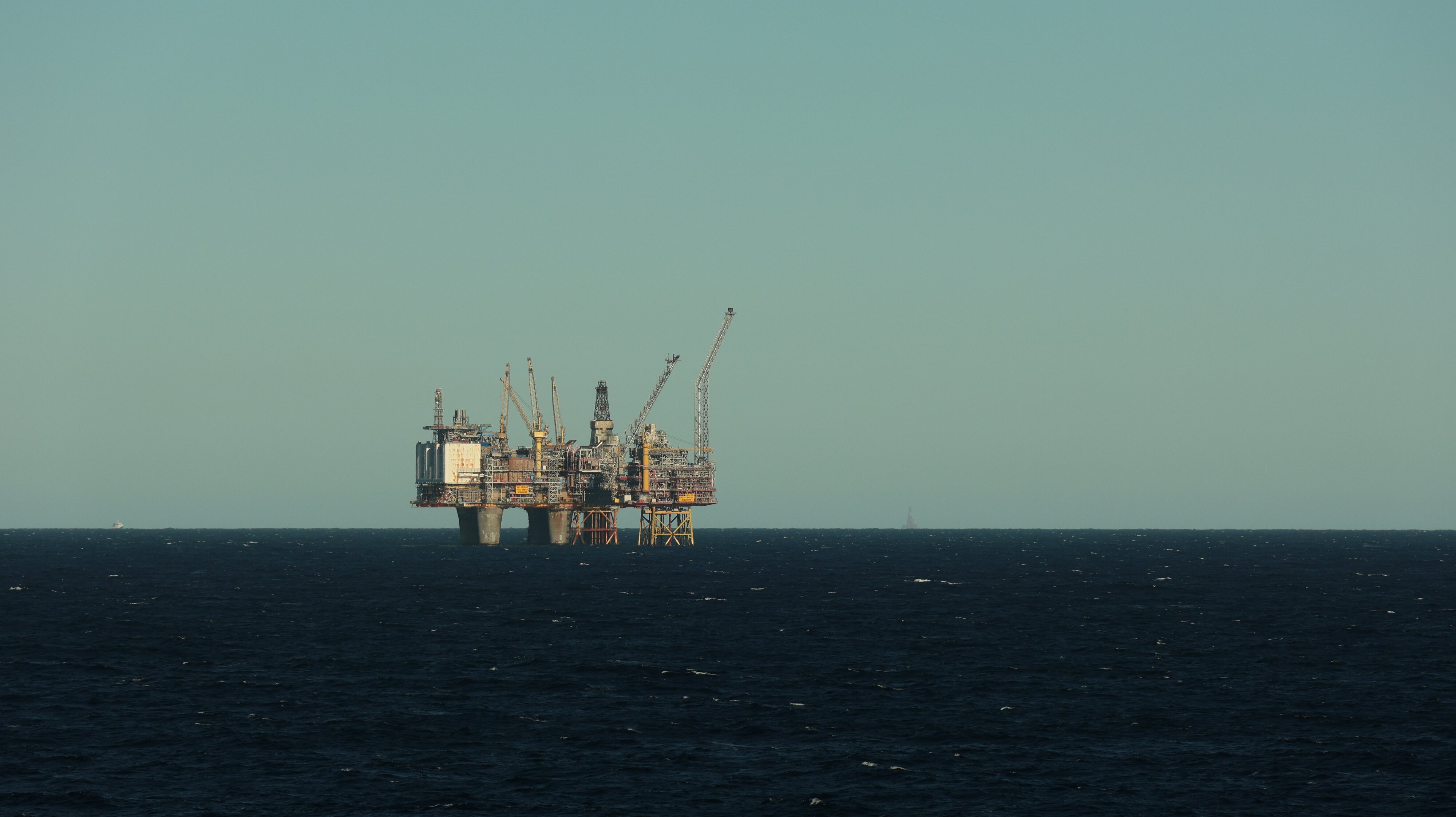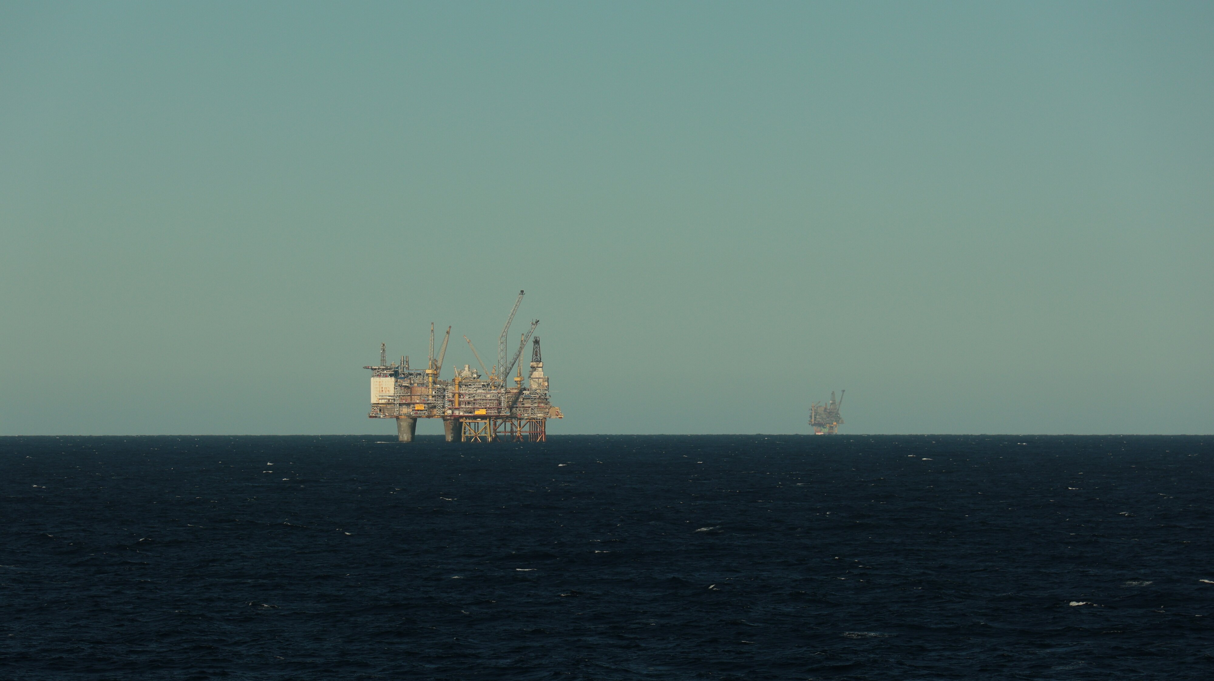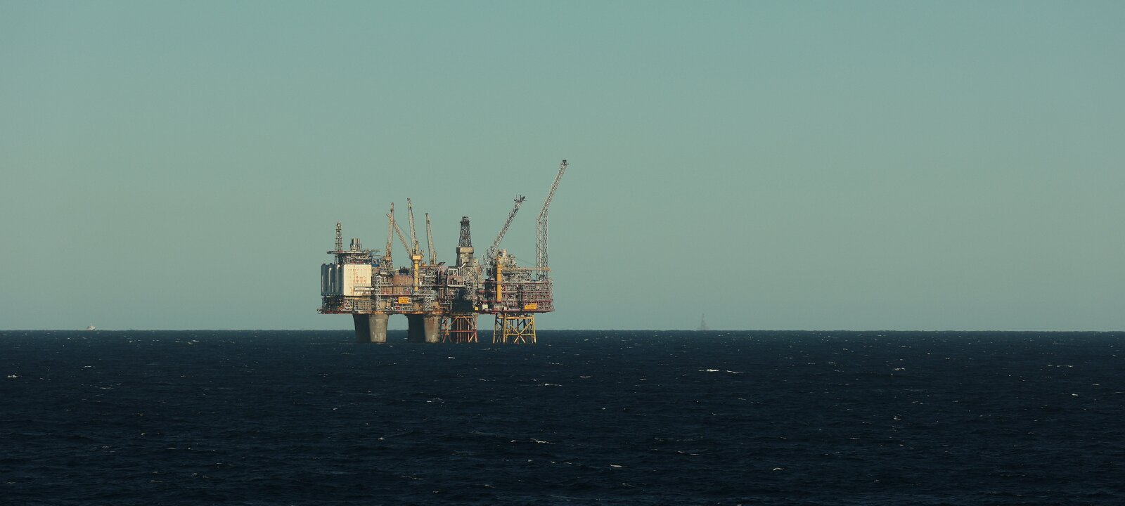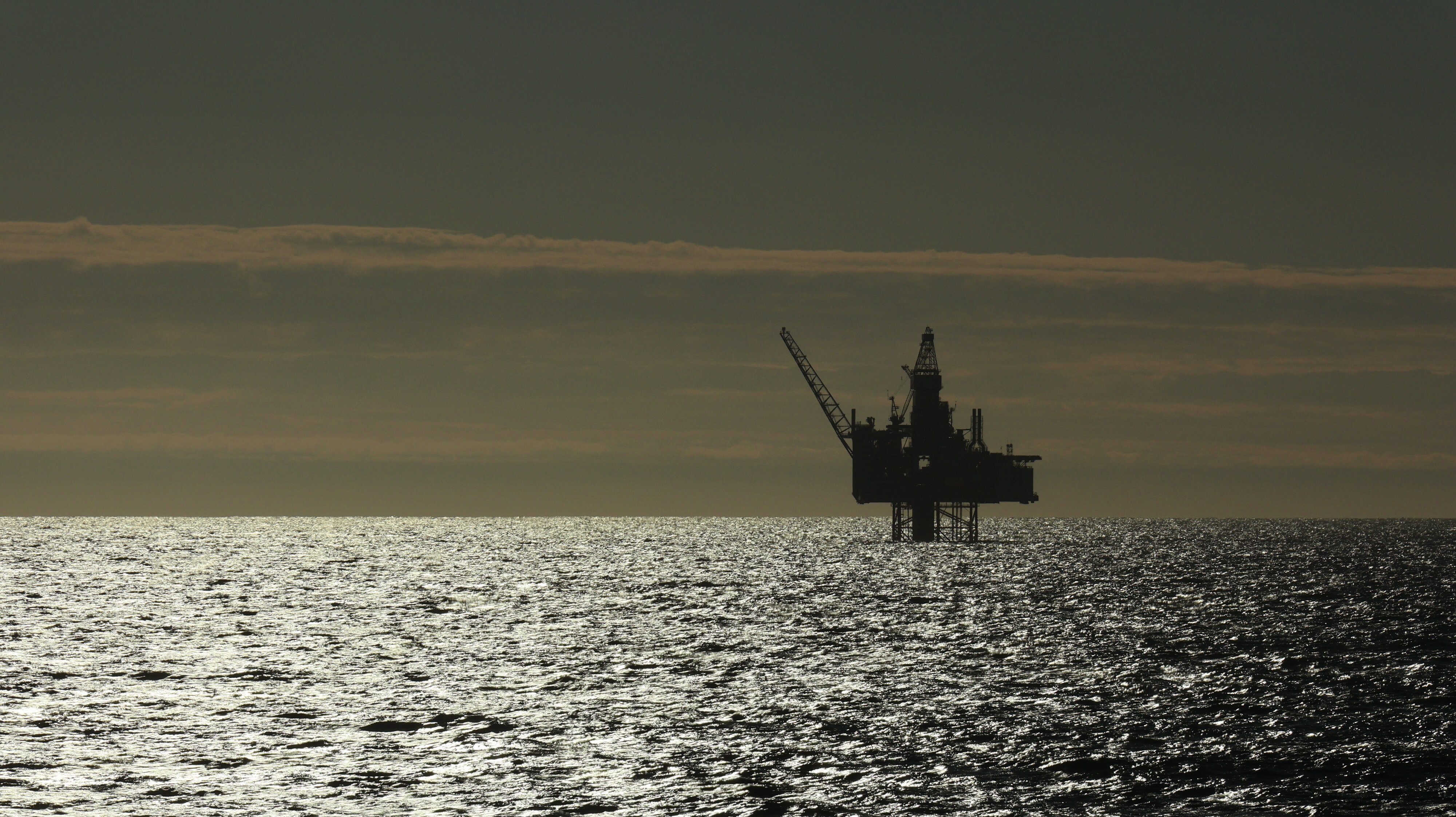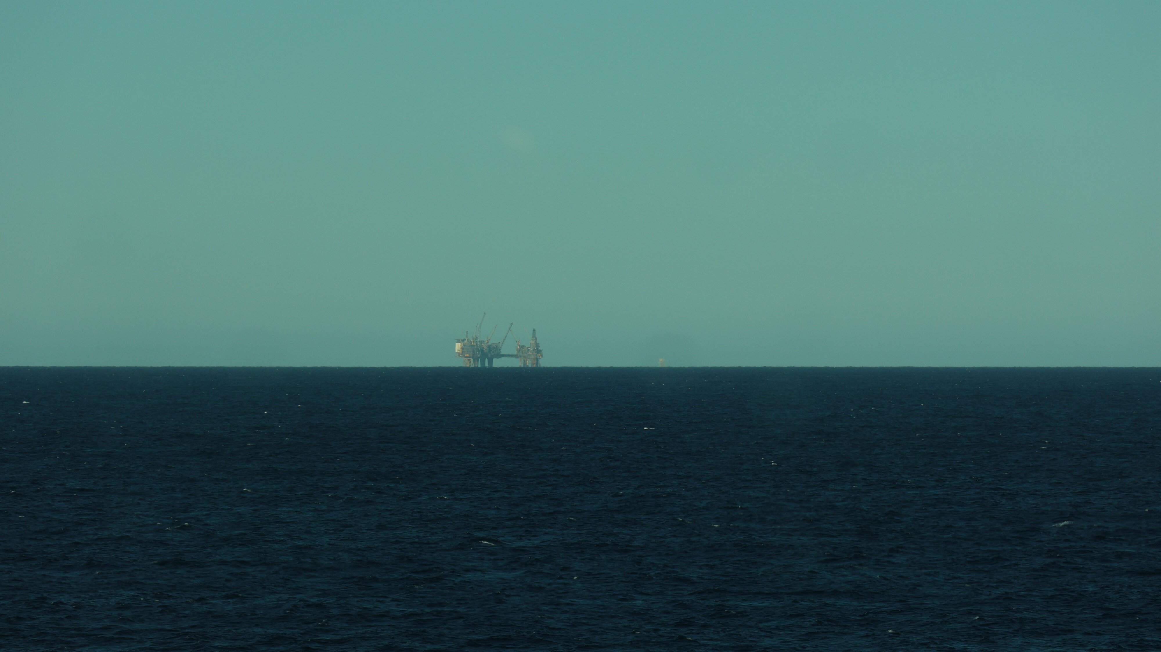 Nun kommt der phantastische Teil des Tages. Gut eingepackt, denn da sollte man sich nicht täuschen lassen von der tollen Sonne, ging es los auf Deck. Je nach dem wo man sich aufhielt war es windstill und in der Sonne angenehm warm oder es blies einem eine heftige Brise um die Öhrchen. Nun könnte man denken hier draußen auf hoher See gäbe es außer Wasser ja nun gerade mal gar nie nix zu sehen. Weit gefehlt, hier ragten gerade die Bohrinseln wie Pilze aus dem Boden. Zwei Stück haben wir in relativ naher Entfernung passiert, wenngleich sie sicher trotzdem noch einige Kilometer entfernt waren. Selbst mit meinem Zoom an der Kamera konnte ich ihnen nicht so richtig zu Leibe rücken.