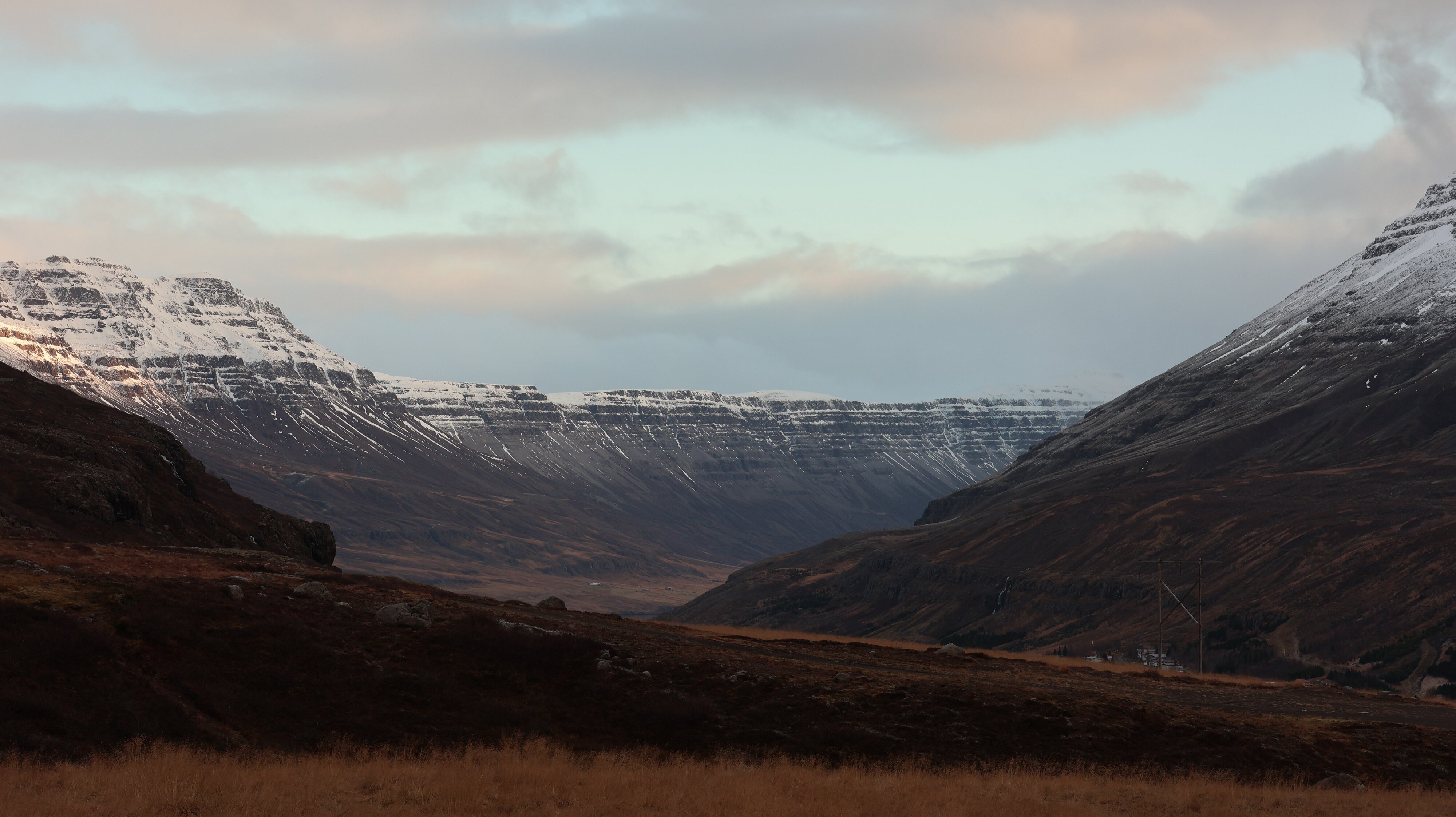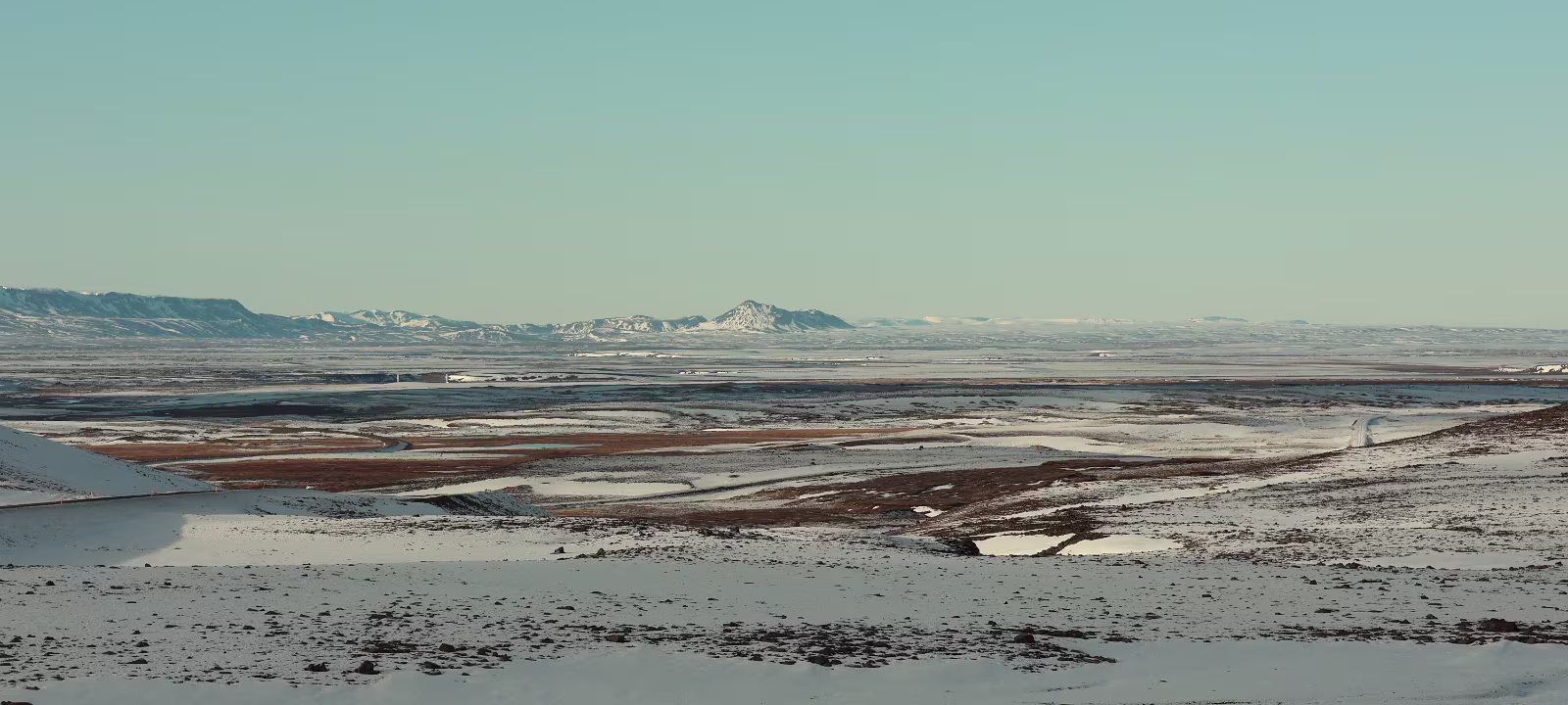 Dann geht es weiter auf der Straße, die wie recherchiert 10% Steigung hat. Und anders also ich auf Meereshöhe vermutete, war in den Höhenlagen sehr wohl Schnee auf der Straße. Aber man konnte gut fahren, keine Probleme. Auf der Hochebene ging es eine ganze Weile durch eine wunderbare Landschaft, also alles weiß, kein Baum, kein Strauch. Dann geht es bald auch schon wieder runter, nach Egilsstaðir. Und was sich da bot war der Hammer, was ein Blick. Es hatte mittlerweile aufgeklart, im Tal von Egilsstaðir lag noch ein Streifen Nebel, der Blick schien endlos zu gehen. Man konnte sich gar nicht satt sehen. Also dann weiter, dieses Mal mit 10% Gefälle. Auf meiner Rückreise werde ich diese Strecke, als einzige überhaupt, erneut passieren und es ist sicherlich eine der spannendsten und kritischsten überhaupt, sie ist berüchtigt.