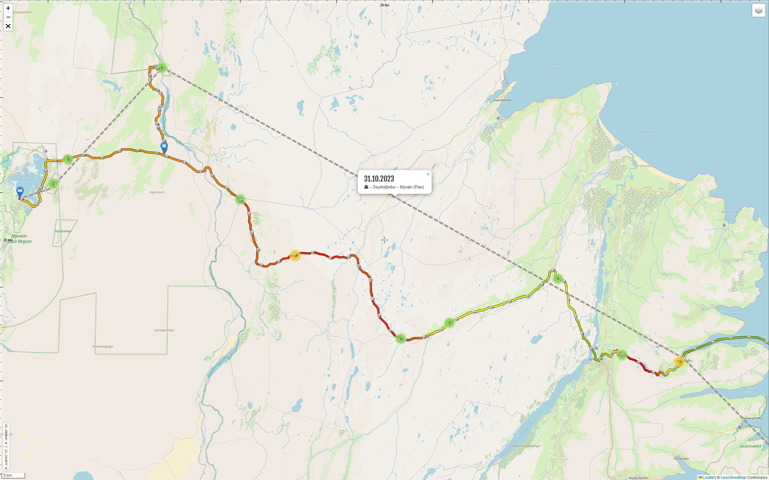 Heute also endlich die Ankunft auf Ísland. Planmäßig soll das Schiff um 09:00 Uhr Ortszeit in Seyðisfjörður ankommen. Von dort sind es dann 201 km nach Mývatn. Doch gleich auf dieser ersten Route gibt es einen potentiell kniffligen Abschnitt. Nämlich die Hochebene zwischen Seyðisfjörður und Egilsstaðir. Die [93] steigt immerhin am See „Heiðarvatn“ auf ca. 600 m. Auch dann im weiteren Verlauf auf der Ringstraße [1] werden fast 700 m erreicht. Wenn man sich dabei auf ja.is so umschaut, dann erinnert das sehr an das Saltfjellet, eine Hochebene, die Straße mehr oder weniger geradeaus, fast keine Steigungen oder Gefälle. Aber wie „tückisch“ die Gegend (im Winter) da ist, man wird es sehen.