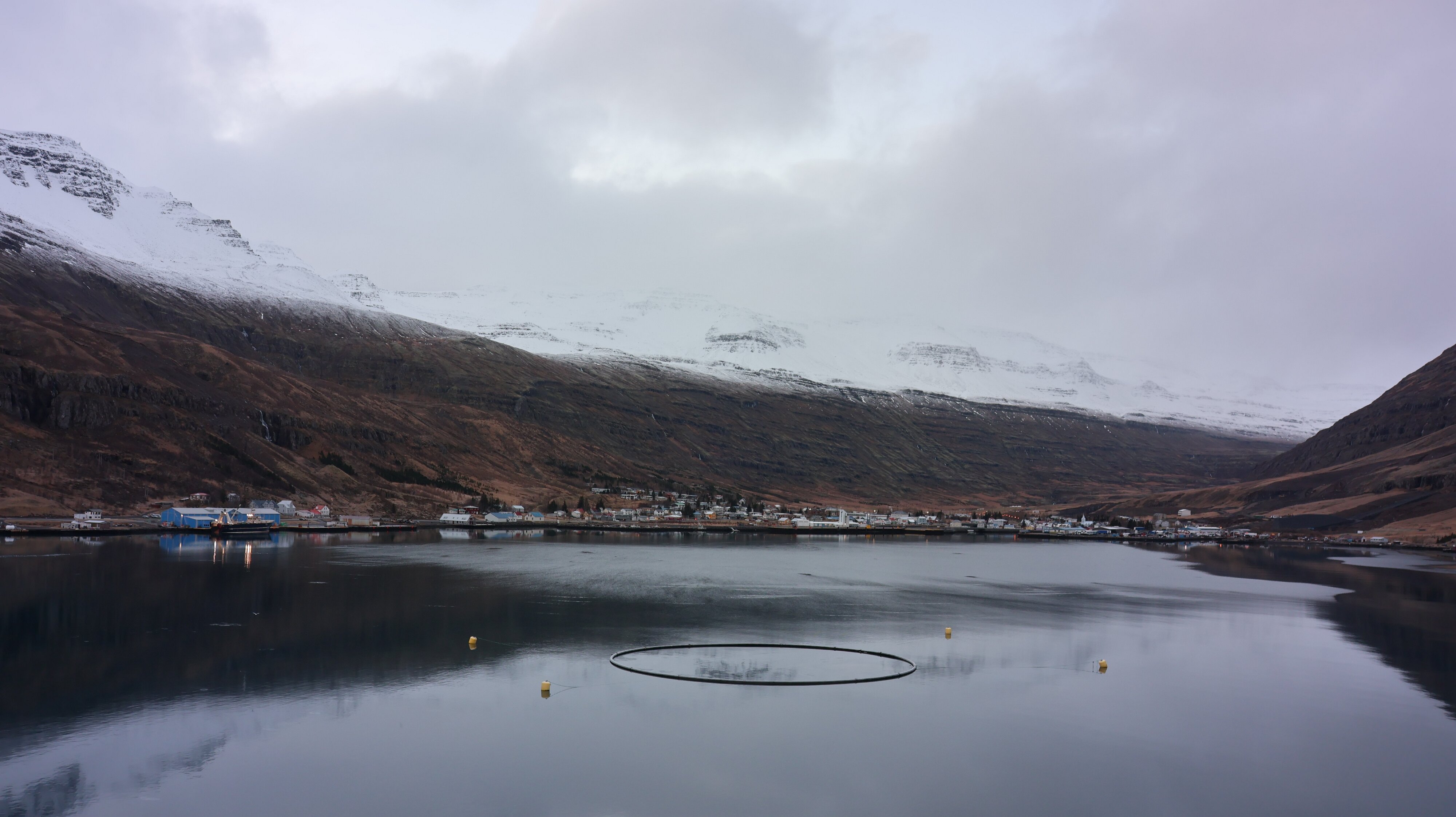 Sehr pünktliche Ankunft in Seyðisfjörður. Mein Auto stand auf einem Deck welches hoch geklappt war, es dauerte dann doch ein Weilchen bis wir losfahren konnten. Der isländische Zoll hat sich bei jedem Fahrzeug Zeit gelassen. Es standen, so mutmaße ich mal, auch zwei kleinere Hallen zur „inquisitorischen“ Untersuchung bereit. Aber meine Kontrolle fiel recht kurz aus, ein paar übliche Fragen, woher ich komme, was der Zweck meines Aufenthalts ist, ob ich was zu verzollen habe. Das wurde alles ordnungsgemäß und sachlich beantwortet, der Zöllner warf dann noch einen kurzen Blick in meinen Kofferraum und „Guten Tag“. Das war also auch erledigt. Das Wetter war noch etwas durchwachsen, stark bewölkt. Die Gipfel der umliegenden Berge waren alle gut verschneit, aber auf Seehöhe und einige Höhenmeter mehr war alles grün, bzw. grau und braun. Dann wurde noch ein Gespräch mit zu Hause initiiert und ich bin Teil einer WebCam-Aufnahme geworden. Es wird auch gewunken.