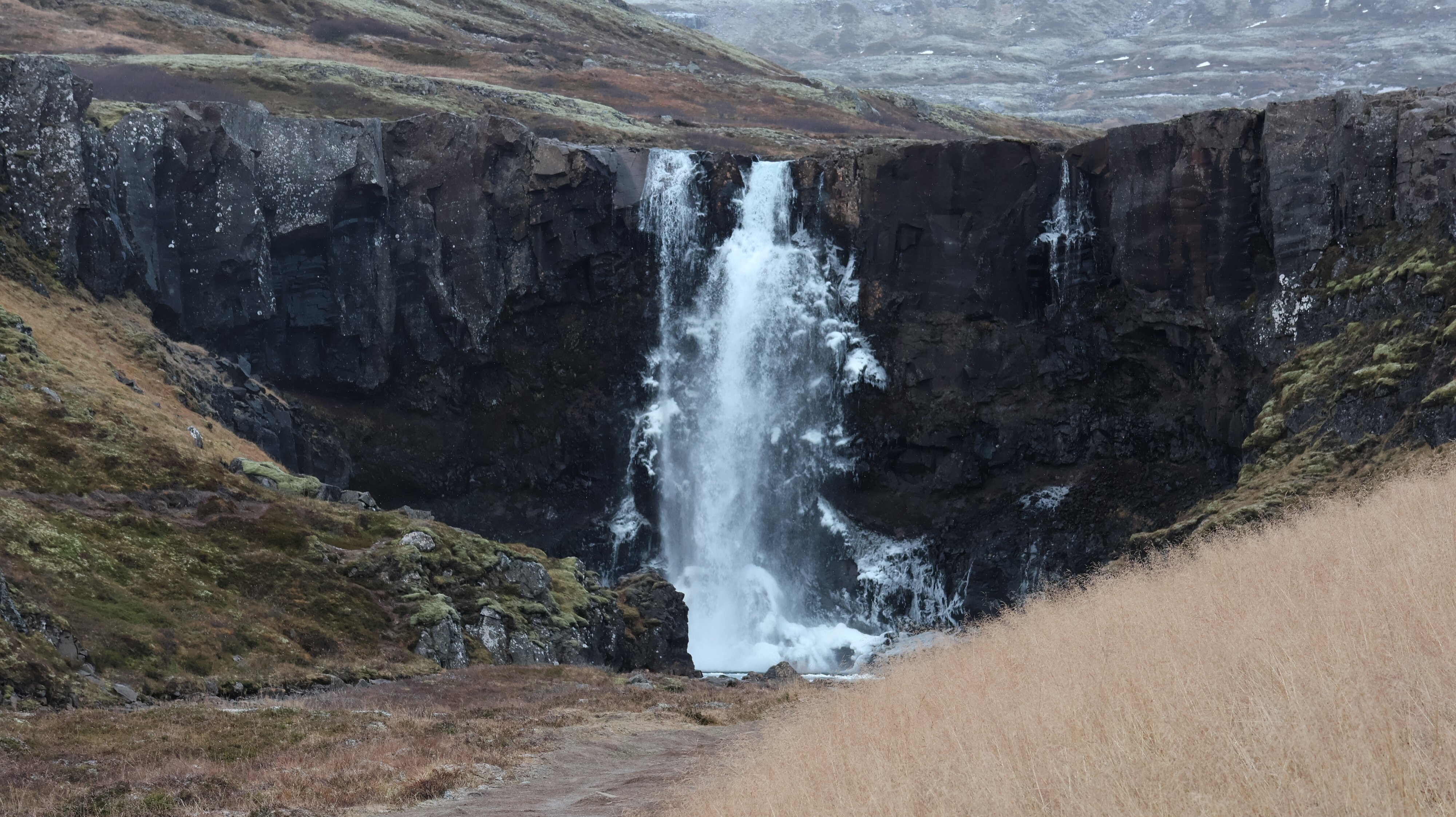 Egilsstaðir hat man schnell passiert und ab da kam dann eigentlich nur noch, nichts. Kilometer um Kilometer nichts, nur die Straße. Dann sieht man rechterhand, gülden von der Sonne beschienen, einen Wasserfall über eine Kante stürzen und kurze Zeit später kommt dann auch ein kleiner Parkplatz. Es ist der „Rjúkandifoss“. Das Wetter und die Umstände sind zu schön um wahr zu sein. Man steigt einen schmalen Weg hoch, der Boden ist hier ebenfalls gut gefroren und lässt sich so ohne Rutschpartie bewältigen. Man möchte 1.000 Fotos schießen. Ich begnüge mich mit 999. 😎