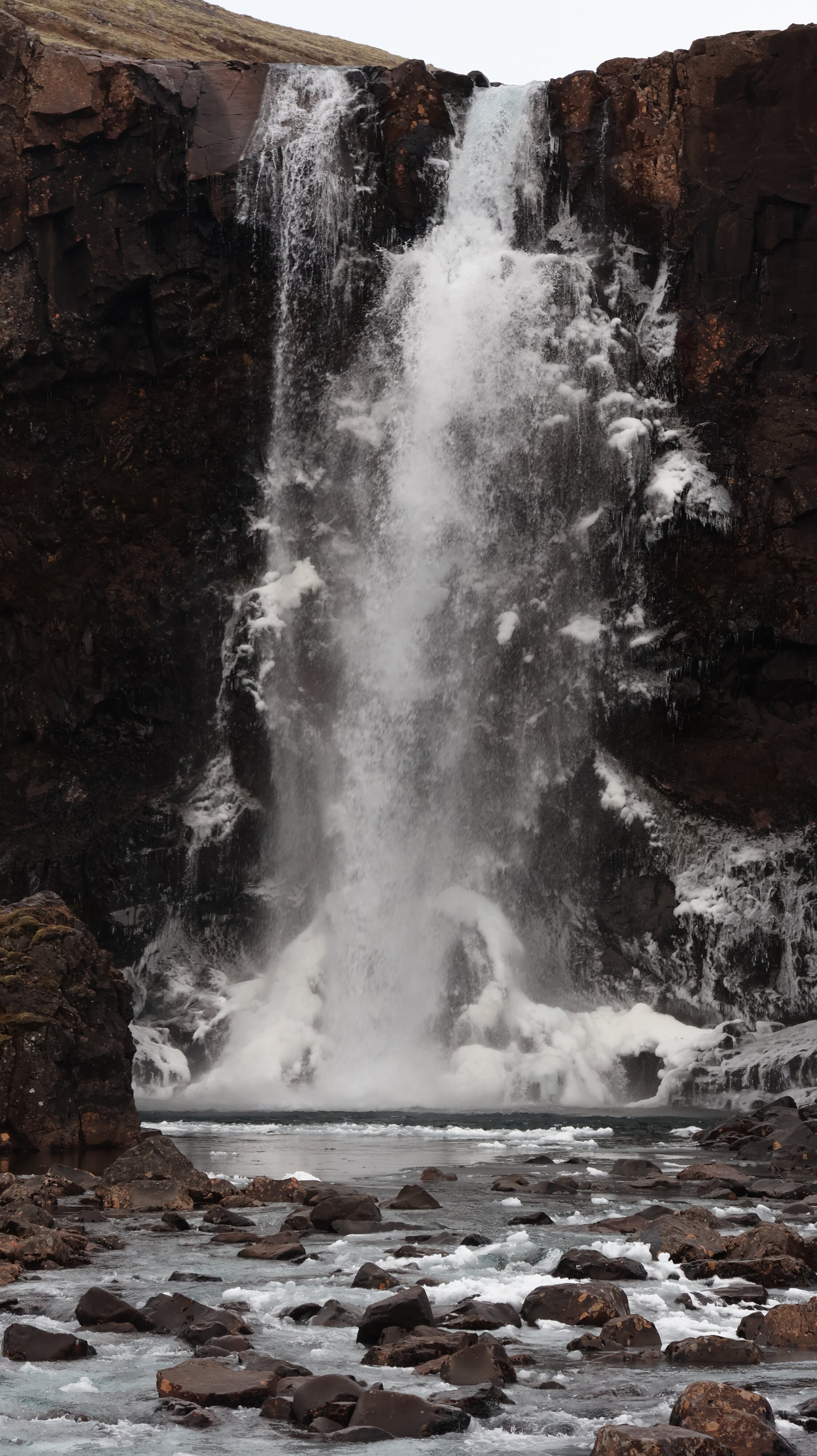 Temperaturmäßig war es schon noch mal eine Nummer frischer geworden, aber es wehte kein Lüftchen und ich hatte mir nach dem Frühstück gleich meine wattierte Hose angezogen. Wie sich dann im Laufe des Tages herausstellte eine sehr gute Entscheidung. Dann ging es aus Seyðisfjörður und schon wenige Kilometer hinter dem Dörfchen kam der erste Wasserfall in Sichtweite, der „Gufufoss“. Jetzt nichts super spektakuläres aber immerhin ein prächtig sprudelnder Wasserfall. Da der Boden schön gefroren war konnte man auch ohne im Matsch zu versinken recht nah heran. Ab einem Punkt war für mich dann aber Schluss, ab da ging es dann nur noch über ziemlich große Steine weiter, die mit abnehmendem Abstand zum Wasserfall natürlich nass und glitschig waren. Nee, also das muss nicht sein, sich gleich schon in den ersten Minuten auf Ísland auf die Waffel zu legen wäre ziemlich ömmelig.