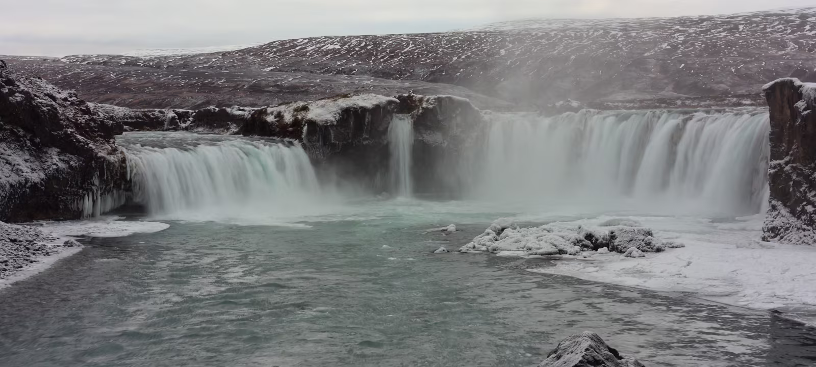 Wieder auf der [1] angekommen muss ich aber doch erst anhalten um zu prüfen, ob ich nicht doch noch mal etwas gen Osten fahren muss, um zum „Goðafoss“ zu gelangen. Und so war es, ein paar Kilometer in Richtung Osten. Der Wasserfall liegt quasi unmittelbar an der [1], der Parkplatz nur wenige Meter entfernt. Nach wenigen Minuten erreicht man den Wasserfall. Es gibt auch hier die Möglichkeit ihn von beiden Ufern aus zu betrachten. Ich hatte behalten, dass es von der westlichen Seite aus etwas besser sein soll, wenn auch nur minimal. Und klar, ein Wasserfall ist immer ein Hingucker, auch wenn die Lichtverhältnisse hier eher betrübt sind, das tut dem Spektakel keinen Abbruch. Über zwei „Klippen“ stürzt der Wasserfall am oberen Ende in die Tiefe. Man kann viele Eisschollen in den Fluten erkennen. Das war auf jeden Fall ein Erlebnis.