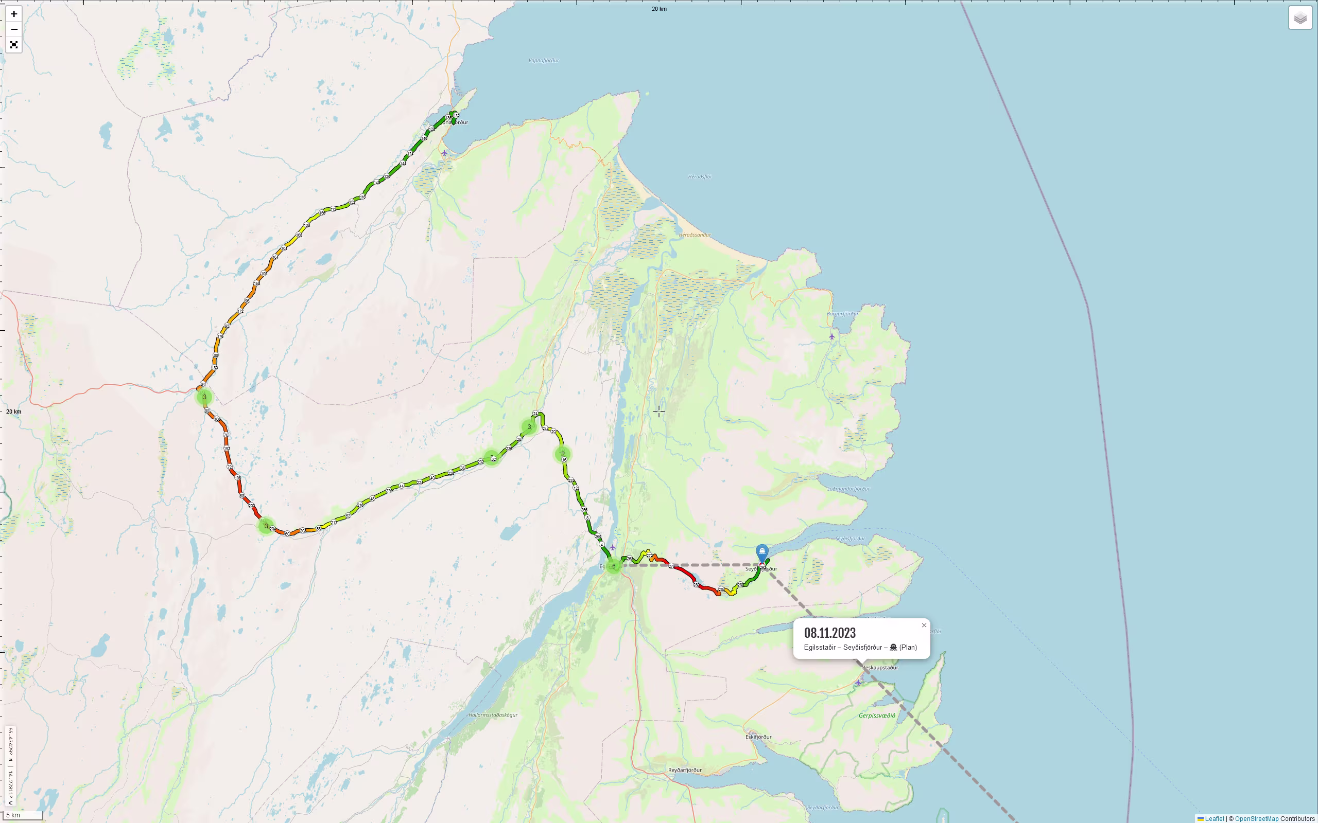 Die Fähre legt planmäßig um 20 Uhr ab, es sind nur ca. 27 km von Egilsstaðir nach Seyðisfjörður, also sehr viel Zeit für eine kurze Strecke. Aber der Abschnitt hat es in sich. Egilsstaðir liegt auf knapp 50 m, von dort geht es stetig auf ca. gut 600 m hoch dann verbleibt man auf einer Hochebene und dann geht es runter auf Meereshöhe. Auf G__gle StreeView sieht man Schilder mit 10% Gefälle, der Straßenverlauf ist aber recht moderat es hat nur wenige Kehren.