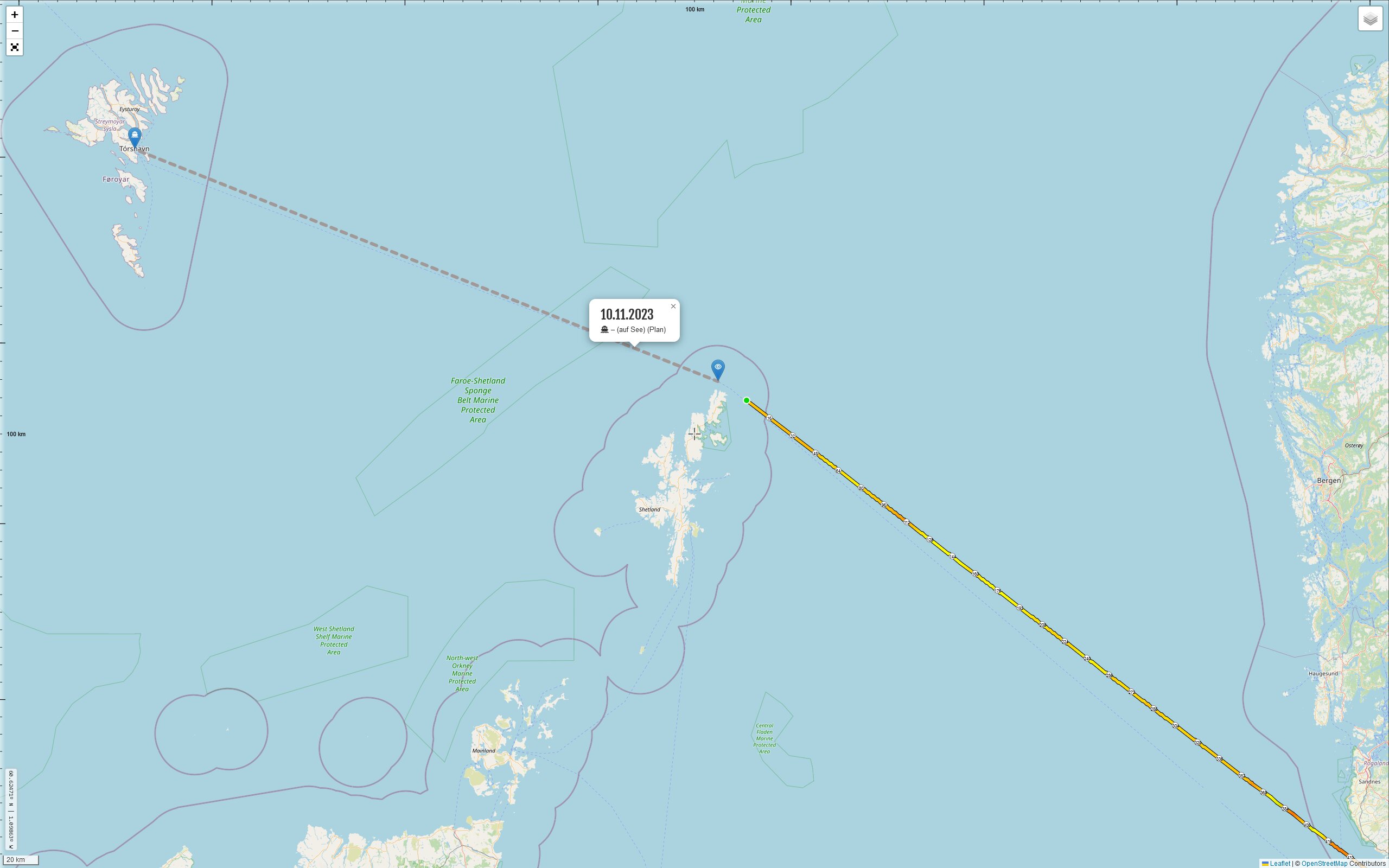 Ich blicke aus dem Fenster (Richtung Osten) und sehe deutlich Lichter, das müsste Norge sein, es ist 22:42 Uhr isländischer Zeit, kann ich ja auf dem GPX-Tack überprüfen. Gegen 22:54 Uhr sieht man jede Menge rot blinkende Objekte in östlicher Richtung, könnten Offshore-Windräder sein.