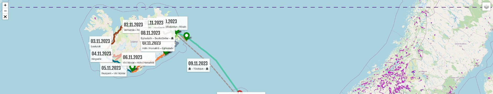 | 08.11.2023 | Mi | Egilsstaðir | Seyðisfjörður | MS Norröna | 27 | 00:27 | |||