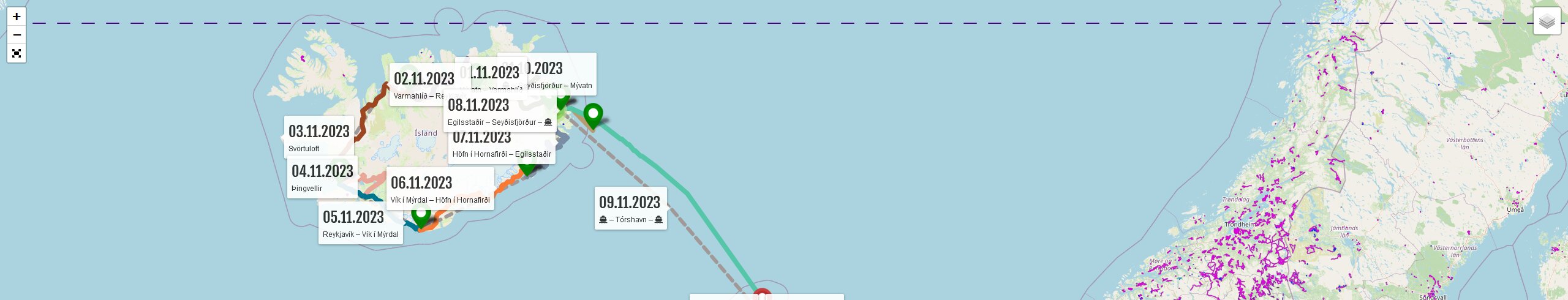 | 06.11.2023 | Mo | Vík í Mýrdal | Höfn í Hornafirði | Hótel Höfn | 272 | 03:21 | |||