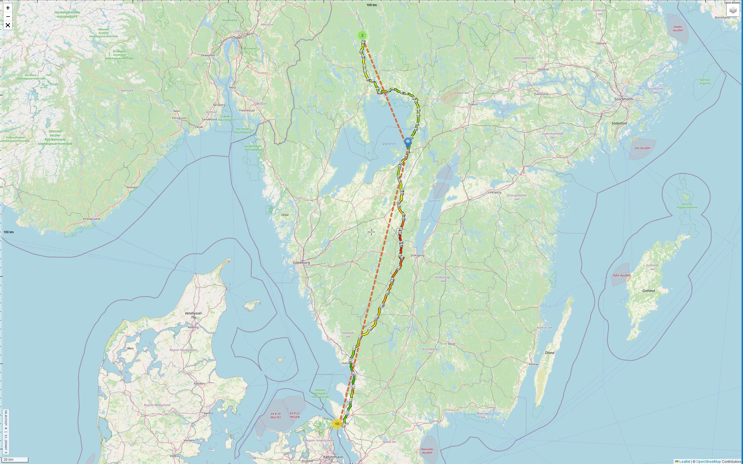 Die Fähre habe ich sehr früh angefahren (07:30 Uhr) und musste noch etwas warten. Mein Ticket wurde am automatischen Ticketschalter nicht erkannt, plöde Technik. Die Überfahrt vergeht wie im Flug. Von der Fähre fuhr ich als vorletzter runter, da schwante mir schon mal nix gutes. Sicher steht jetzt das ganze Schiff am schwedischen Zoll und wird bis ins letzte Fach auseinander genommen. Aber nein, alle Autos wurden durchgewunken und nur 2-3 hatten wohl eine wenige Sekunden dauernde Befragung seitens der Zöllnerin. Auch ich wurde freundlich durchgewunken. Auf der Autobahn war so früh noch nicht viel los, wie eigentlich immer in den letzten Jahren.