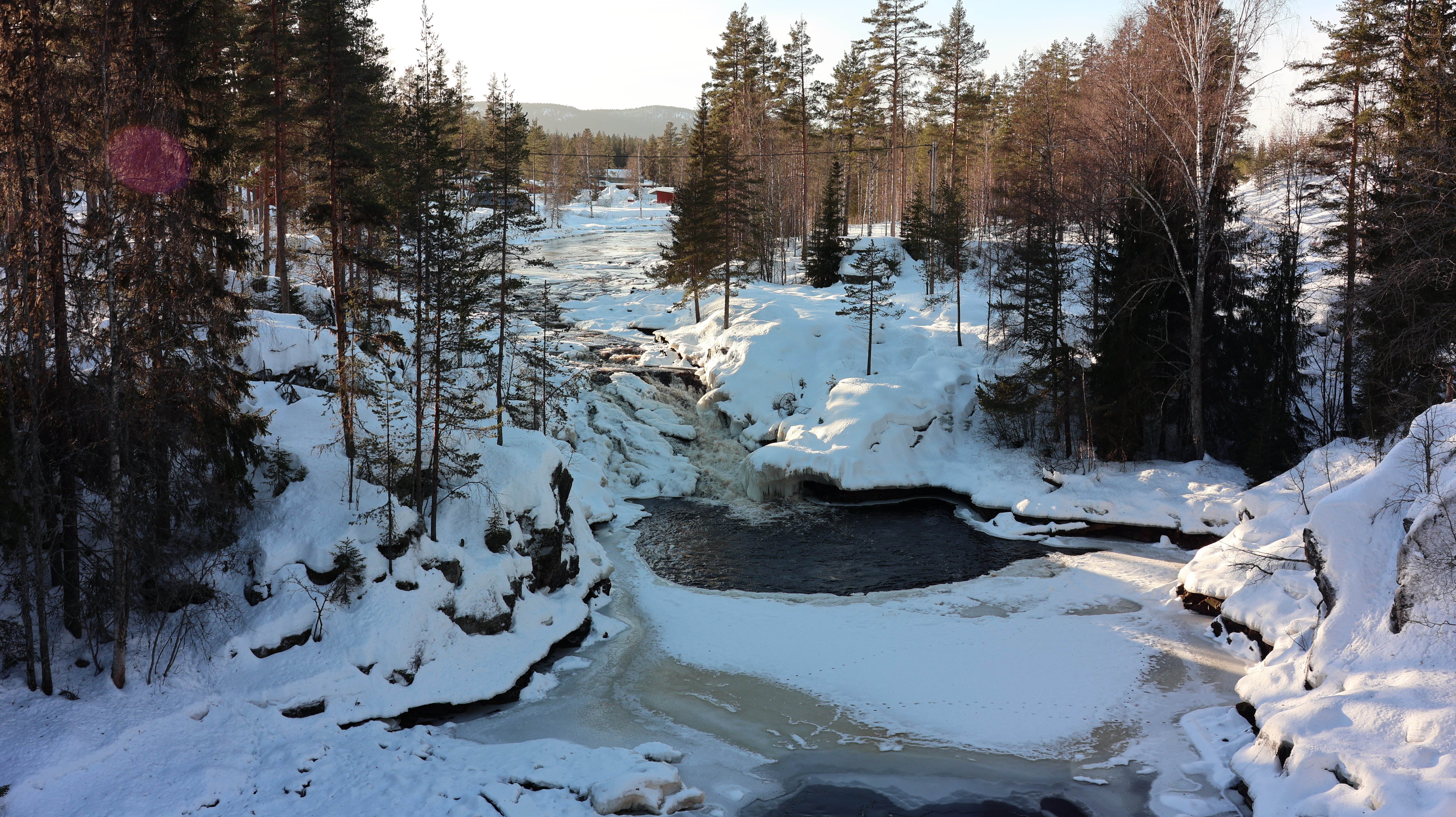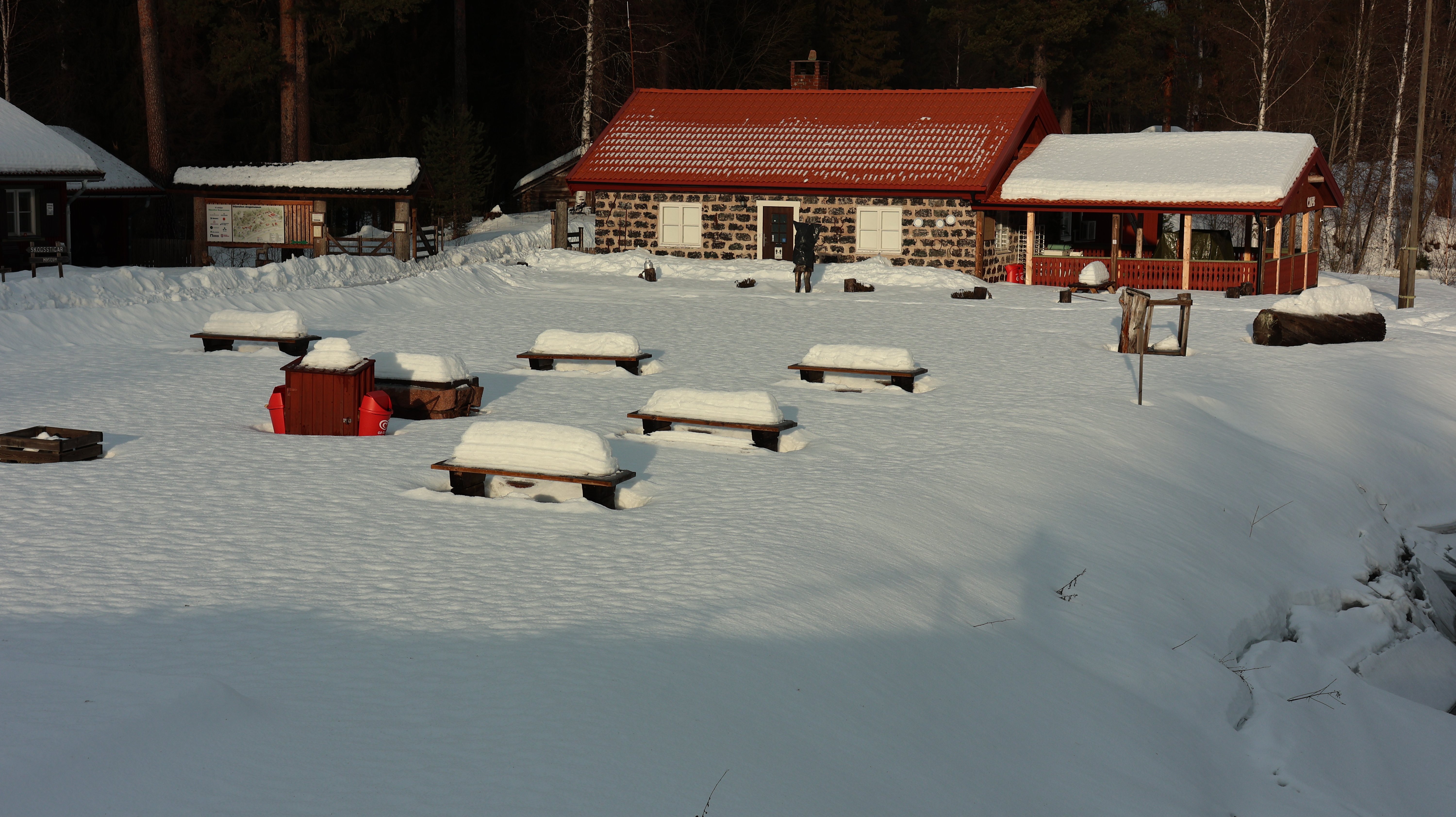 Wieder ins Auto und weiter. Schnee lag schon viel in der Landschaft, da konnte man nicht klagen, aber er war schon recht angefressen und auf den Bäumen lag auch kein Krümel mehr, aber, es wird nicht gemeckert, nein. Dann, konnte das wirklich sein, konnte man da in der Ferne wirklich so etwas wie blauen Himmel sehen? Ja, doch. Langsam nähere ich mich Mora und es kommt immer mehr blauer Himmel zum Vorschein.
