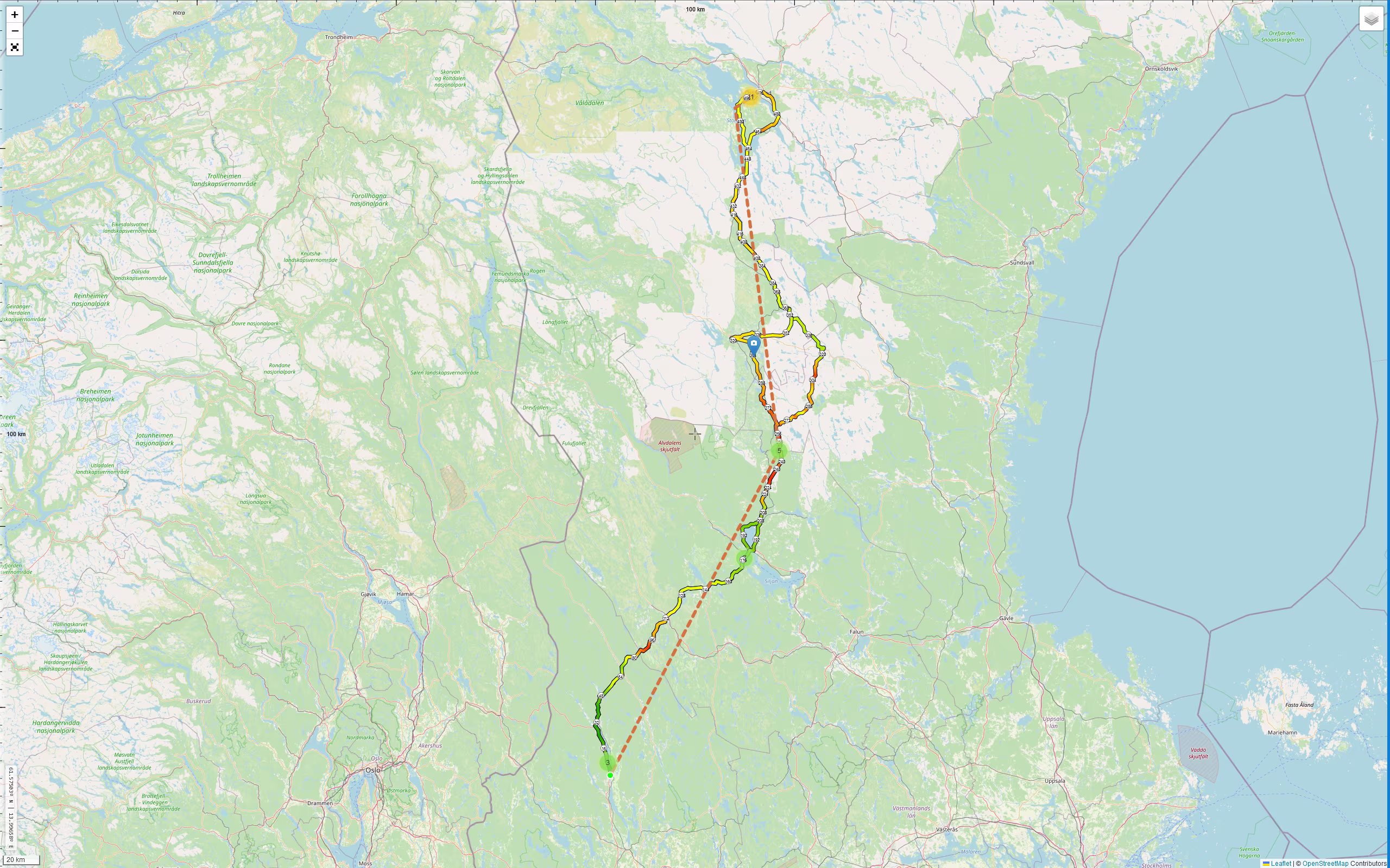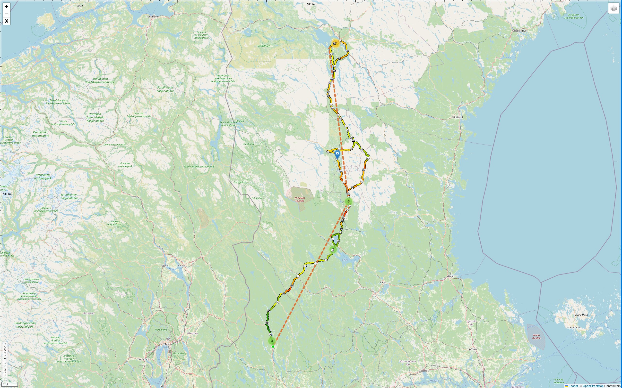 Auf der heutigen Route passiere ich wieder den „Noppikoski vattenfall“, er liegt direkt am Inlandsvägen (nach Mora bzw. Orsa), ein paar Meter davor hat es eine Tankstelle „Värdshuset Trollet“. Wie ich erst heute entdecke hat es an der Tankstelle sogar eine WebCam.