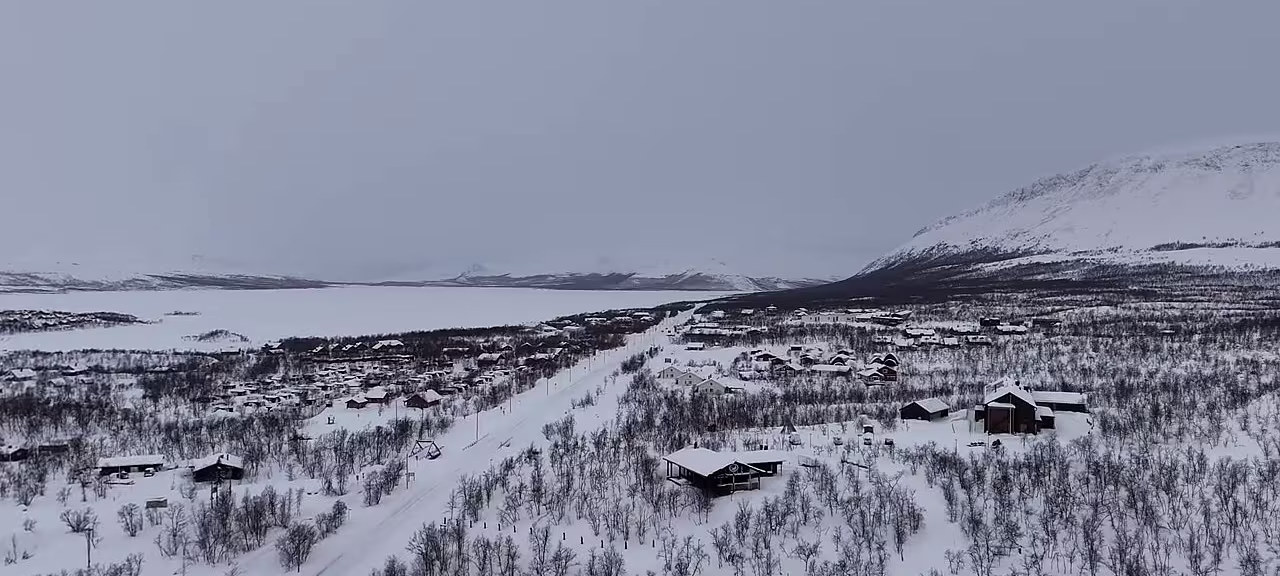 Am Ortseingang von Kilpisjärvi dann endlich ein großer Parkplatz, gut geräumt. Hier das Fluggerät zu starten war vermutlich auch wieder grenzwertig, weil die Straße nicht sehr weit war und das erste Haus ebenfalls. Egal.