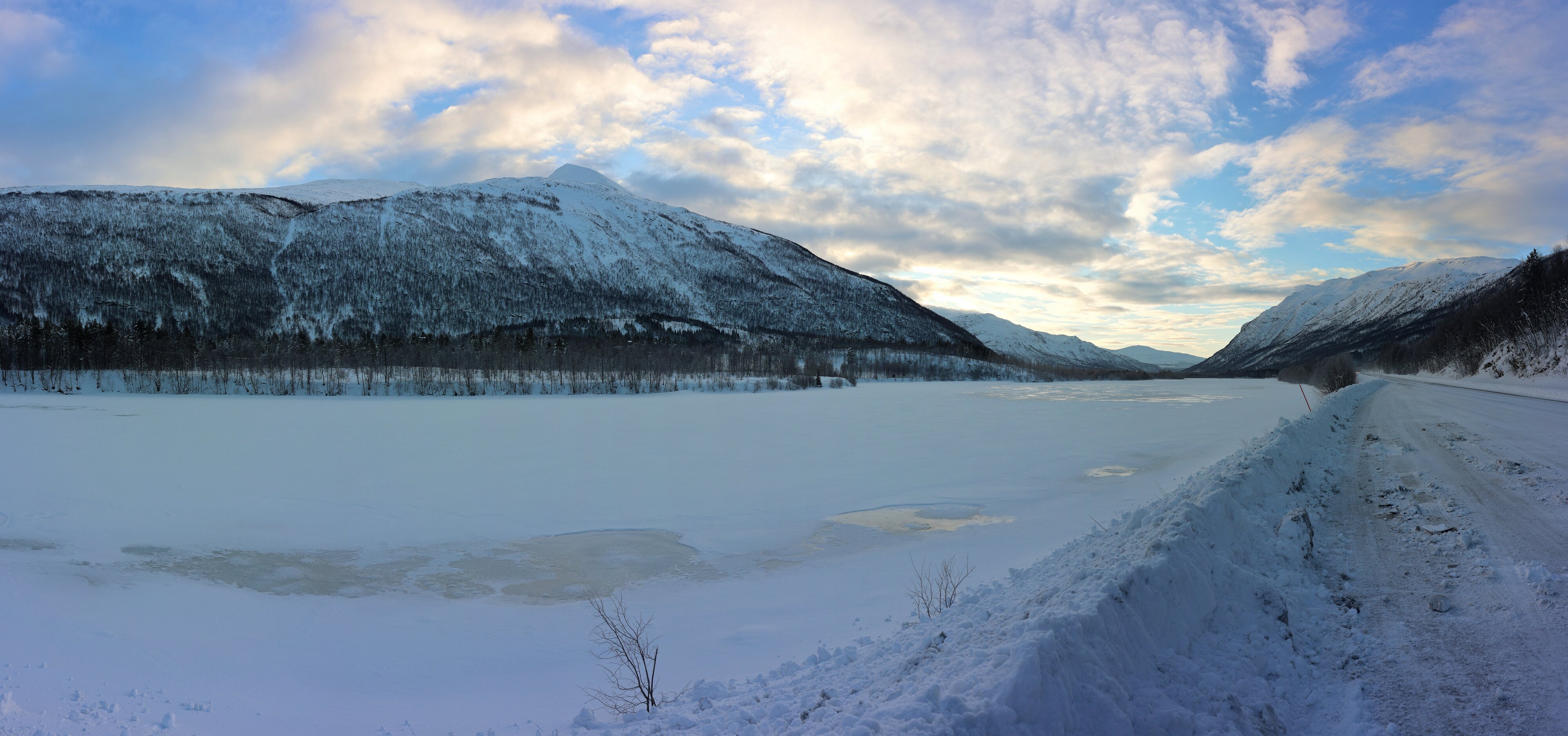 Es lässt sich super fahren, die Straße ist fast durchgehend mit Schnee belegt, es gibt keine Spurrinnen, Verkehr ist eher wenig. Die Temperatur schwankt recht stark, zwischen -3 °C und -16 °C war heute alles drin.