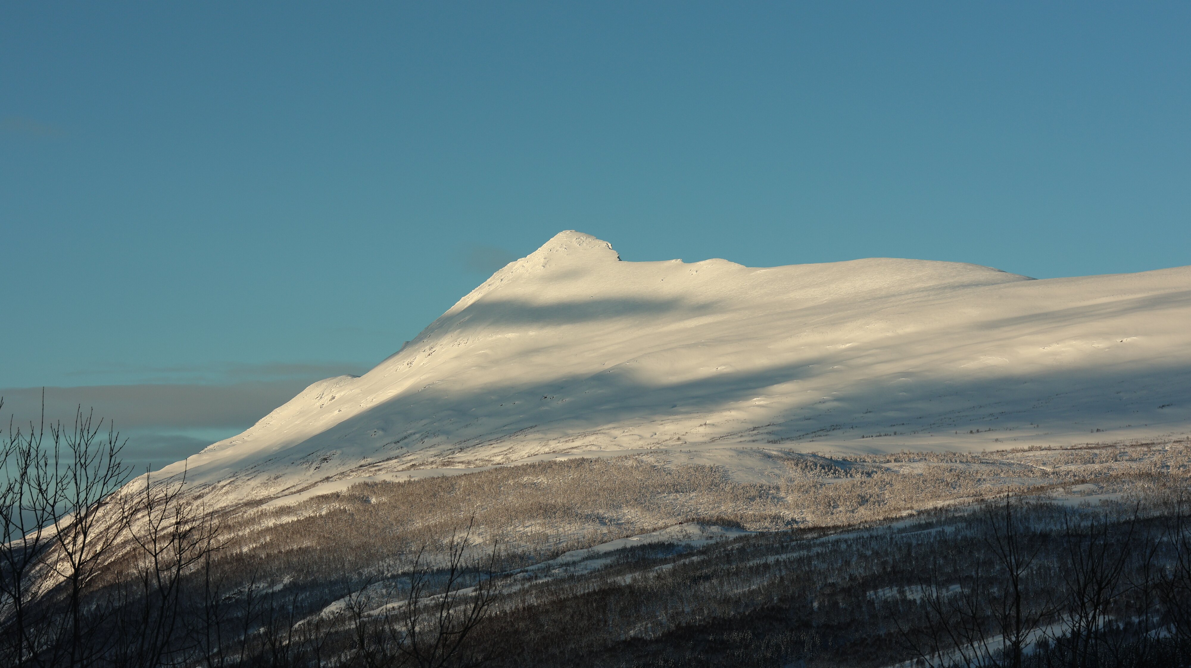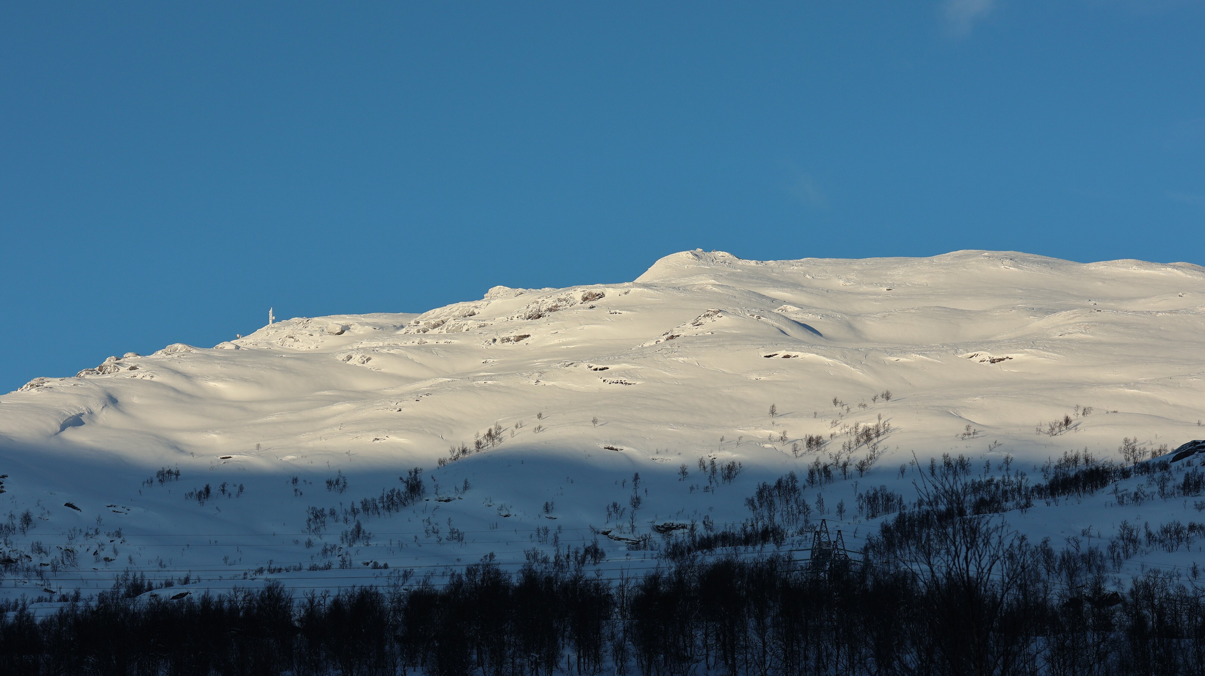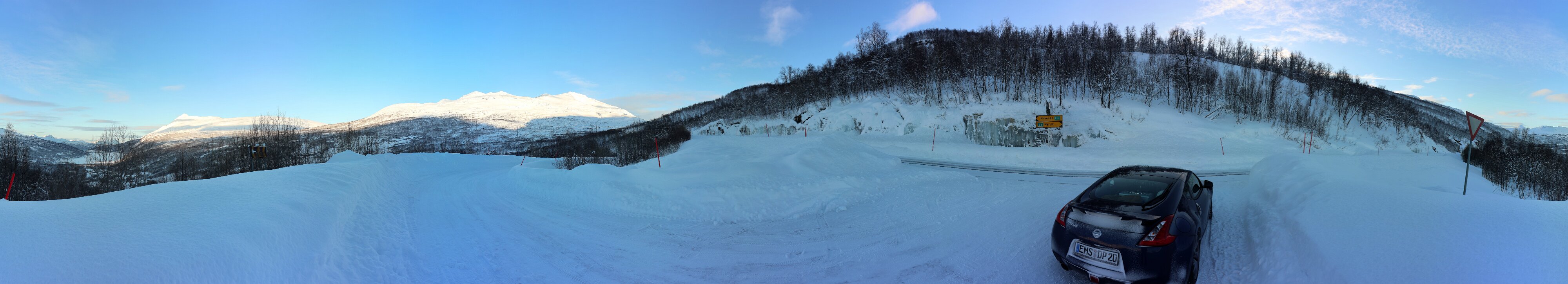 Geräuschmäßig war das auf jeden Fall eine angenehme Nacht. Frühstück hatte ich keines gebucht, also alles packen, ins Felsenparkhaus und los geht es. An der Shell-Tankstelle erstehe ich einen großen Kaffee und ein Matpakke. Zwei der Brote werden gleich vertilgt. Wettermäßig ist es ein Traum, -4 °C kalt, Schnee ohne Ende, fast kein Wölkchen zu sehen. An einem Parkplatz an der [E6] der wenigstens ein paar Meter neben der Straße liegt halte ich an und lasse das Fluggerät steigen. Wirkliche Routine ist das für mich alles noch nicht. Ich fliege nur auf Sicht, mich nur mit dem Display zu orientieren kriege ich noch nicht hin.
