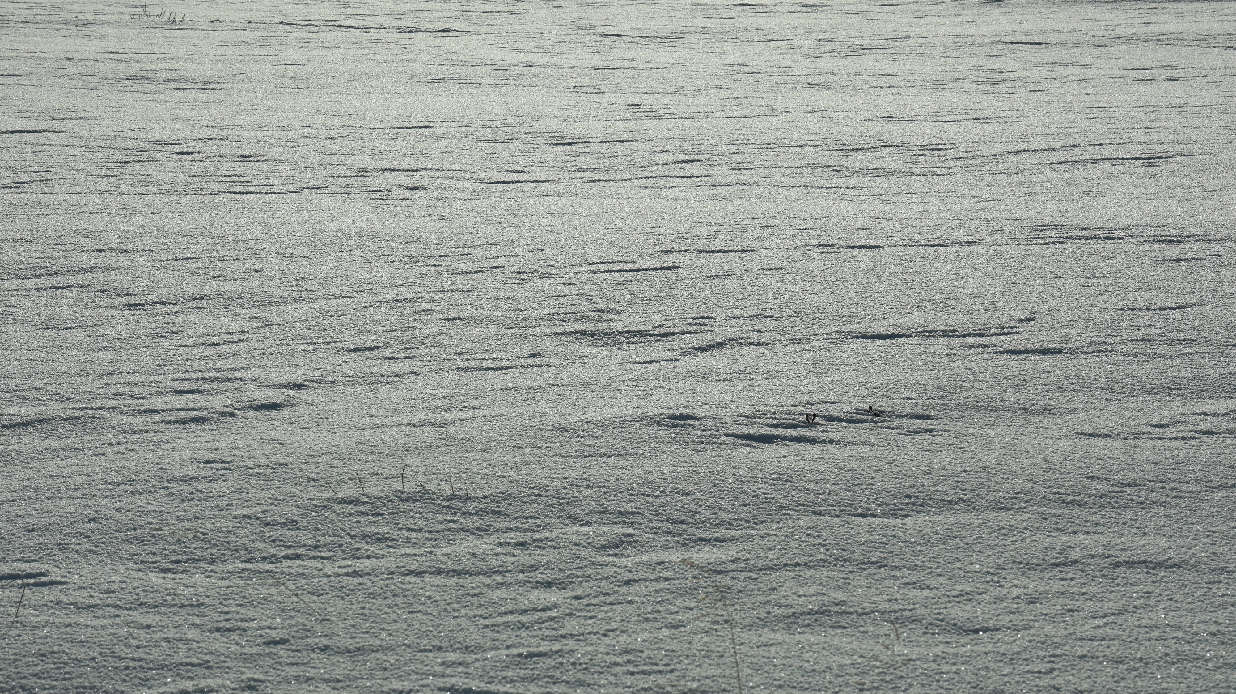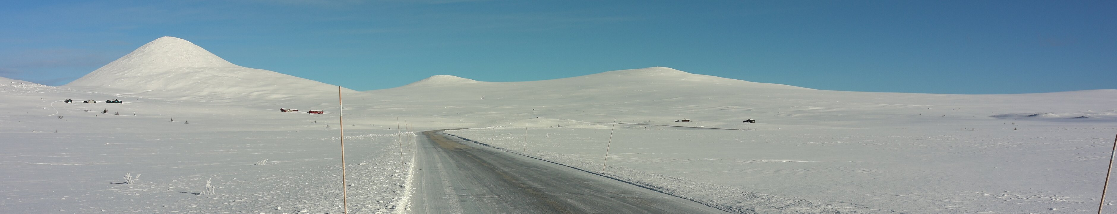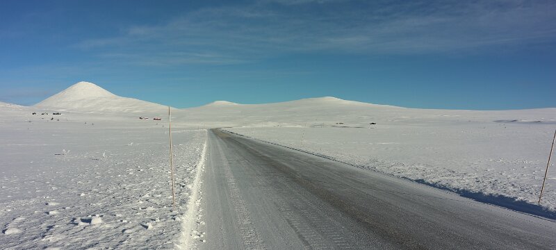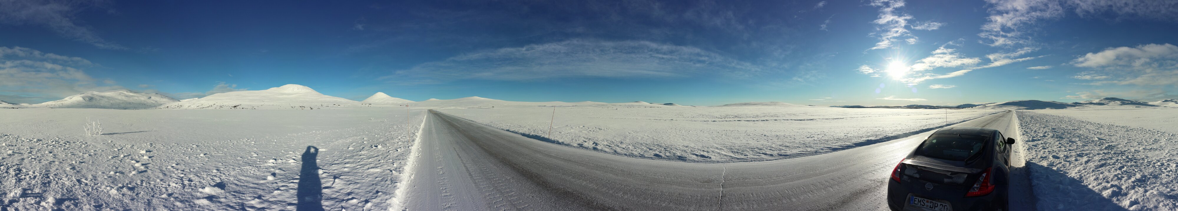 Dann steht (fährt) man unvermittelt auf einer Hochebene. Vorher fuhr man noch durch Wald durch aber nun waren kein Baum und kein Strauch mehr zu sehen. Nur noch weiß, in allen Richtungen, die Sonne knallte herunter. Einfach atemberaubend. Eine völlig neue Erfahrung, so etwas hatte ich in Norge noch nicht gesehen. Wirklich wo mal anhalten war nicht möglich, alle Parkmöglichkeiten waren komplett verschneit und nicht geräumt. Ich gleite langsam durch die völlig fremde Welt. Irgendwo wird man da doch mal wo anhalten können. Ohne Foto, das geht ja gar nicht. Blick in den Rückspiegel, nee, da ist keiner, Blick nach vorne, da kommt keiner. Anhalten, raus aus der Karre. klick, klick, klick. Ist das frisch hier, die Sonne brettert zwar und macht auch bestimmt etwas warm, aber gegen zweistellige Minusgrade kommt so schnell nix an. Gut, wenigstens ist das mal festgehalten. Wieder einsteigen.