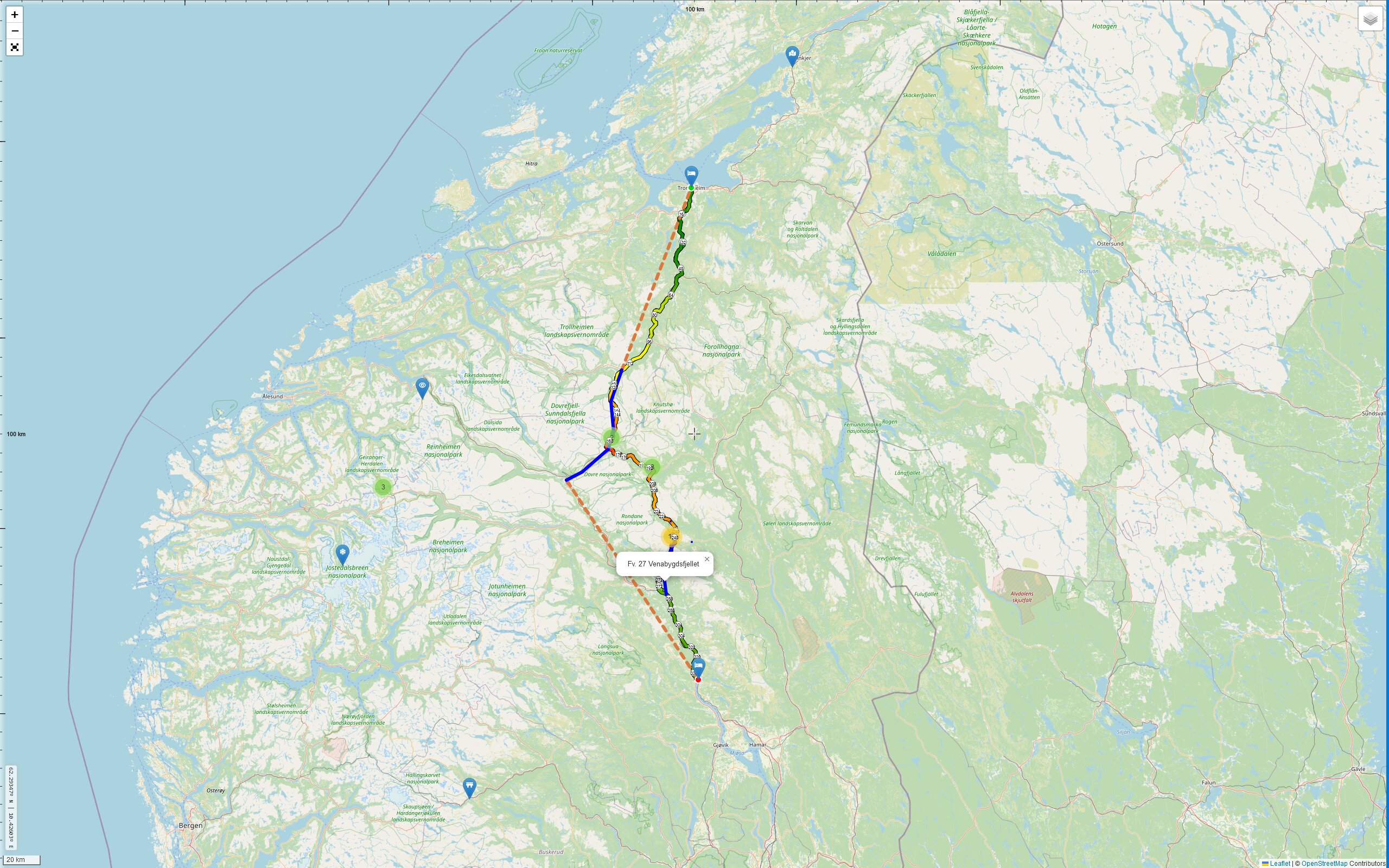 In 2023 wollte ich als Alternative über das „Venabygdsfjellet“ fahren, aber das war gesperrt. Leider hat es da keine WebCam von Vegvesen. Immerhin geht es da auf über 1.000 Meter ü.d.M. hoch. Vielleicht klappt es ja dieses Mal. Die Strecke entlang der [27] verläuft an einer „Landschaftsroute“. Zu sehen gibt es: