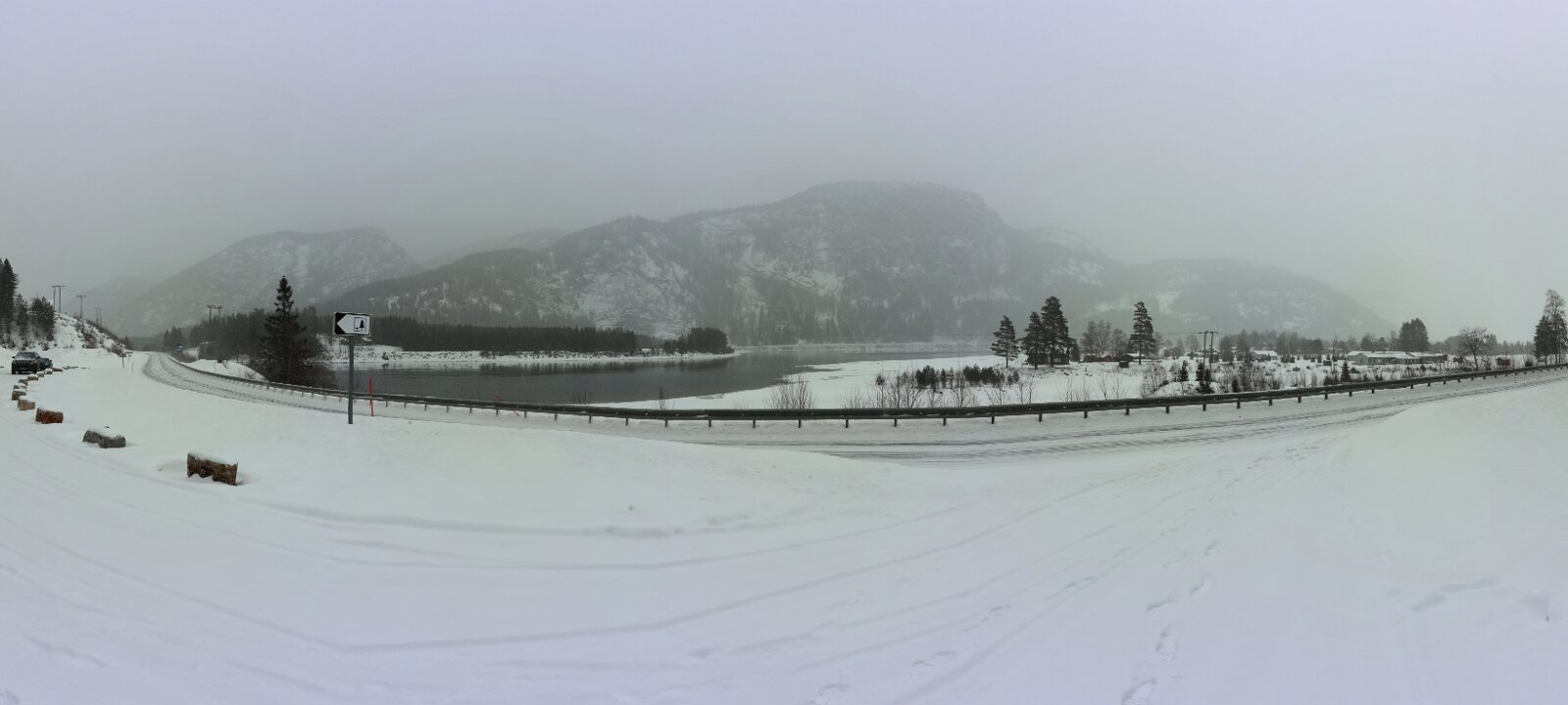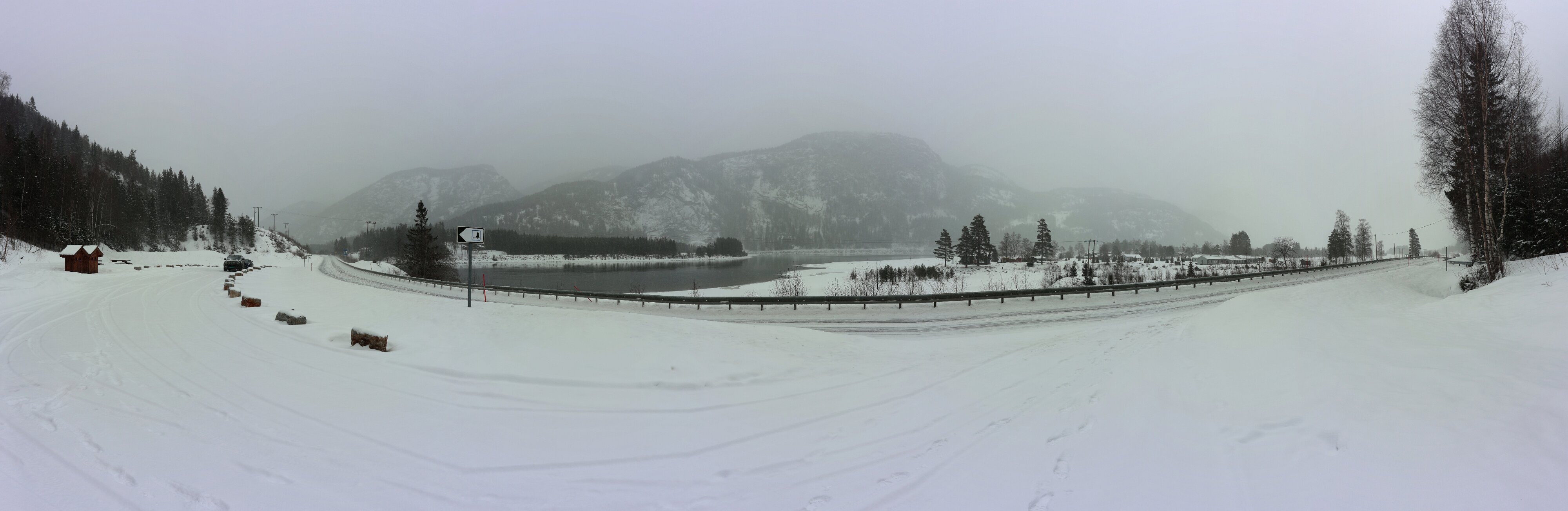 Verschlafener Blick aus dem Fenster, der direkt auf die [E134] fällt, kurz vor 6 Uhr. Sieht alles OK aus, kein Schneefall. Kann das wirklich sein? Aus dem Bett raus und mal richtig gucken. Oi, da schneit es ganz fein, man sieht es eigentlich nur an den Lampen an der Straße. Frühstück gibt es erst um 8 Uhr. Im Prinzip habe ich gar keine Eile, die Fähre legt um 16:30 Uhr ab, man soll spätestens eine Stunde vorher da sein. Für noch nicht mal 300 km keine große Sache. Frühstück, alles wieder einpacken, ins Auto verfrachten. Das ist nur sehr dünn verschneit, richtig kalt scheint es auch nicht zu sein, in der Nase britzelt es nicht. Der Parkplatz ist mehr oder weniger frei von neuem Schnee (alter liegt natürlich schon), da bleibe ich nicht stecken. Abfahrt bei Außentemperatur von -10 °C. Dann die Steigung. Es läuft gut, ein Schneepflug kommt mir entgegen, meine Spur ist etwas mit Neuschnee belegt, aber nichts was hindert.