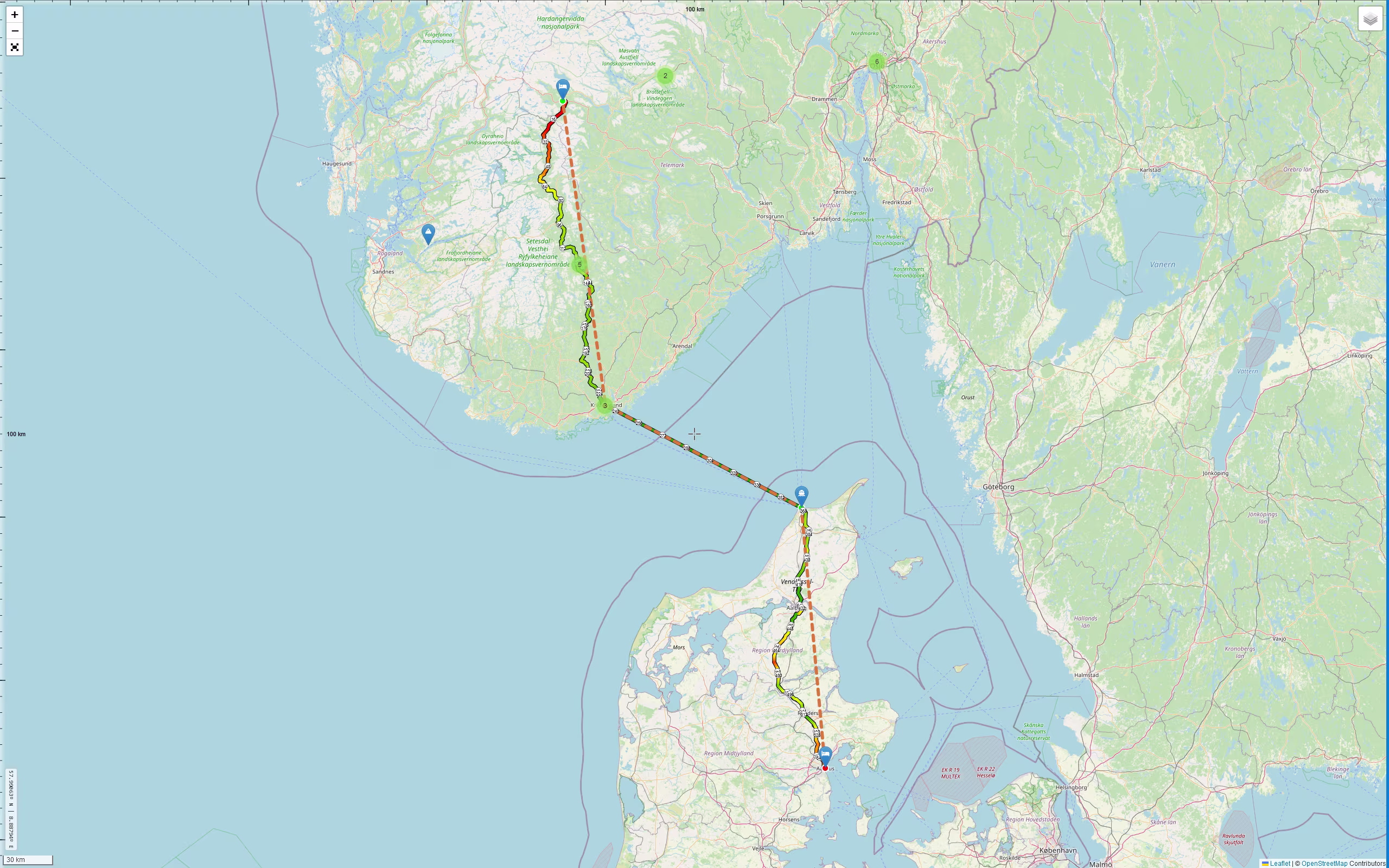 Ansage: Wir kommen erst um 20:45 Uhr in Hirtshals an, also eine Stunde Verspätung. Checkin im Hotel ist bis 23:30 Uhr möglich. Das sollte reichen, auch wenn ich im Moment nicht mehr auf dem Schirm habe wie viele Kilometer noch zu fahren sind.