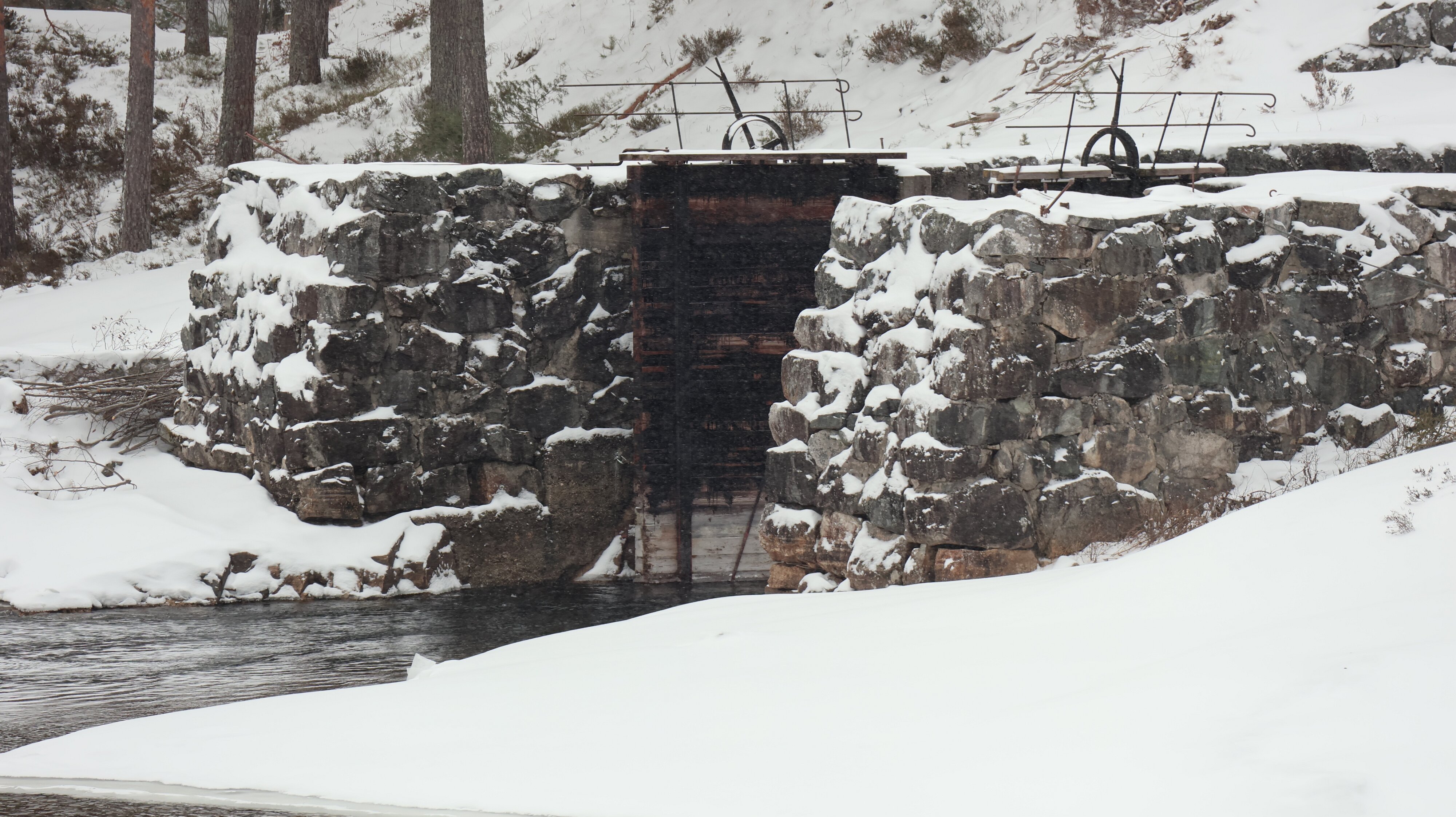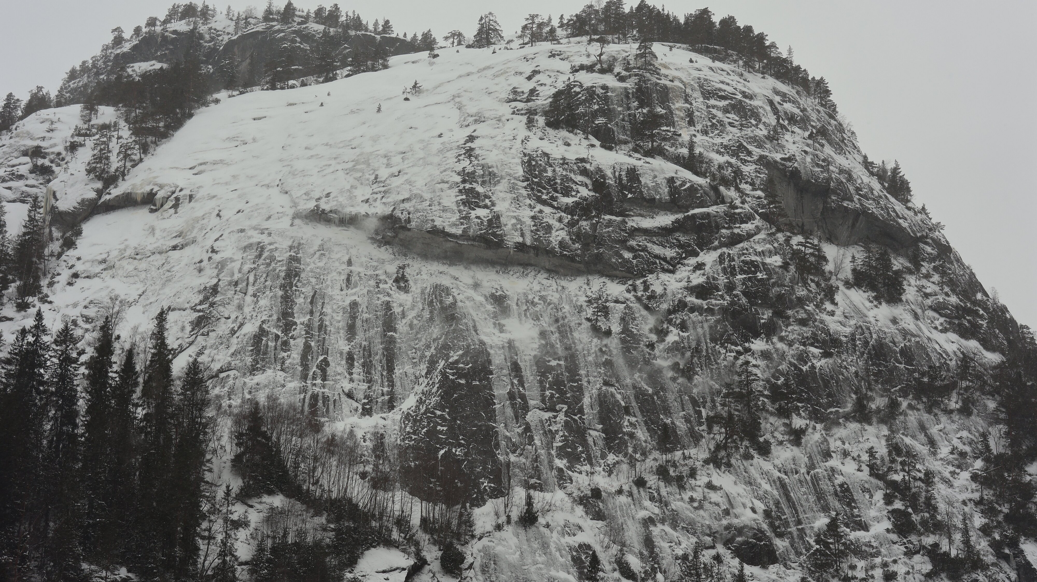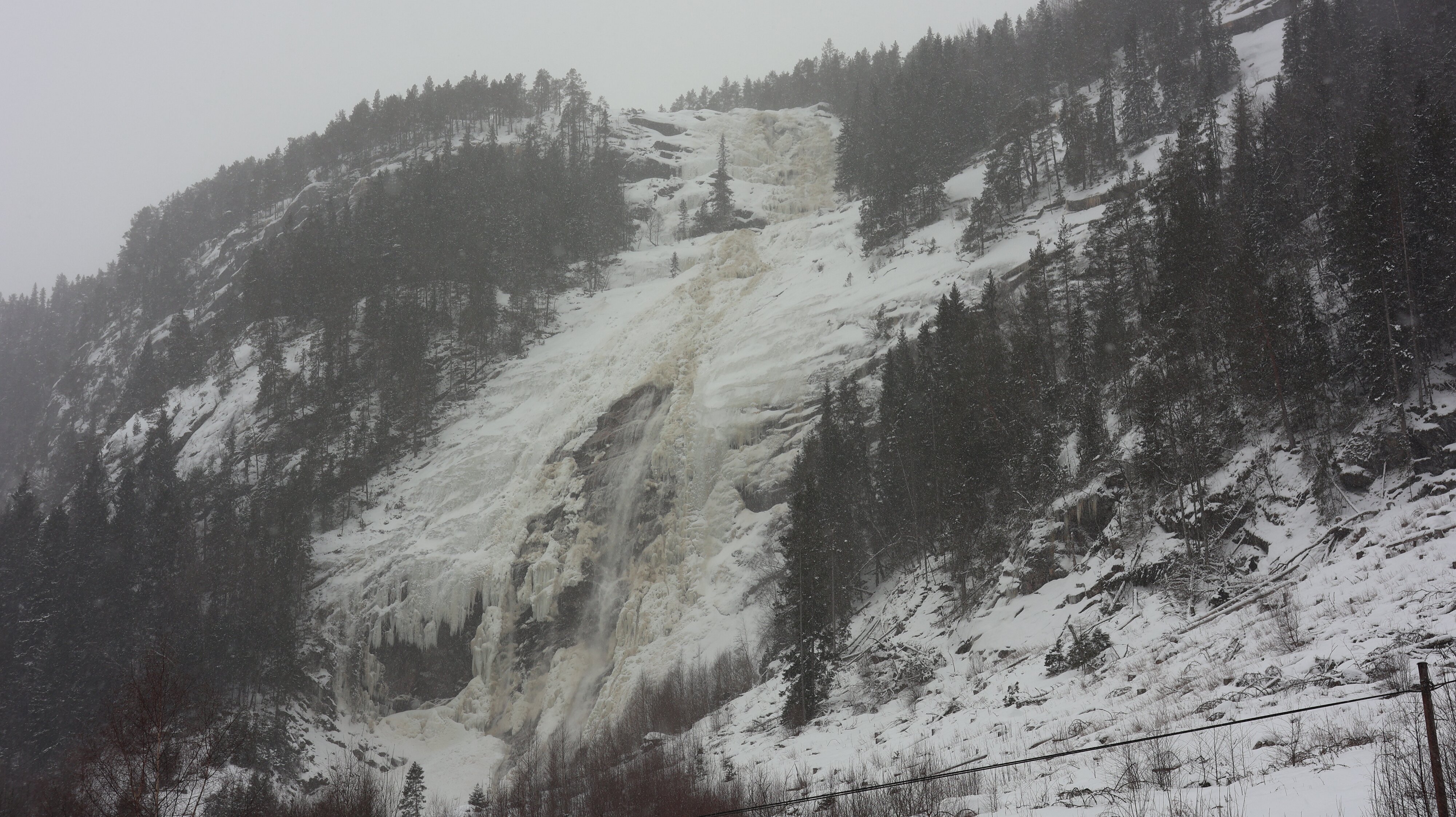 So komme ich auf der Hochebene an. Da fetzt teilweise ein heftiger Wind um die Ecken, manchmal sieht man für ein paar Sekunden nix als Schneewolken. Dann recht unvermittelt bin ich schon in Hovden, das ging ja schnell. Das Wetter beruhigt sich, es schneit zwar weiter ganz leicht aber der Wind legt sich. Langsam wird es auf der Straße belebter, aber viel Verkehr ist das nicht. Es geht ständig abwärts, es lässt sich gut fahren. Die Temperatur fällt minimal. Am Wasserfall „Reiårsfossen“ halte ich an. Sieht sehr imposant aus, er ist größtenteils zugefroren, aber an einigen Stellen stürzt doch viel Wasser herab. Schwer zu sagen wie hoch er ist, aber es ist nicht wenig.