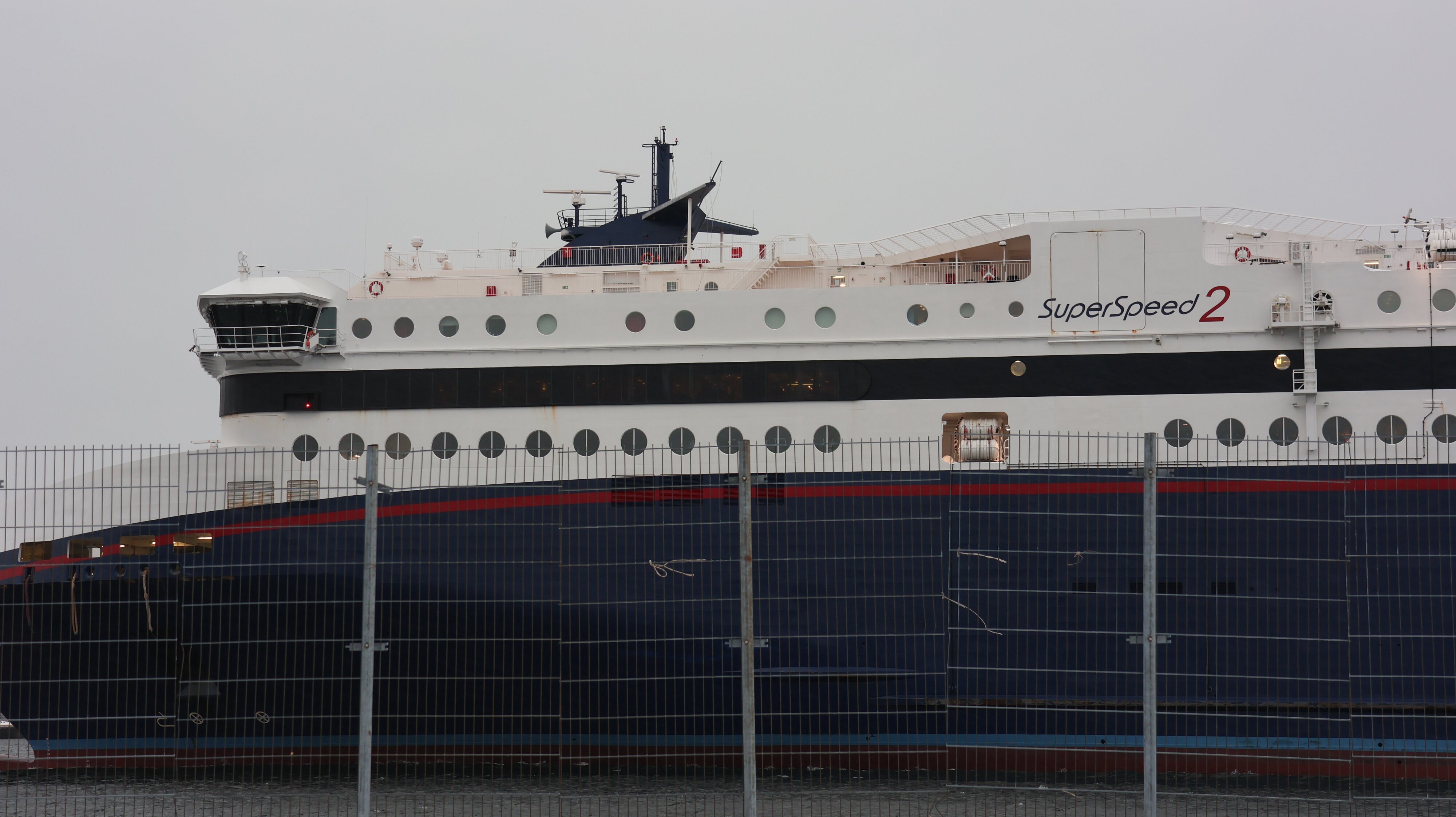 Es fetzt ein heftiger Sturm am Kai entlang. Sogar meine flache Karre wackelt ein paar Mal. Was wird das nachher nur für eine Überfahrt, wenn es hier im Hafen schon so windig ist. Aber wenn Probleme in Aussicht stünden hätten sie die Leute ja nicht eingecheckt, so der Versuch zu argumentieren, dass die Strecke wohl prinzipiell bedient werden wird. Blick nach rechts aus dem Seitenfenster, Blick aus dem Hafen hinaus, soweit man durch die Schneewolken gucken kann. So langsam denke ich müsste die Fähre mal um die Ecke biegen, sie muss ja noch rückwärts einparken, alles muss von Board und die neuen Gäste wieder drauf. Von früheren Überfahrten weiß ich, dass die Fähre manchmal schon ein paar Minuten vor der Zeit abgelegt hatte.