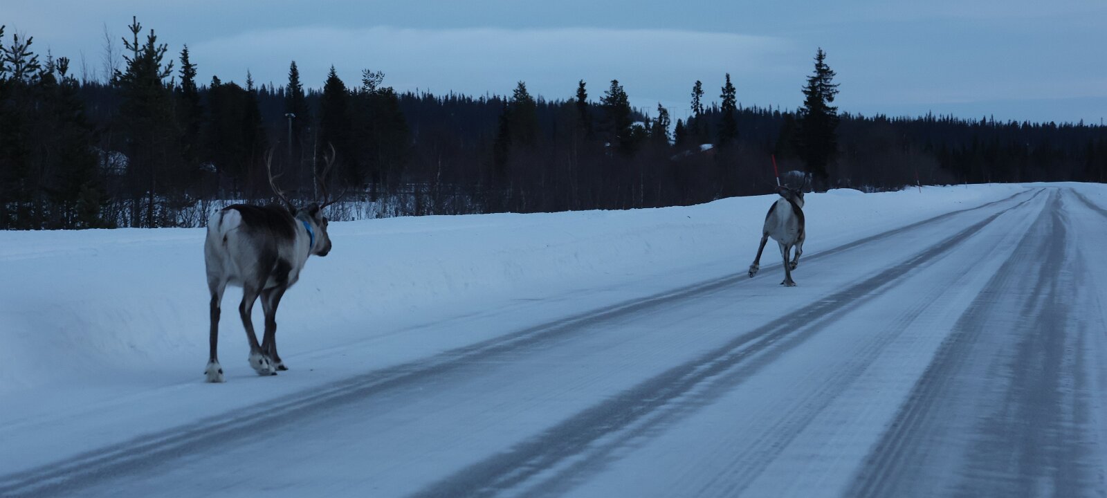 Jokkmokk – Tromsø Rentiere rennen auf der Straße.
