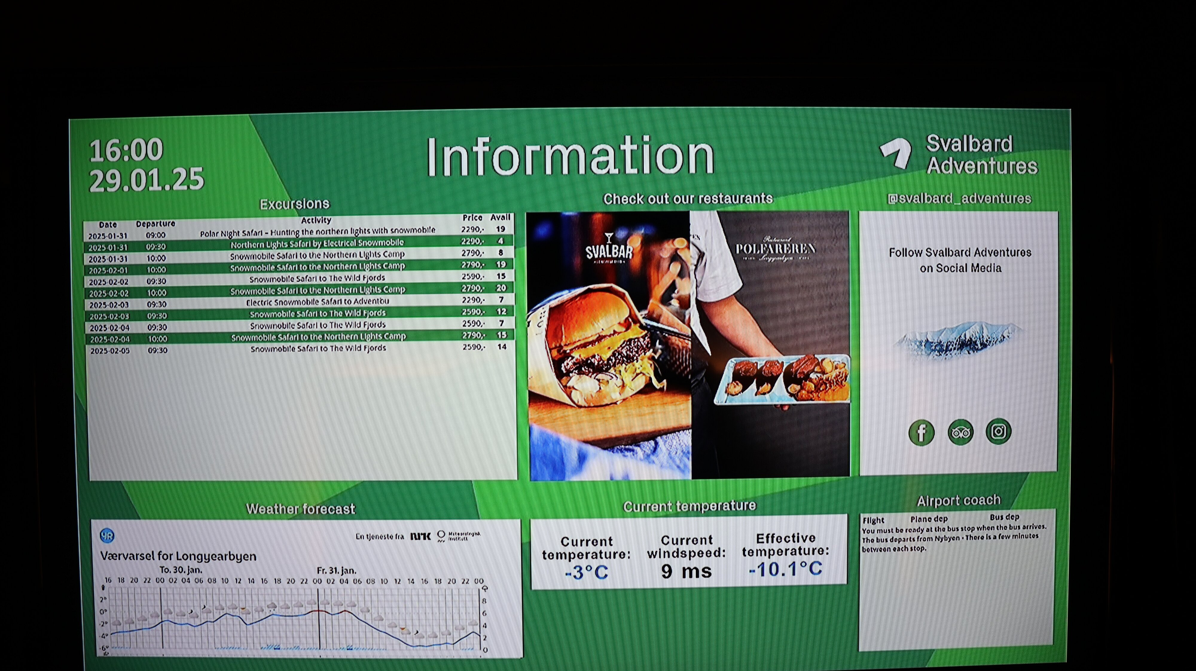 Ich hätte mir doch die Kamera an den Sitzplatz holen sollen, das Wetter während der Flieger zur Startposition fuhr war ziemlich gut, nun dann eben keine Fotos. Der Flug war ruhig, auch die angekündigte holprige Landung blieb aus. Wenn ich es richtig verstanden hatte waren wir sogar ein paar Minuten vor der Zeit gelandet, aber was spielt das hier noch für eine Rolle. Ich fühle mich jetzt schon von der restlichen Welt zeitlich entkoppelt, wie auf einem anderen Planeten. Man sieht, dass es ziemlich stürmt, loser Schnee flitzt in irrwitziger Geschwindigkeit über das Rollfeld. Es dauert etwas bis die Treppe angelegt wurde und die Passagiere aussteigen können.