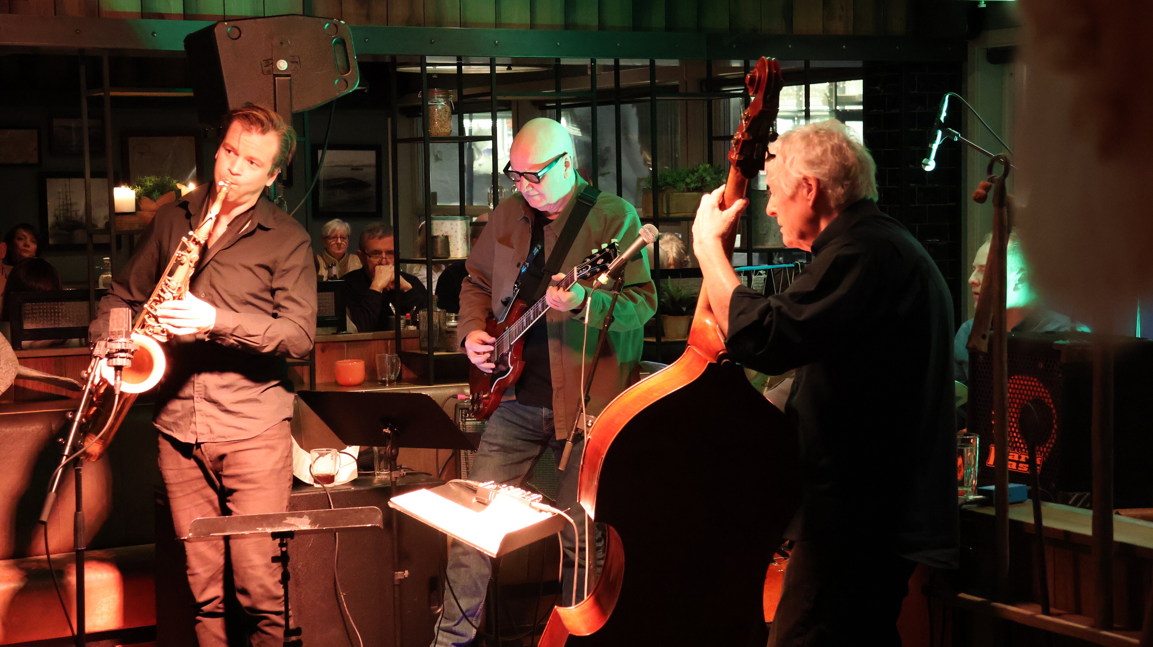 Welch ein Zufall, ich ergattere genau den gleichen Platz den ich vor ein paar Jahren hier schon mal hatte, ein sehr schöner Ledersessel, ich muss mir allerdings ein Kissen unterlegen, damit ich nicht ganz zu tief sitze, also kein Platz für kleinere Leute. Ich bestelle Essen und Getränk an der Theke und platze mich. Das Konzert beginnt mit ein paar Minuten Verspätung, das bestellte Essen kommt flott, es mundet perfekt, das Getränk sowieso.