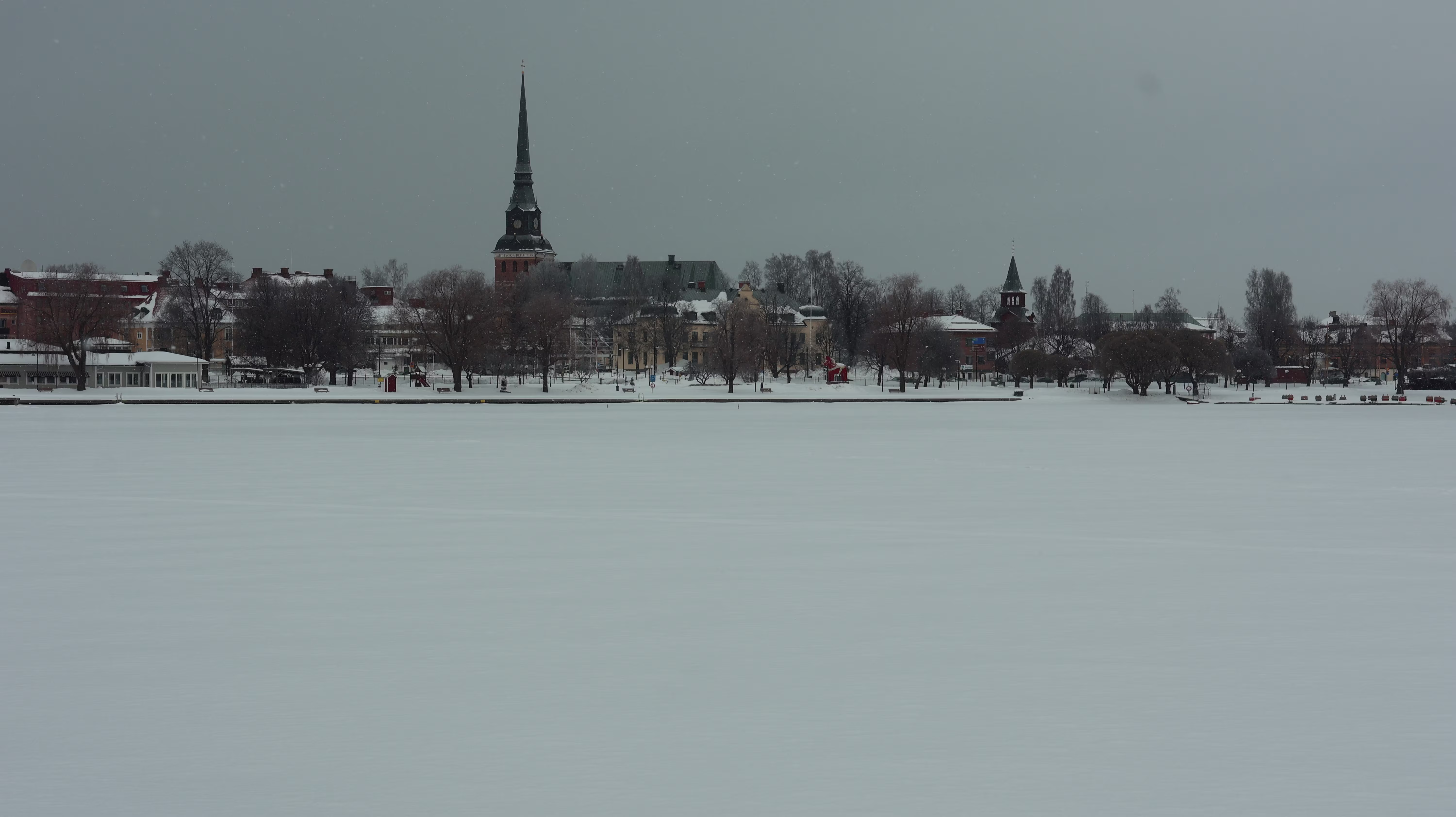 Der erste Zwischenstopp in Mora steht fest auf dem Programm. Es hat recht viel Schnee und es ist kälter als so manch anderes Mal. Es dauert etwas, bis man den See endlich sieht und ich bin erstaunt, da ist ja gar niemand. Man sieht nur jede Menge Schnee auf dem See. Nun, ich parke trotzdem, es stehen nur sehr wenige Fahrzeuge auf dem großen Parkplatz.