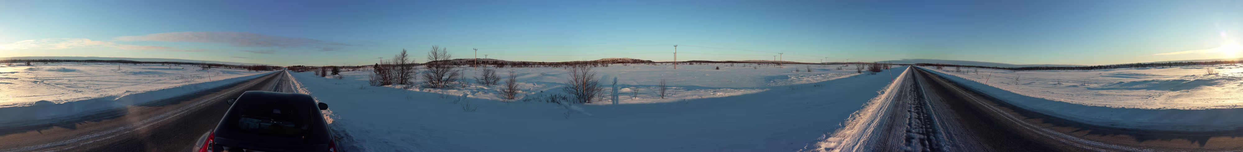 Problem ist auf der Strecke von Karesuando bis nach Kilpisjärvi gibt es sehr wenige Möglichkeiten mal anzuhalten und wenn dann doch an wenig attraktiven Stellen. Noch im ersten Abschnitt kommt ein ewig kerzengerader Abschnitt. Da halte ich einfach mitten auf der Straße, auf der Gegenseite kommt niemand, von hinten auch nicht. Das erste Panorama ist im Kasten.