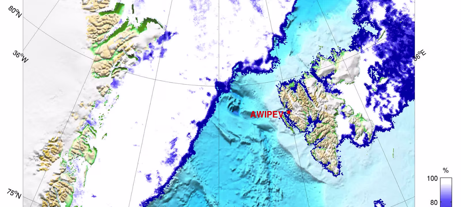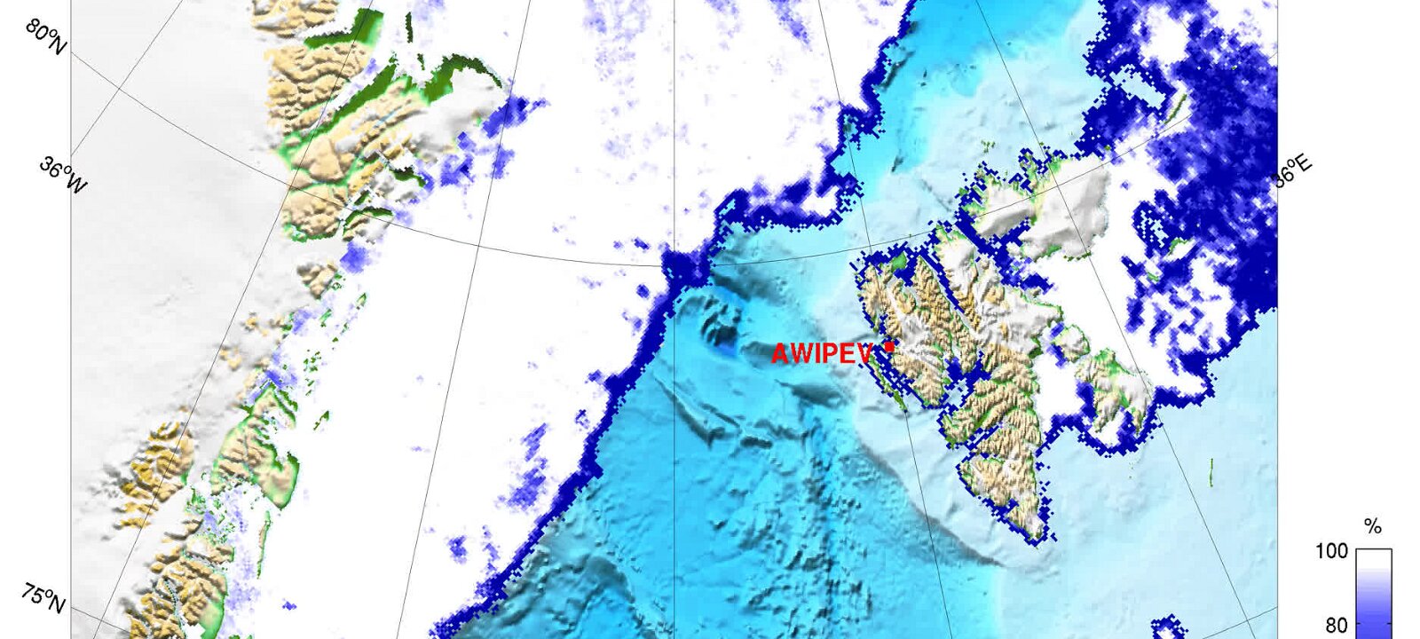 Die Eiskonzentration, abgeleitet aus Daten des passiven Mikrowellenradiometers AMSR2 gib an, wieviel Prozent der Oberfläche innerhalb eines Gebietes mit Meereis bebedeckt ist. Diese Information wird farbkodiert und halbtransparent auf unseren Karten angezeigt und ist in einer Auflösung von 3 km vorhanden. Weitere Informationen zum Eiskonzentrationsprodukt siehe: