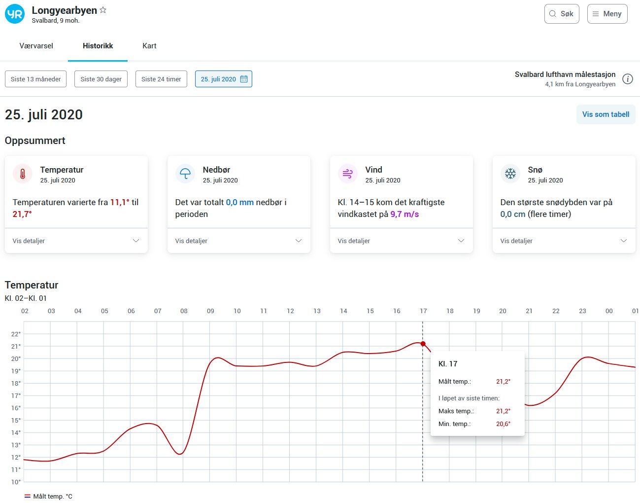 Det har aldri blitt målt høyere temperatur på Spitsbergen. Lørdag kveld er gradestokken på 21,7 grader.
