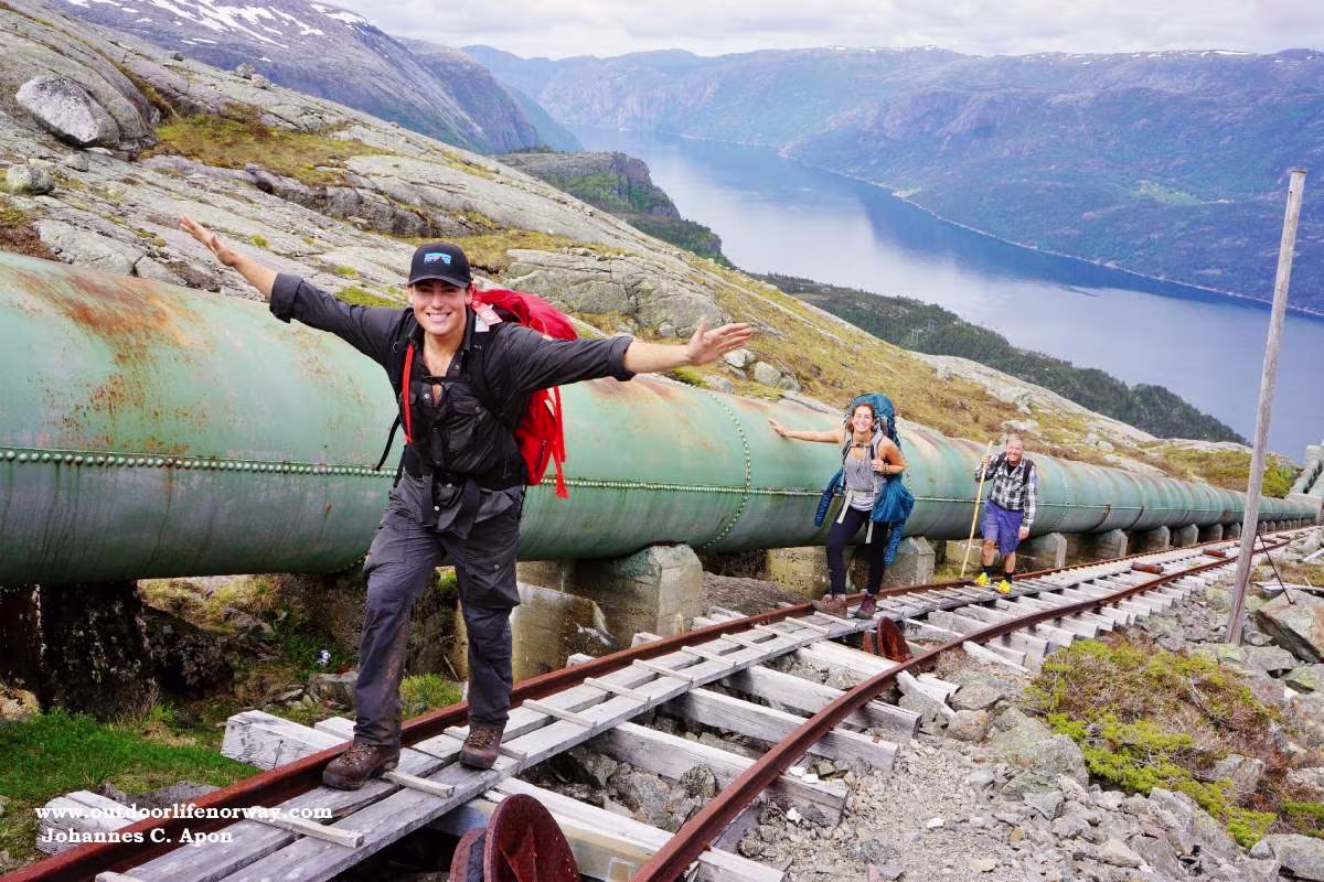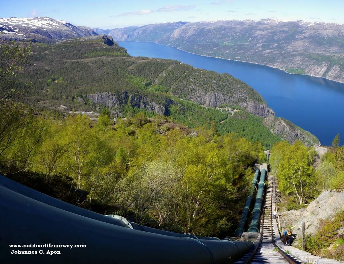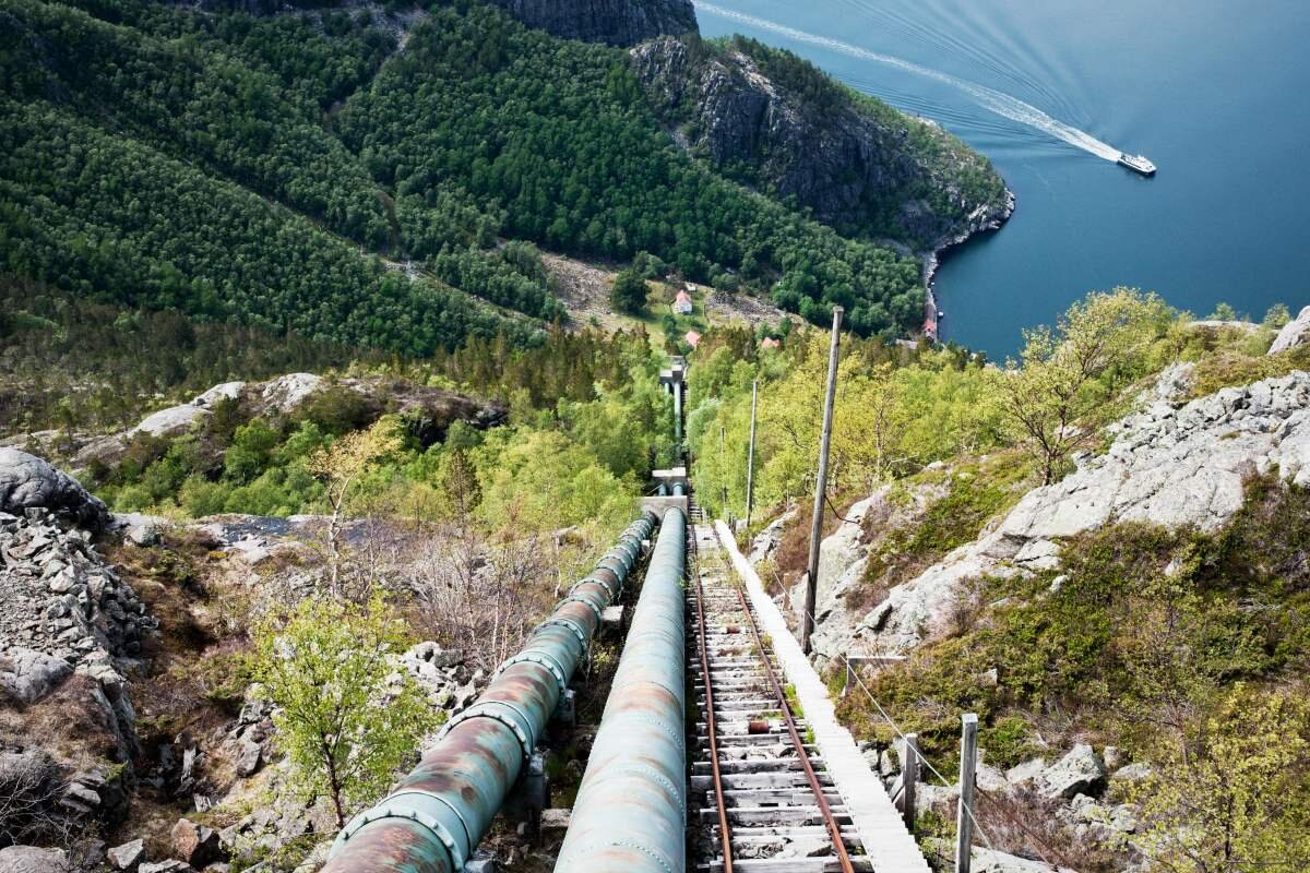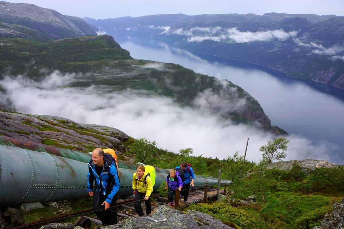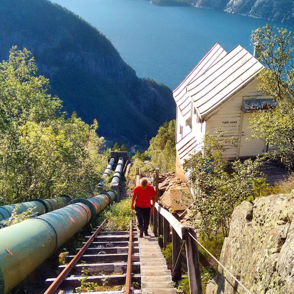 Die Flørlitreppe hat 4444 Stufen und ist einer der längsten Holztreppen der Welt. Die Treppe folgt den Schleusen, die das Wasserwerk am Ufer versorgten. Sie endet am Terneyass Damm. Weit über den Baumspitzen haben Sie eine fantastische Aussicht auf den Lysefjord und in Richtung Preikestolen.