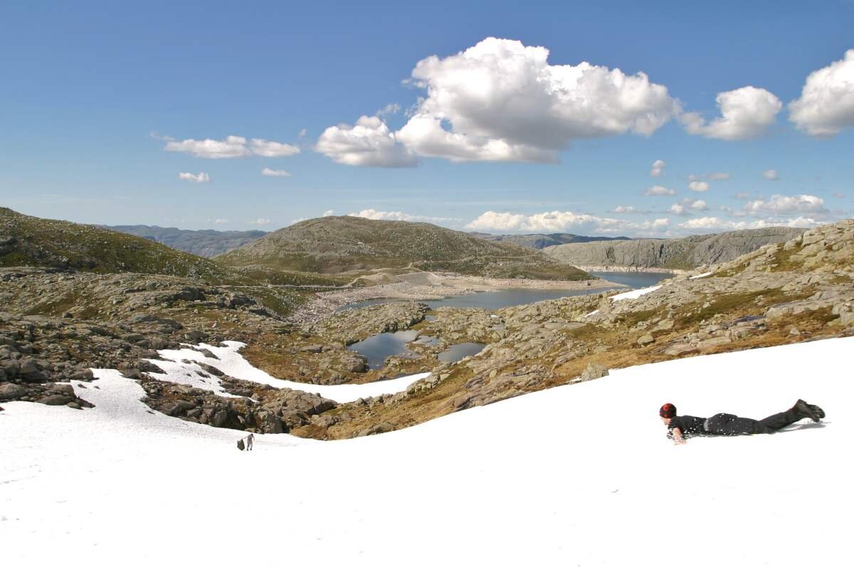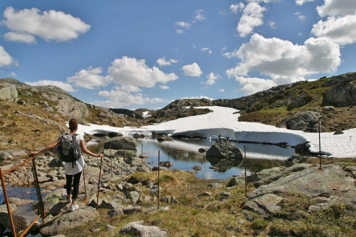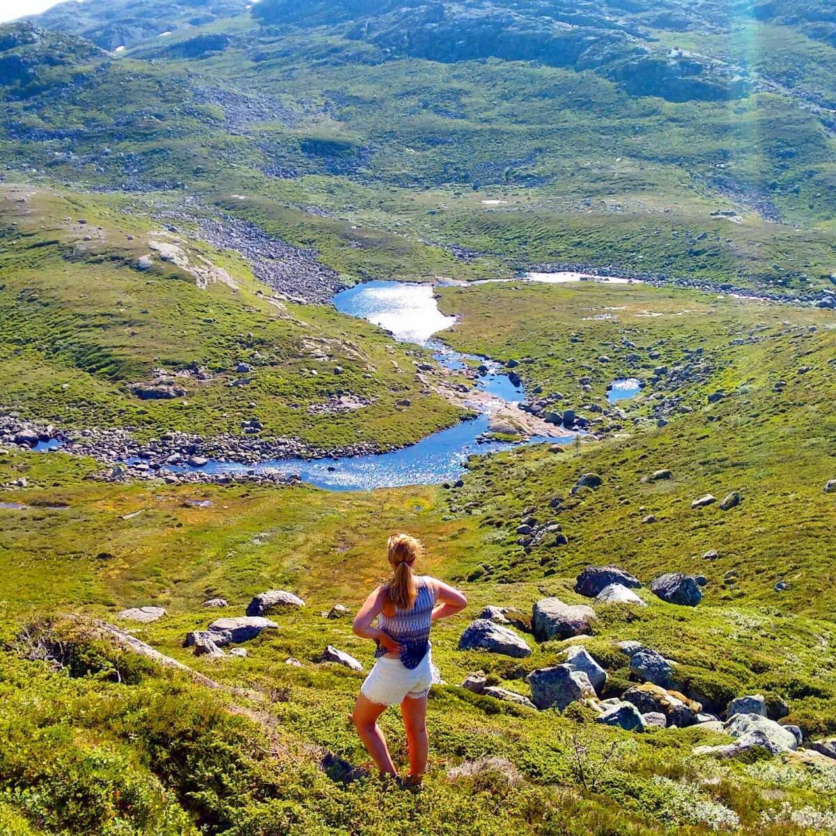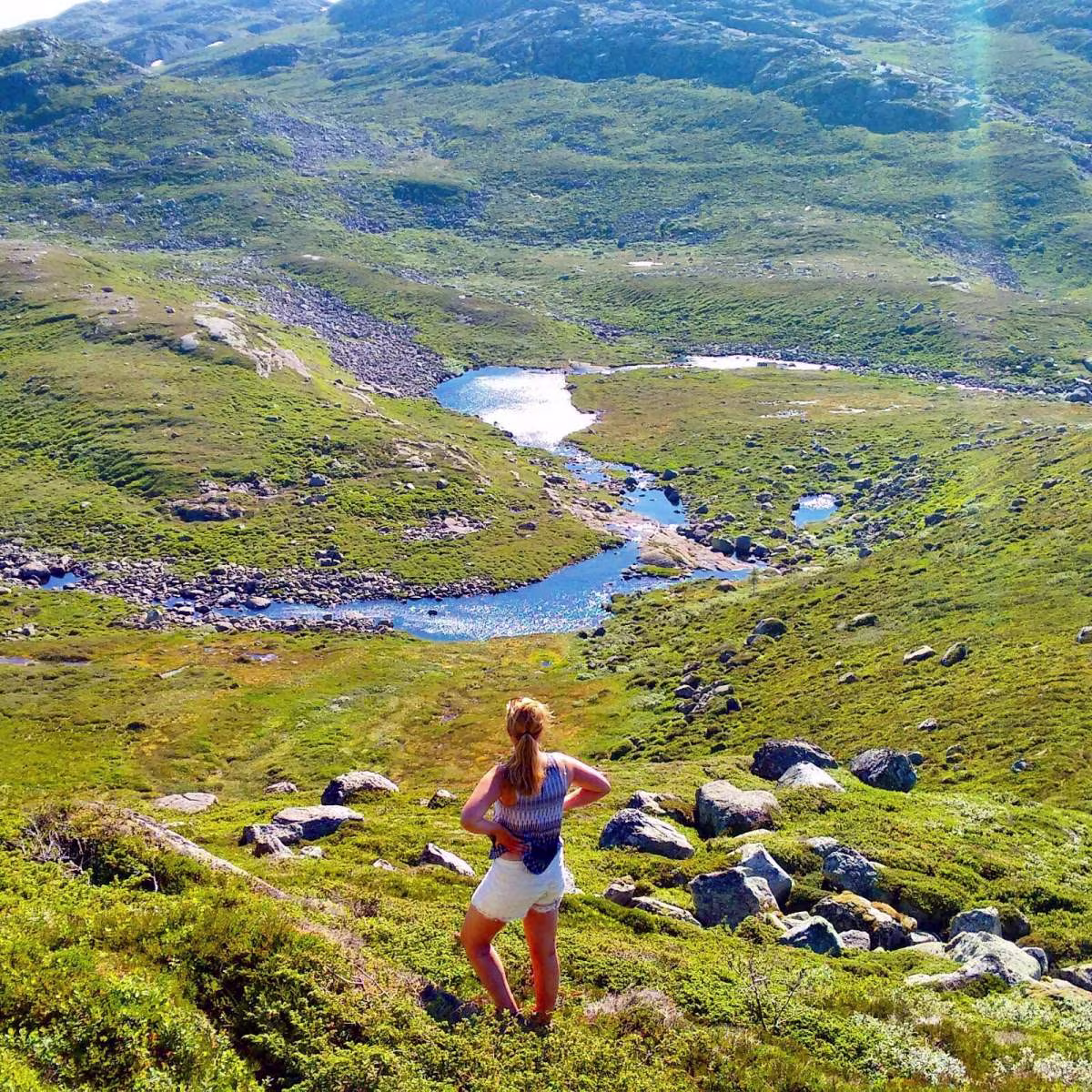 Vom Gipfel aus sehen Sie ein Lichtsignal, welches den Weg zeigt. Auf dem Weg nach unten sehen Sie einige große Felsen, die von Zauberern errichtet wurden. Der Weg geht eine Weile nur über Felsen bevor Sie auf einen Schotterweg kommen. Danach geht es weiter nach unten und Sie überqueren die Flørliåa-Brücke.