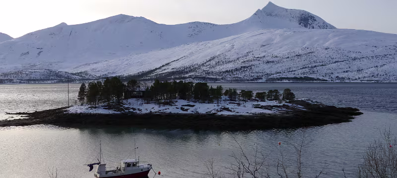 Das „Hero“-Bild zeigt eine kleine Insel im Forsahavet Teil des Efjorden am 29.01.2020.