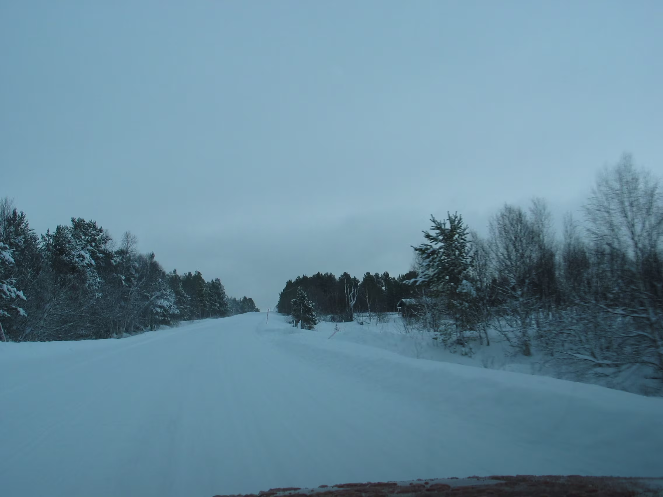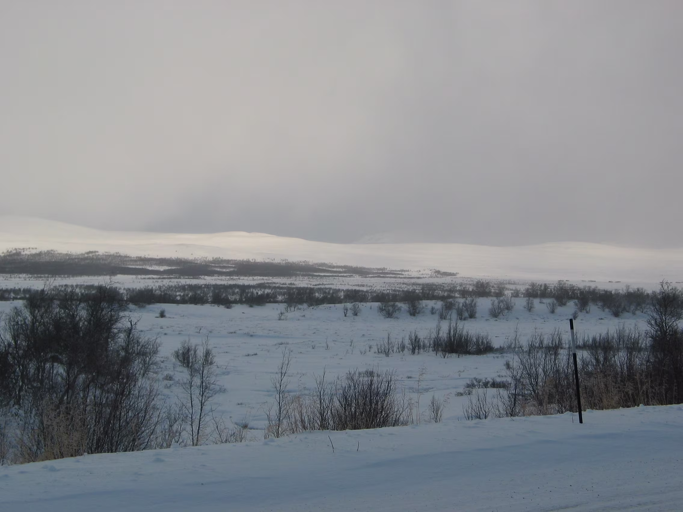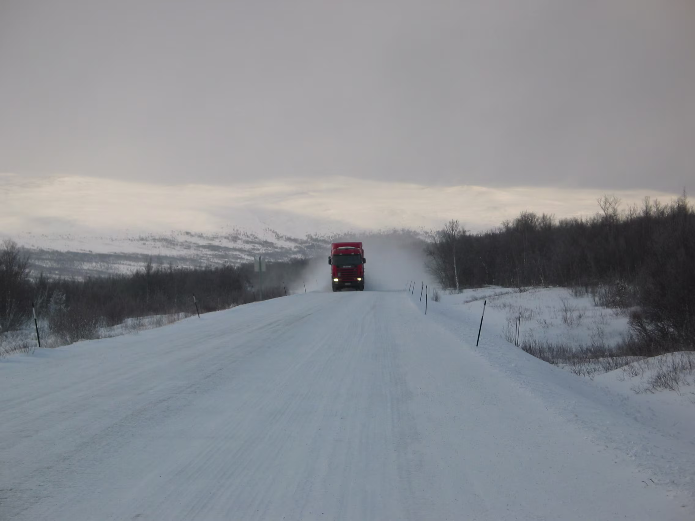 Zunächst verlief alles smooth. Dann stieg die Straße doch stetig etwas an und vermehrt kamen einem Fahrzeuge entgegen die total verschneit waren. Nicht lange danach war die Straße dann auch immer mehr verschneit, genauso wie die Landschaft drumherum. Ab Dombås ging es dann richtig aufwärts, zunächst auf eine weite Hochebene mit guten Sichtverhältnissen.