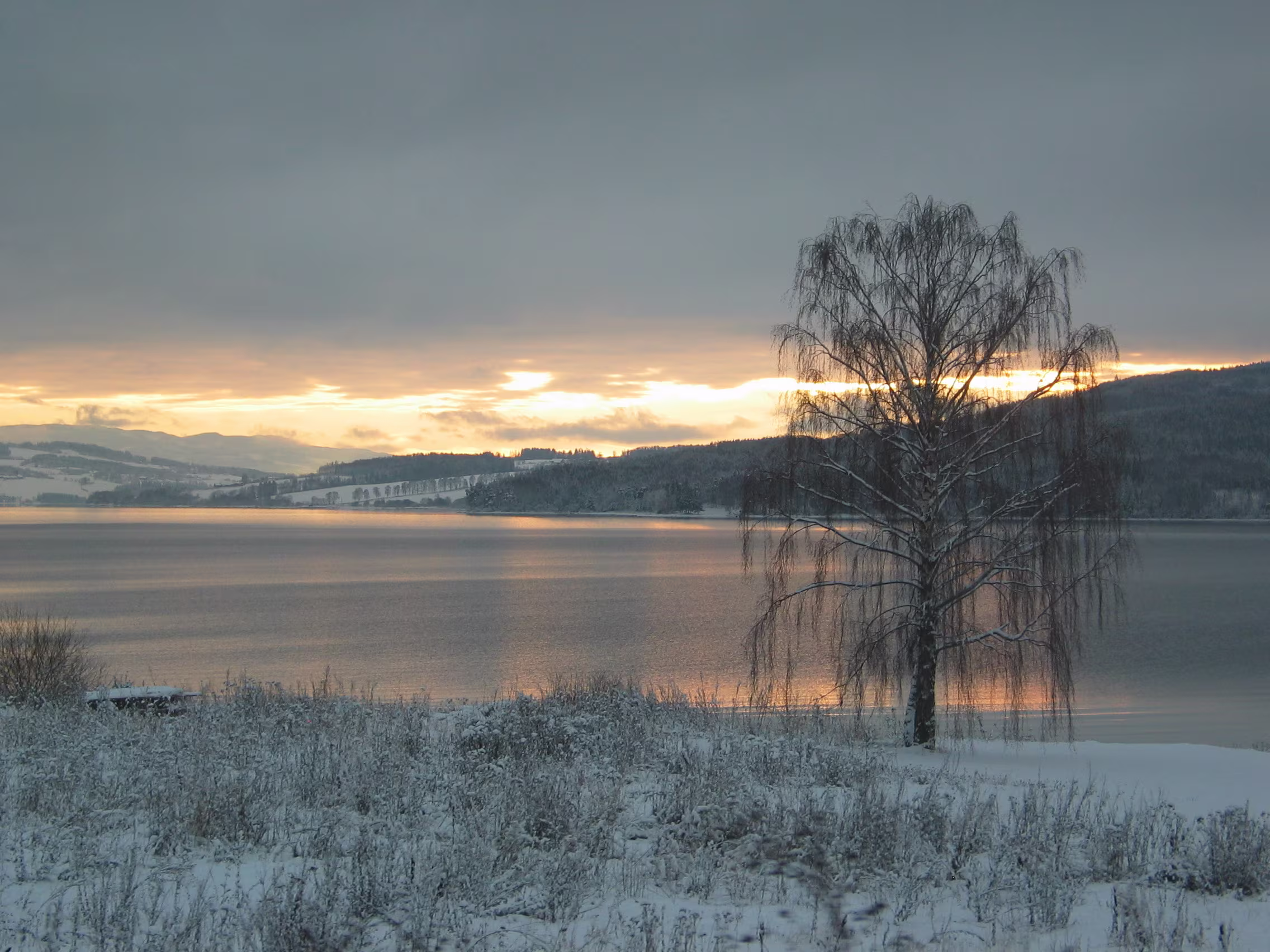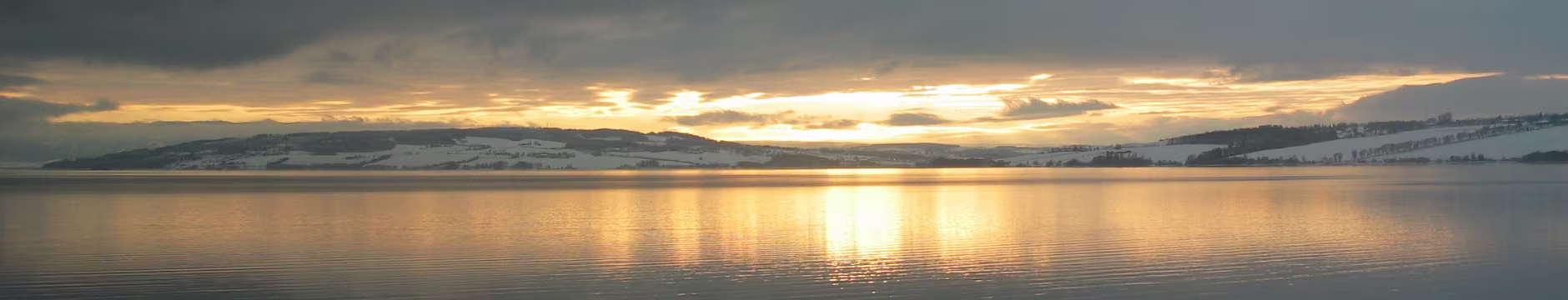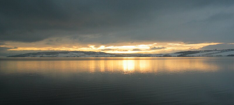 Direkt am Rande des Mjøsa-See kommt der Zug zum Stillstand. Die Sicht ist frei und gibt den Blick frei auf die langsam untergehende Sonne die sich teilweise durch die dichten dunklen Wolken bahn bricht. Fasziniernd.