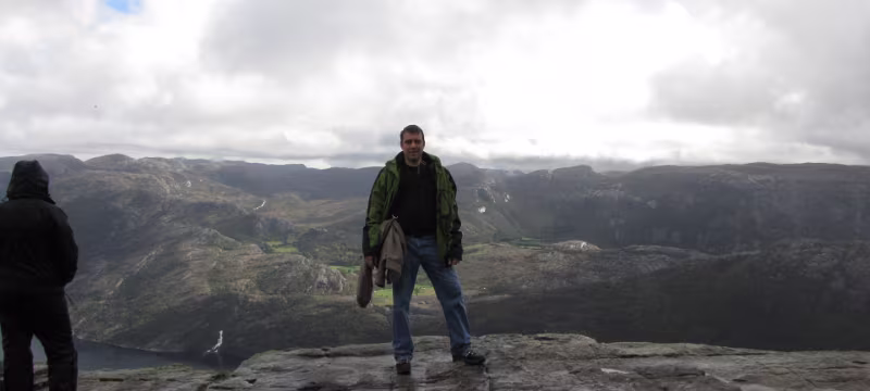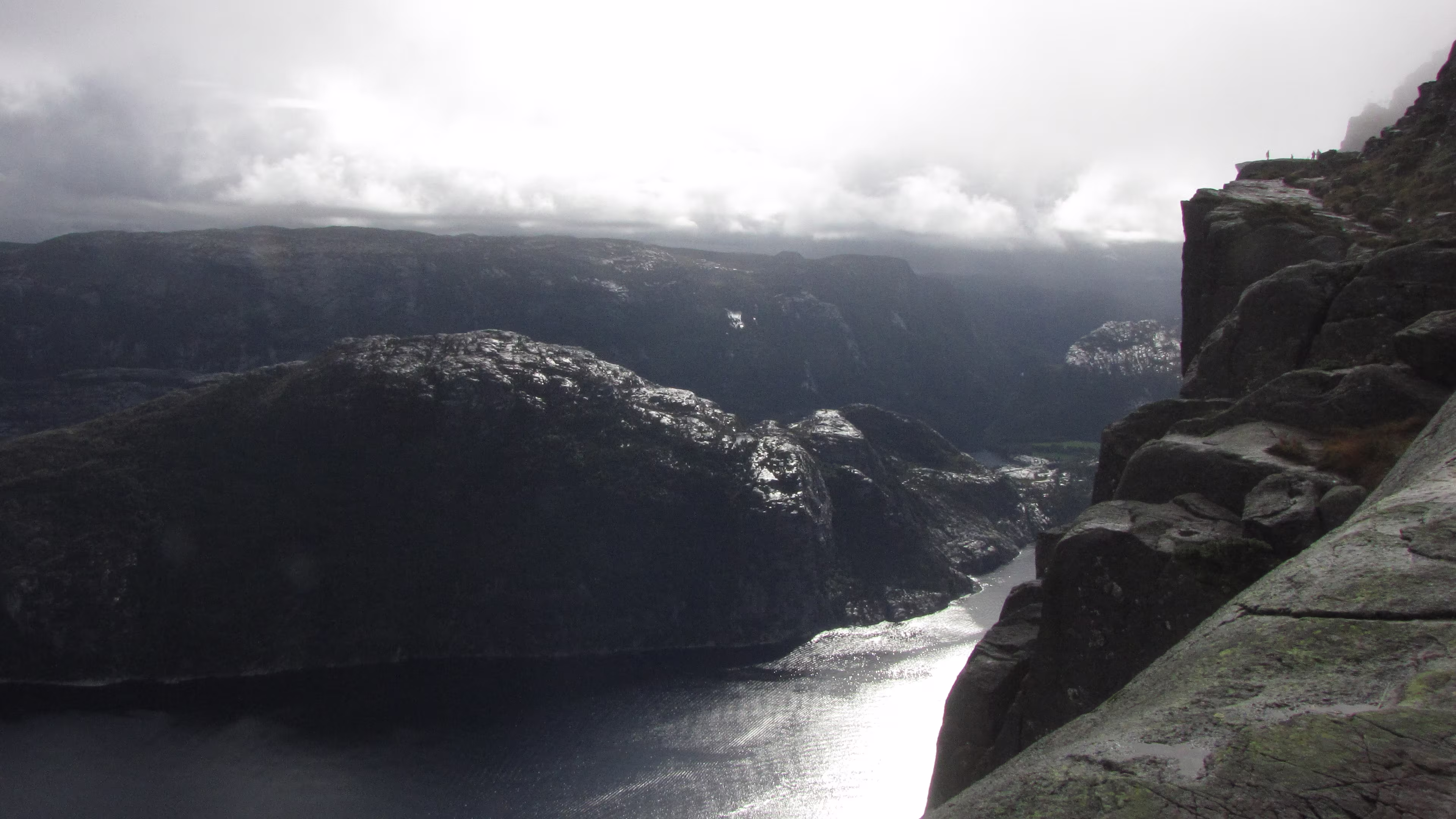 An der Preikestolen fjellstue begann der Aufstieg gegen 11:15, ohne Regen, bei Bewölkung. Nach einer ganzen Weile kam dann der erste Schauer, relativ kurz und leicht, also nicht so tragisch. Aber der Weg hat es in sich. Teilweise gleicht er einem kleinen Bach. Unterwegs tröpfelt es immer mal wieder kurz, nix ernstes. Dann endlich die letzen Meter, es klart auf und die Sonne kommt etwas durch. Einfach grandios. Es ist windstill, man kan sich ohne Probleme bis an die Kante wagen, an der geht es 600 m in die Tiefe, kein Geländer, keine Sicherung, nichts. Einige sitzen mit baumelnden Beinen auf der Felskante. 😎