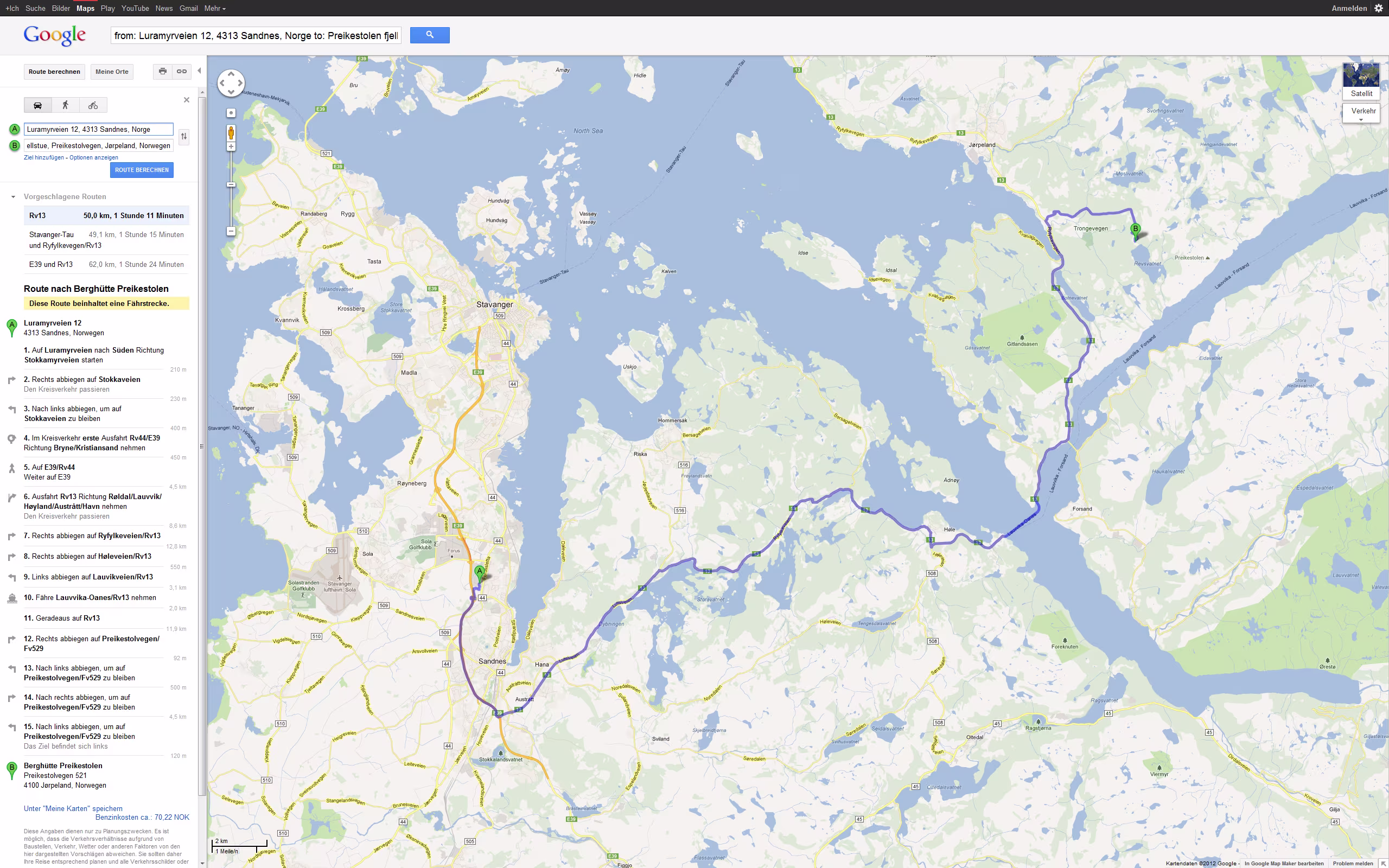 Tour Planung 04 - Luramyrveien 12, 4313 Sandnes, Norwegen nach Berghütte Preikestolen - Google Maps - Opera Di 18.09.2012 – Sandnes - Preikestolen Größere Kartenansicht
