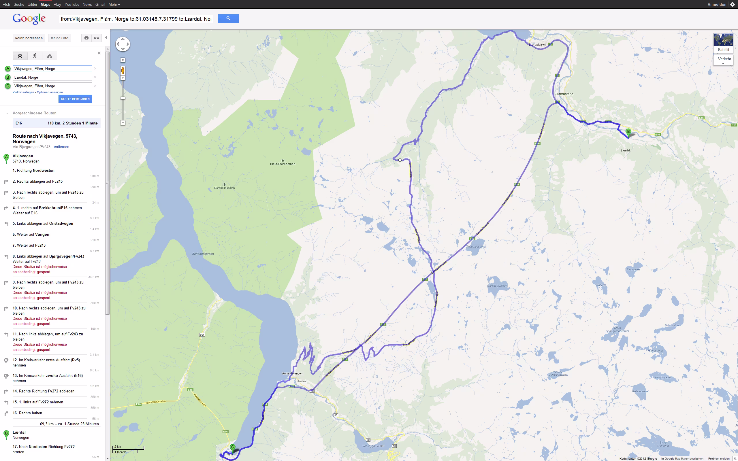 Tour Planung 07 - Vikjavegen, 5743, Norwegen nach Vikjavegen, 5743, Norwegen - Google Maps - Opera Do 20.09.2012 – Flåm - Lærdal - Flåm Größere Kartenansicht