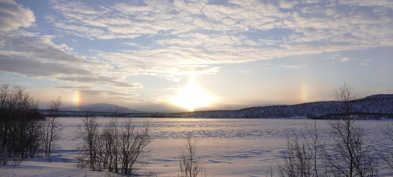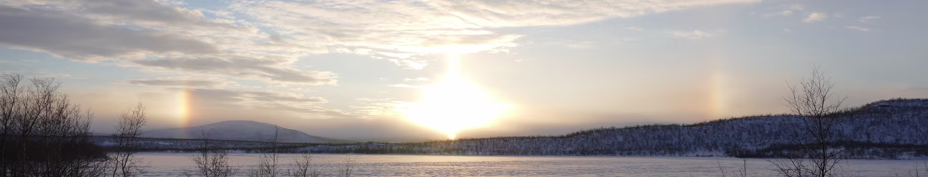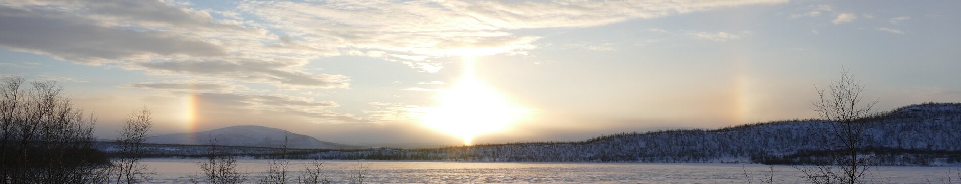 Abfahrt Koskullskulle um 08:30, das Thermometer am Skogshotell zeigte -16 °C, das Auto war leicht beschneit, aber es schneite nicht mehr. Sehr wenig Verkehr auf der Straße in Richtung Suomi. Je näher die Grenze zu Suomi rückte desto offener wurde das Gelände, man konnte sogar richtige kleine Berge ausmachen. Nach kurzer Fahrt in Suomi kam dann plötzlich die Sonne zum Vorschein, mit ganz irren Effekten, nämlich links und rechts der Sonne waren zwei weitere helle Lichter zu sehen. Keine Ahnung wie sich dieses Phänomen nennt [Anmerkung später: es sind Nebensonnen (norsk: Bisol; english: sun dogs)], aber es war einfach grandios anzusehen. Und da sehr wenig Verkehr herrschte war es auch kein Problem auch mal mitten auf der Strecke einfach rechts anzuhalten, zum Foto-Shooting. Das Thermometer war zwischenzeitlich auf -18 °C gefallen, ohne Jacke, nur mit Schal und Handschuhen wurde es schon nach wenigen Minuten verdammt frisch um die Nase. 😎