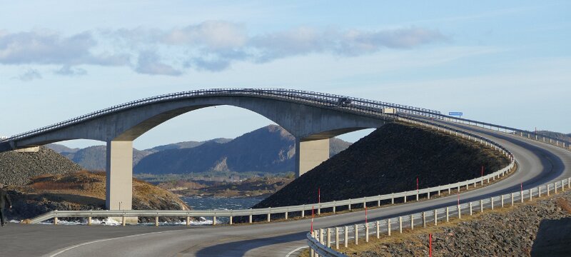 Ziel war heute primär Kristiansund. Aber ich fuhr nicht direkt dorthin, sondern zunächst nach Molde. Zwar hatte ich ein genügend großes Zeitpolster, aber ich fuhr dann doch nach einem kurzen Stopp in Molde weiter in Richtung Küstenstraße (Atlanterhavsvegen). Im Ort Bud habe ich mir das Ergan Kystfort (ein restauriertes deutsches Kriegsfort) angesehen. Von dort dann immer weiter die Küstenstraße entlang. Sie besteht aus 12 Brücken.