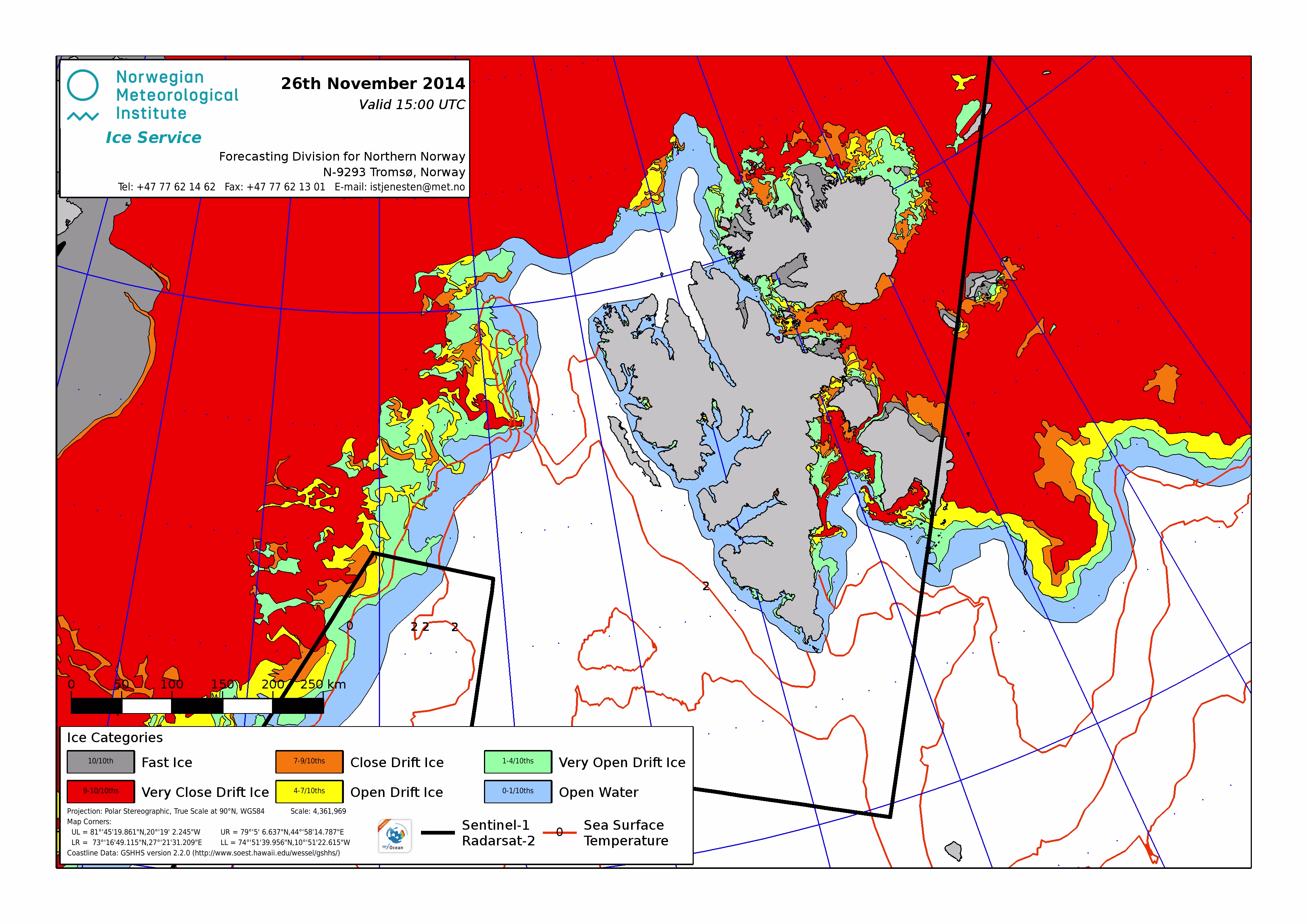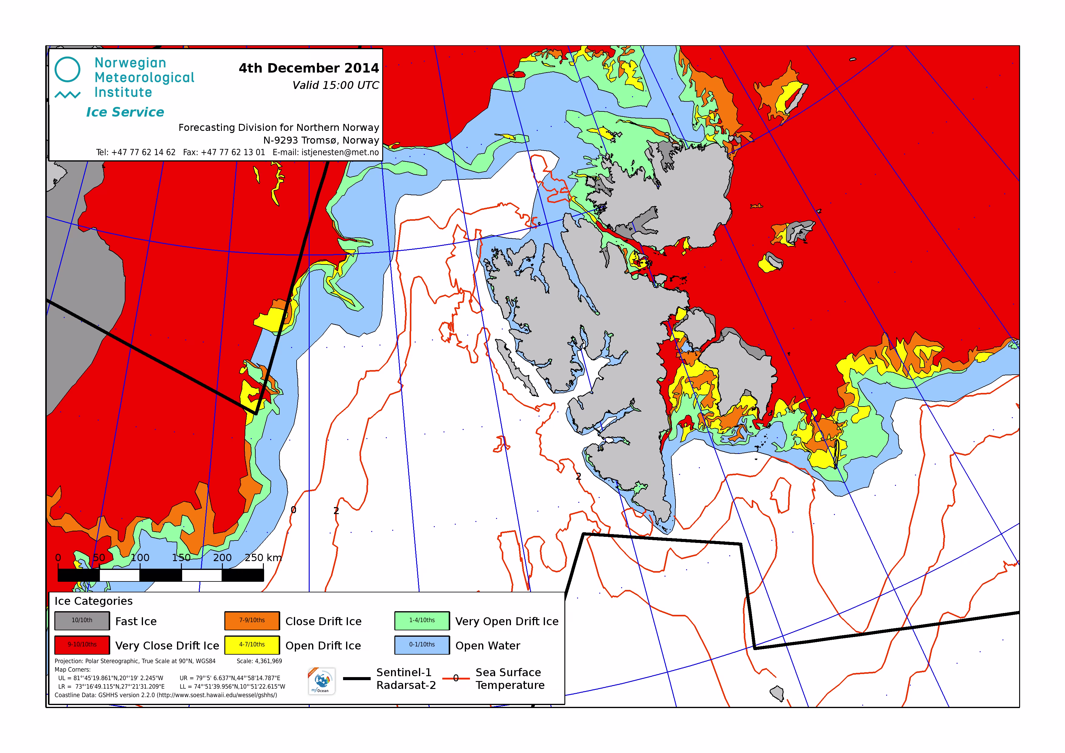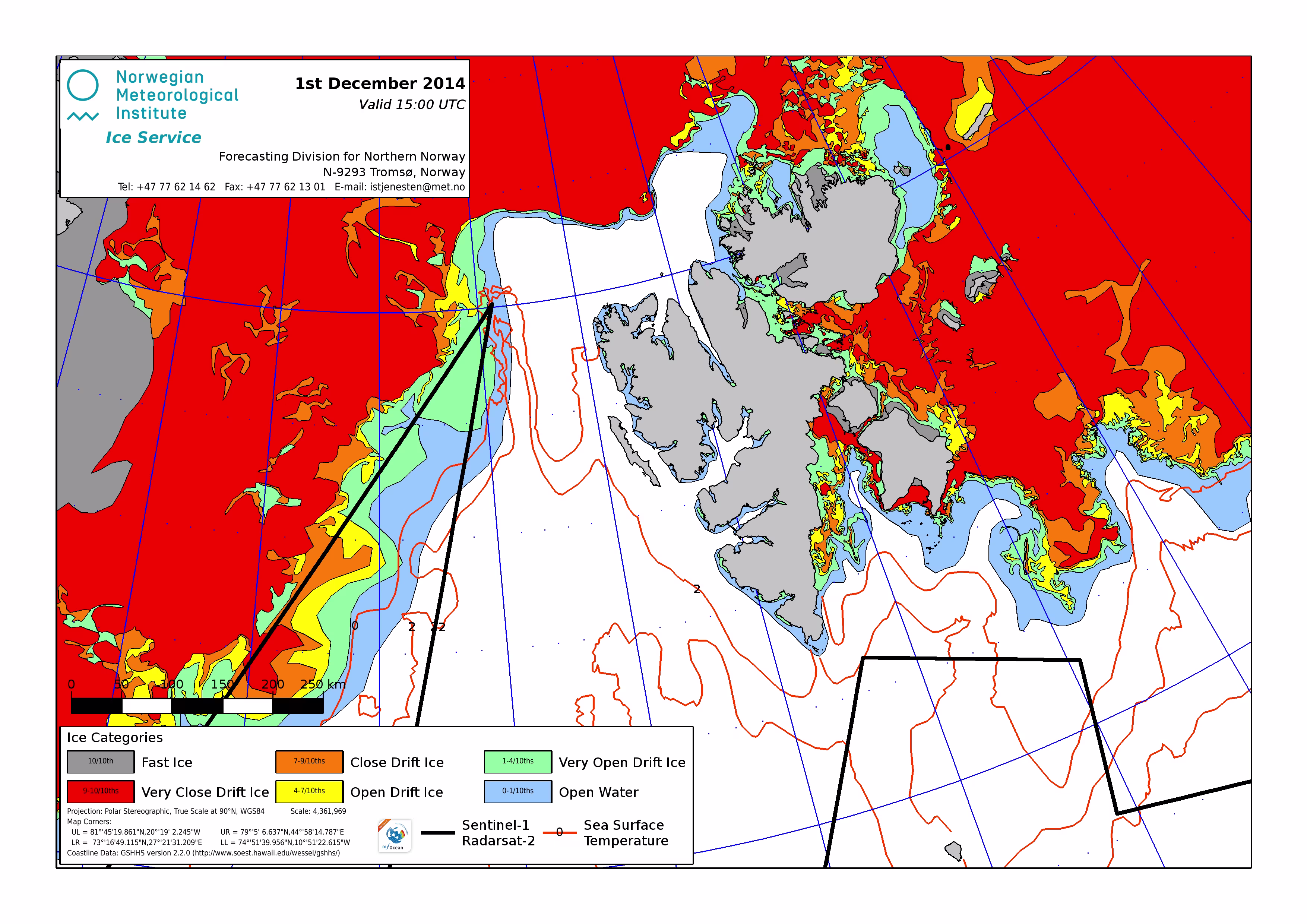 Hier werden immer die gerade aktuell gültigen Eiskarten angezeigt. Üblicherweise werden die Karten so gegen 16 Uhr aktualisiert. Allerdings nur an Werktagen, nicht am Wochenende oder (norwegischen) Feiertagen. Die Originaldaten hole ich mir von einem FTP-Server ftp.met.no, dort liegen die gewünschten Karten unterhalb von /projects/icecharts.