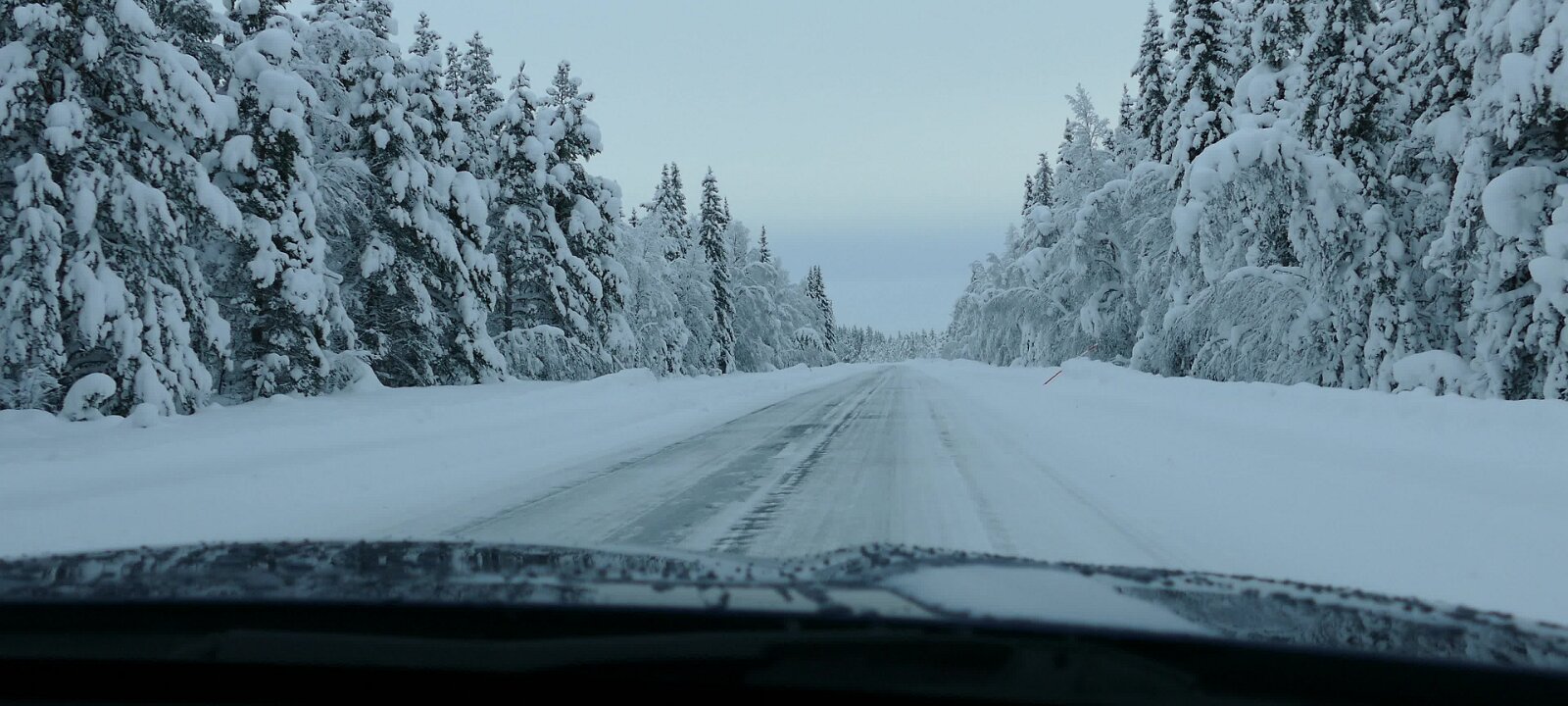 Die Abkürzung um Arvidsjaur hatte ich wieder verpasst, denn die Straßenschilder waren komplett zugeschneit. Aber es gab noch eine zweite Alternative. Die war dann auch gut lesbar ausgeschildert, das Navi weigerte sich eine Alternative zu berechnen. Vorher hatte ich einen Bus gesehen, aber keinen gewöhnlichen sondern einen Test-Bus, teilweise abgeklebt damit man Marke und Model nicht sieht. Ab der Abfahrt Slagnäs fuhr dann ein Test-LKW vor mir her, der eine gigantische Schneewolke hinter sich her zog. Das machte natürlich gar keinen Spaß. Also bei der nächsten Gelegenheit angehalten und erst mal etwas Zeit vergehen lassen. Es lag enorm viel Schnee, die Straße war komplett mit Schnee bedeckt.