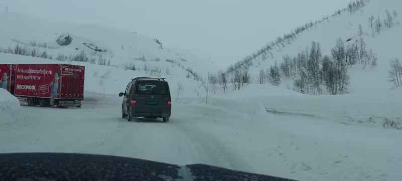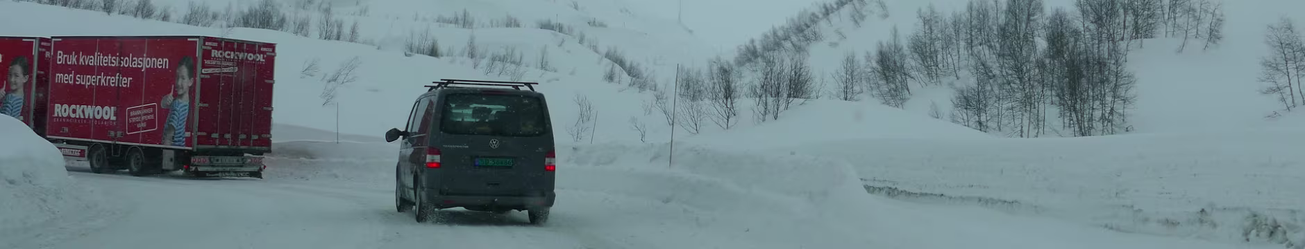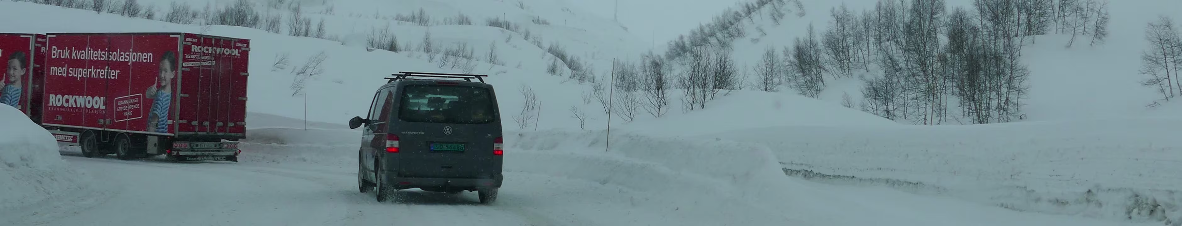 Schneller als erwartet ist man auch schon durch den Røldalstunnel durch. Es geht prima vorwärts, dann plötzlich ist es da, das Kolonnekjøring. Was natürlich auch erst mal bedeutet: Warten, bis die andere Kolonne durch ist. Es kommt ein Arbeiter der „Veivakt“ und meinte es könnte 30 bis 45 Minuten dauern. Dann inspiziert er die Kiste und fragt, ob ich gute Winterreifen hätte. Wenn ich jetzt cool gewesen wäre hätte ich gesagt ich habe noch die Sommerschlappen drauf, aber zum Scherzen war mir nicht zu Mute.