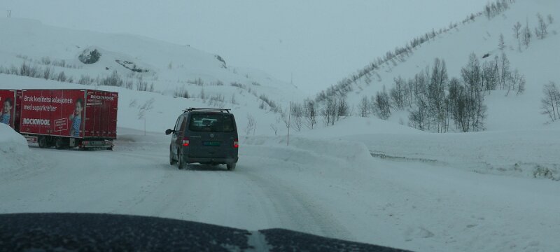 Ich habe die Gelegenheit genutzt und mal die Radkästen vom Schnee befreit, da scheuerten nämlich schon wieder die Reifen dran, wenn mal eine Bodenwelle kam. Dann hatte ich lange überlegt, ob ich jetzt die Schneeketten aufziehen soll, eine bessere Gelegenheit gibt es sicher nicht. Hier stehe ich auf gerader Strecke, es schneit nur, aber stürmt nicht. Ich habe die Ketten nicht aufgezogen, frei nach dem Motto, wird schon schief gehen.